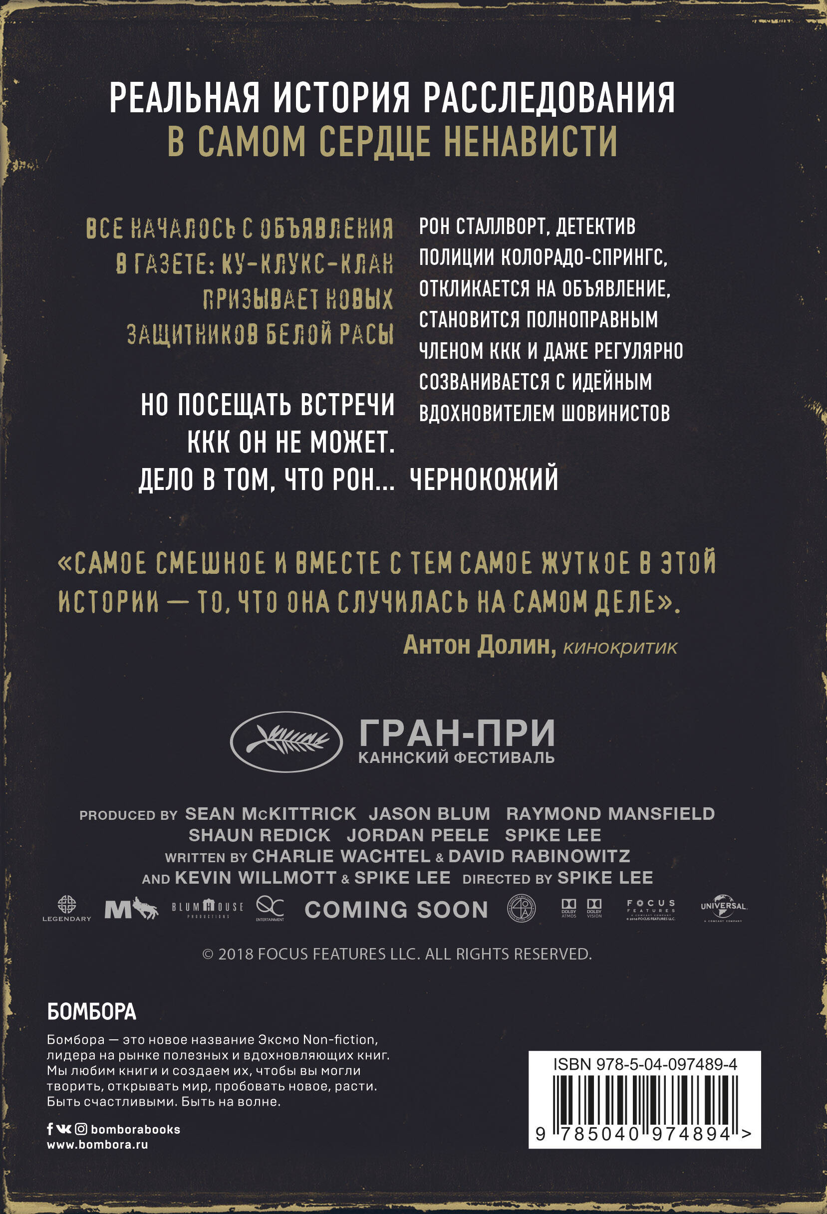 РЕАЛЬНАЯ ИСТОРИЯ, КОТОРАЯ ЛЕГЛА В ОСНОВУ СЦЕНАРИЯ КИНОКАРТИНЫ СПАЙКА ЛИ ГРАН-ПРИ КАННСКОГО КИНОФЕСТИВАЛЯ Все началось с объявления в газете: Ку-клукс-клан призывает новых защитников белой расы. Рон Сталлворт, детектив полиции Колорадо-Спрингс откликается на объявление, становится полноправным членом ККК и даже регулярно созванивается с идейным вдохновителем клана. Но посещать встречи ККК он не может. Дело в том, что Рон - афроамериканец. «Самое смешное, и вместе с тем, самое жуткое в этой истории - то, что она случилась на самом деле». Антон Долин, кинокритик ОБ АВТОРЕ: Рон Сталлворт - тридцать два года работал следователем под прикрытием в отделе по борьбе с наркотиками и организованной преступностью в четырех штатах США. Начал свою карьеру в Колорадо-Спрингс, где стал первым чернокожим детективом в истории департамента.| Издательство | ООО "Издательство "Эксмо" |