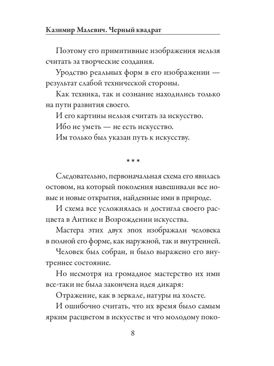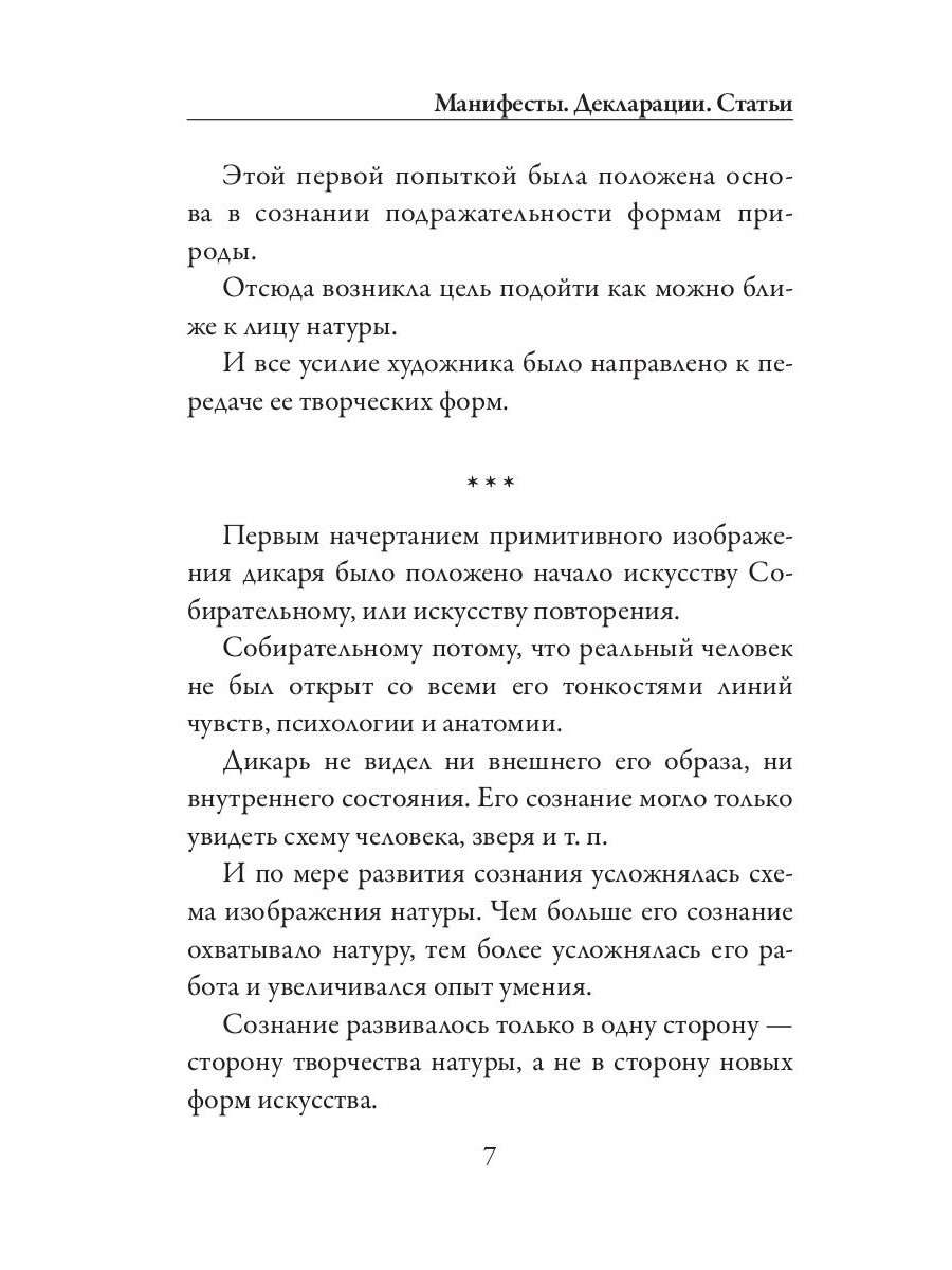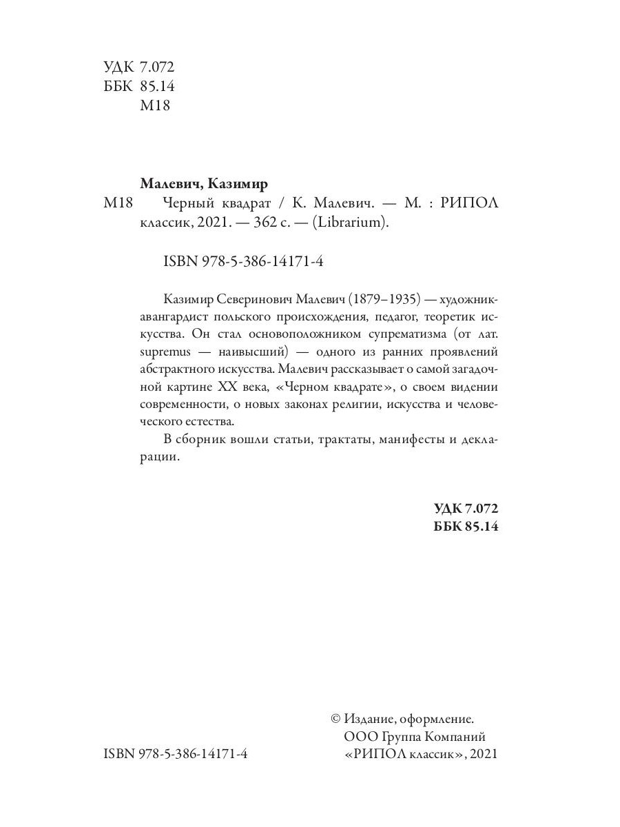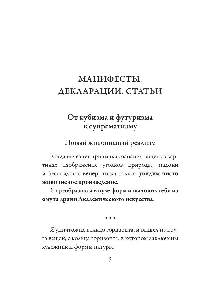 Казимир Северинович Малевич (1879-1935) - художник-авангардист польского происхождения, педагог, теоретик искусства. Он стал основоположником супрематизма (от лат. Supremus - наивысший) - одного из ранних проявлений абстрактного искусства, основанного на комбинациях разноцветных плоскостей простейших геометрических очертаний. В сборник вошли статьи К. С. Малевича об искусстве, а также манифесты и декларации.| Издательство | Рипол Классик |