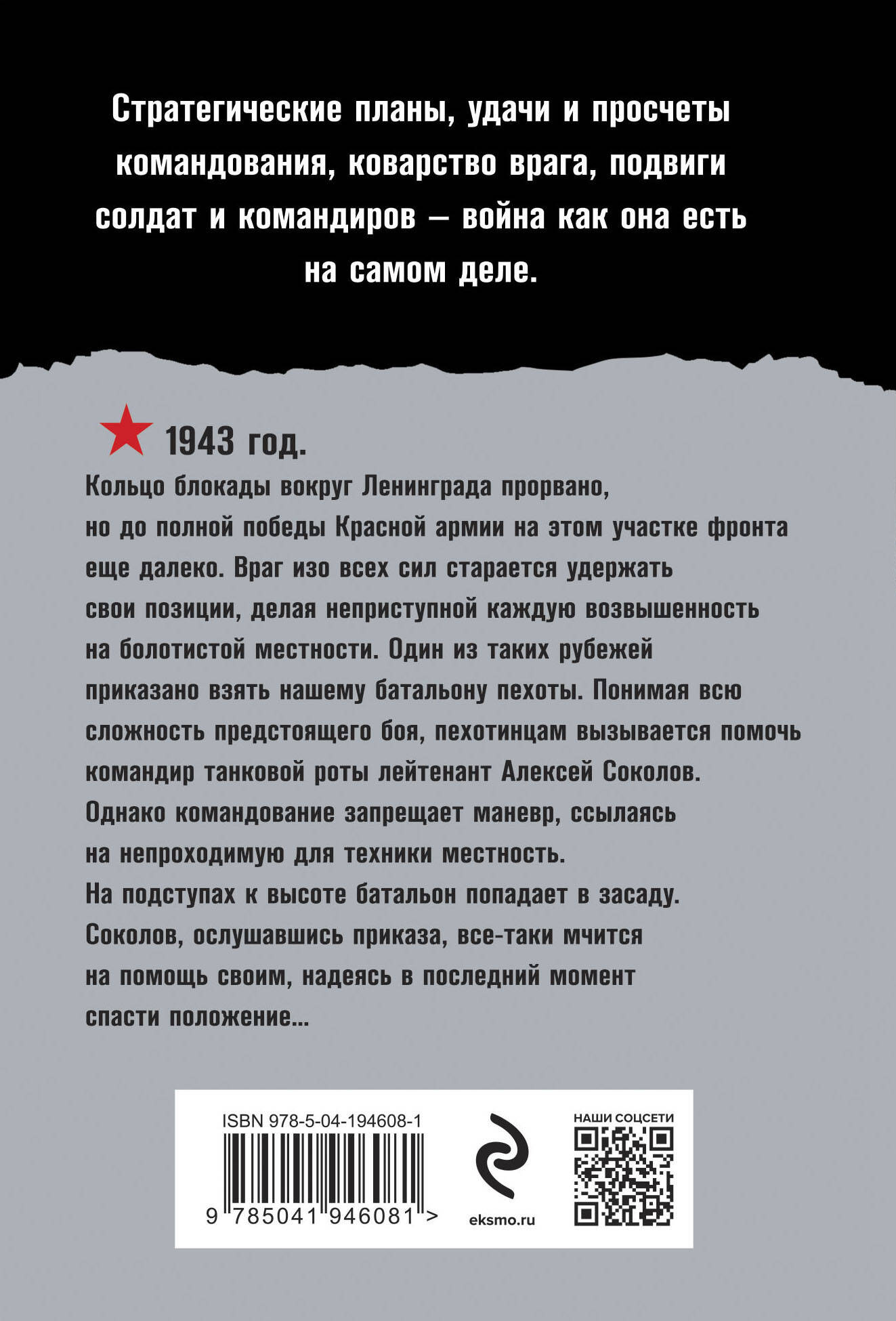 1943 год. Кольцо блокады вокруг Ленинграда прорвано, но до полной победы Красной Армии на этом участке фронта еще далеко. Враг изо всех сил старается удержать свои позиции, делая неприступной каждую возвышенность на болотистой местности. Один из таких рубежей приказано взять нашему батальону пехоты. Понимая всю сложность предстоящего боя, пехотинцам вызывается помочь командир танковой роты лейтенант Алексей Соколов. Однако командование запрещает маневр, ссылаясь на непроходимую для техники местность. На подступах к высоте батальон попадает в засаду. Соколов, ослушавшись приказа, все-таки мчится на помощь своим, надеясь в последний момент спасти положение… Стратегические планы, удачи и просчеты командования, коварство врага, подвиги солдат и командиров - война, как она есть на самом деле. Подлинность событий нашей недавней истории.| Издательство | ООО "Издательство "Эксмо" |