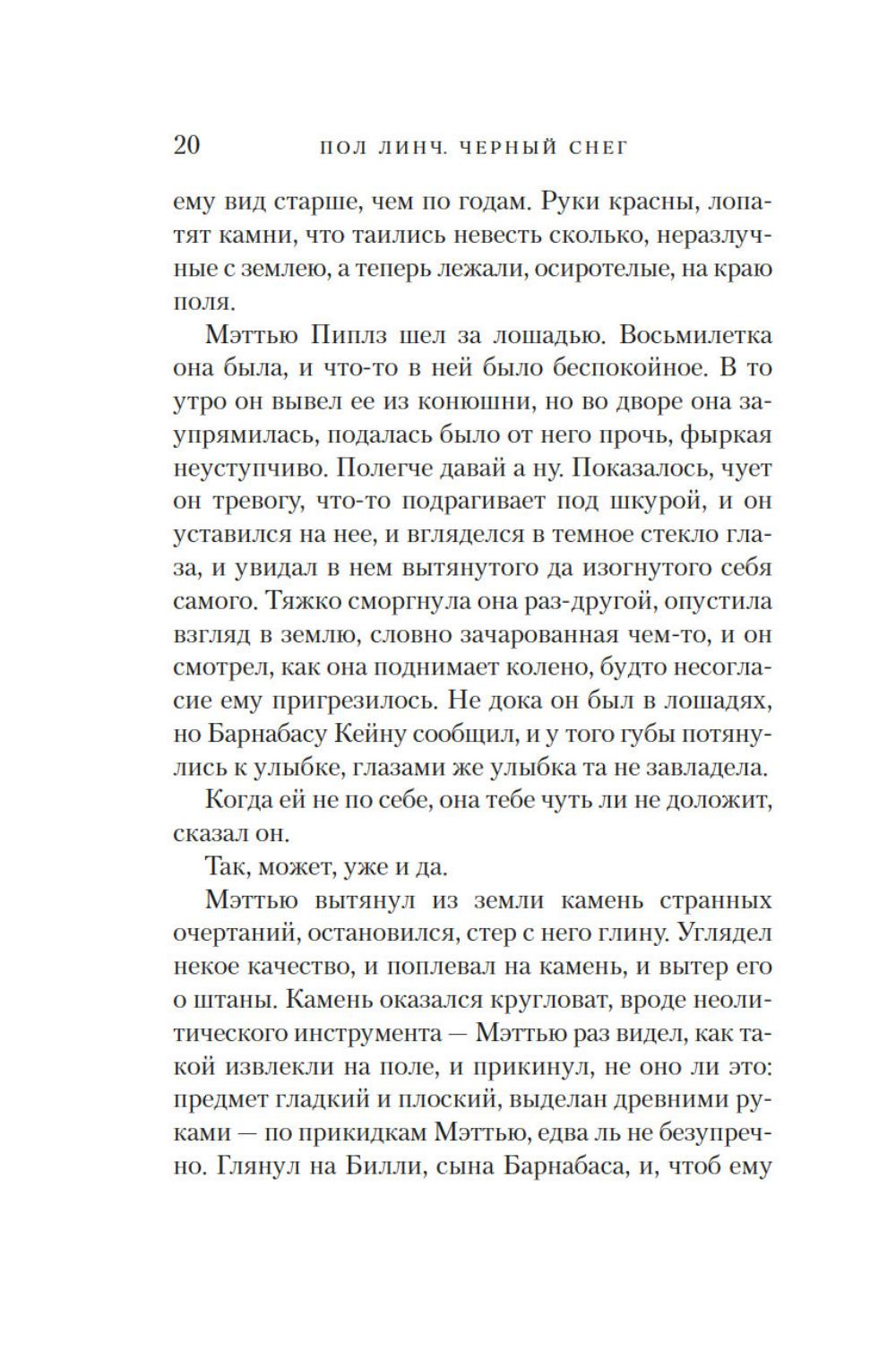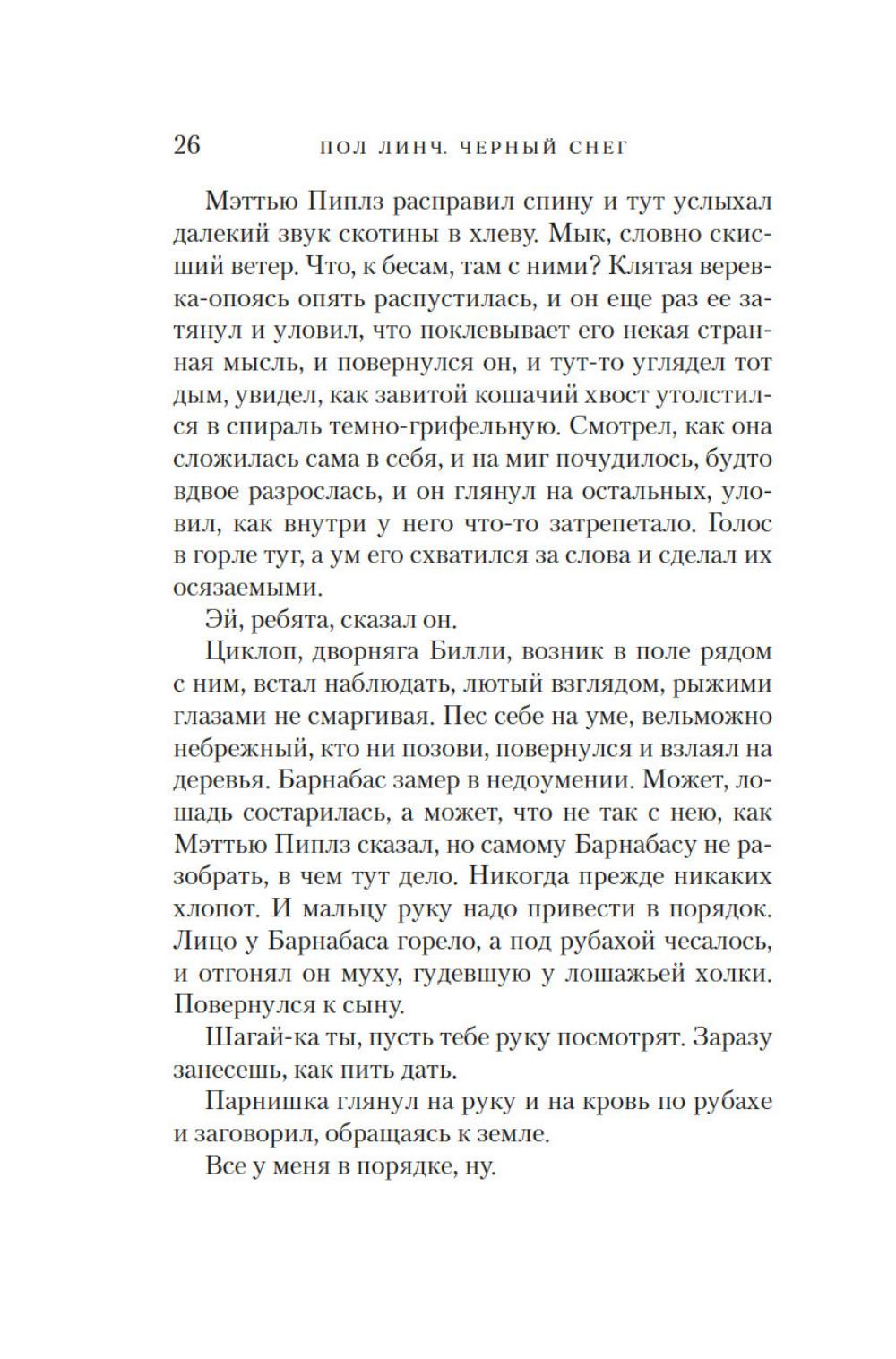 Впервые на русском - экзистенциальная пастораль современного ирландского классика Пола Линча, лауреата Букеровской премии 2023 года за роман «Песнь пророка», который уже называют «ирландским «1984»» и «новым «Рассказом служанки»». «Черный снег» - это «блестящая, гипнотическая книга» (Филипп Майер, автор романа «Сын»), рядом с которой «большая часть современной прозы ощутимо меркнет» (National Public Radio). Весной 1945-го Мэттью Пиплз вбегает в охваченный пожаром хлев, чтобы вывести запертый там скот, - и погибает. Хозяин фермы Барнабас Кейн, сокрушенный смертью друга, пытается восстанавливать хозяйство, но его жена Эскра задыхается от неуверенности в завтрашнем дне, а сын Билли тяготится под гнетом страшной тайны...| Издательство | Азбука |