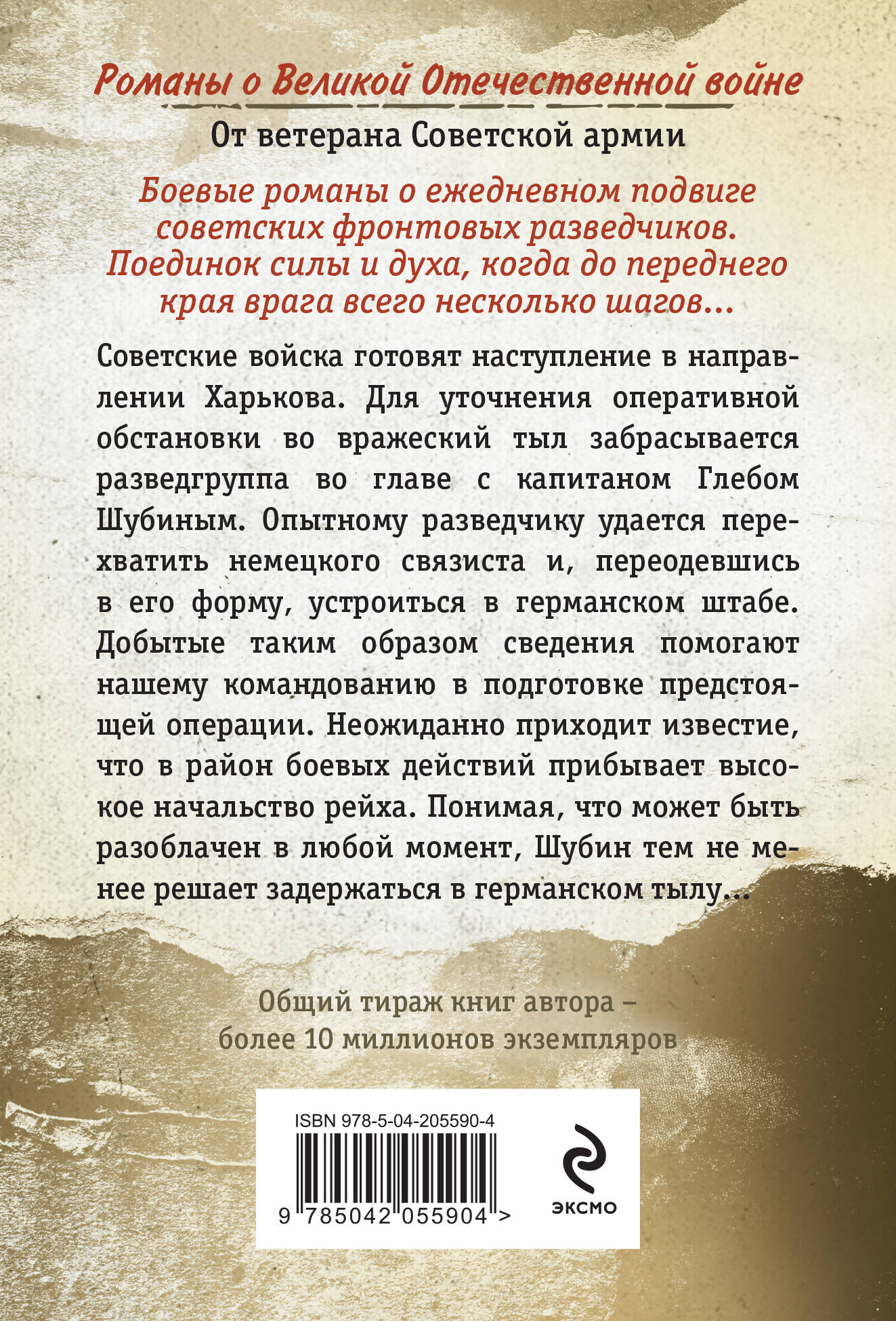 Боевые романы о ежедневном подвиге советских фронтовых разведчиков. Поединок силы и духа, когда до переднего края врага всего несколько шагов. Подробности жестоких боев, о которых не рассказывают даже ветераны - участники тех событий. Советские войска готовят наступление в направлении Харькова. Для уточнения оперативной обстановки во вражеский тыл забрасывается разведгруппа во главе с капитаном Глебом Шубиным. Опытному разведчику удается перехватить немецкого связиста и, переодевшись в его форму, устроиться в германском штабе. Добытые таким образом сведения помогают нашему командованию в подготовке предстоящей операции. Неожиданно приходит известие, что в район боевых действий прибывает высокое начальство рейха. Понимая, что может быть разоблачен в любой момент, Шубин тем не менее решает задержаться в германском тылу… Общий тираж книг автора - более 10 миллионов экземпляров.| Издательство | ООО "Издательство "Эксмо" |
