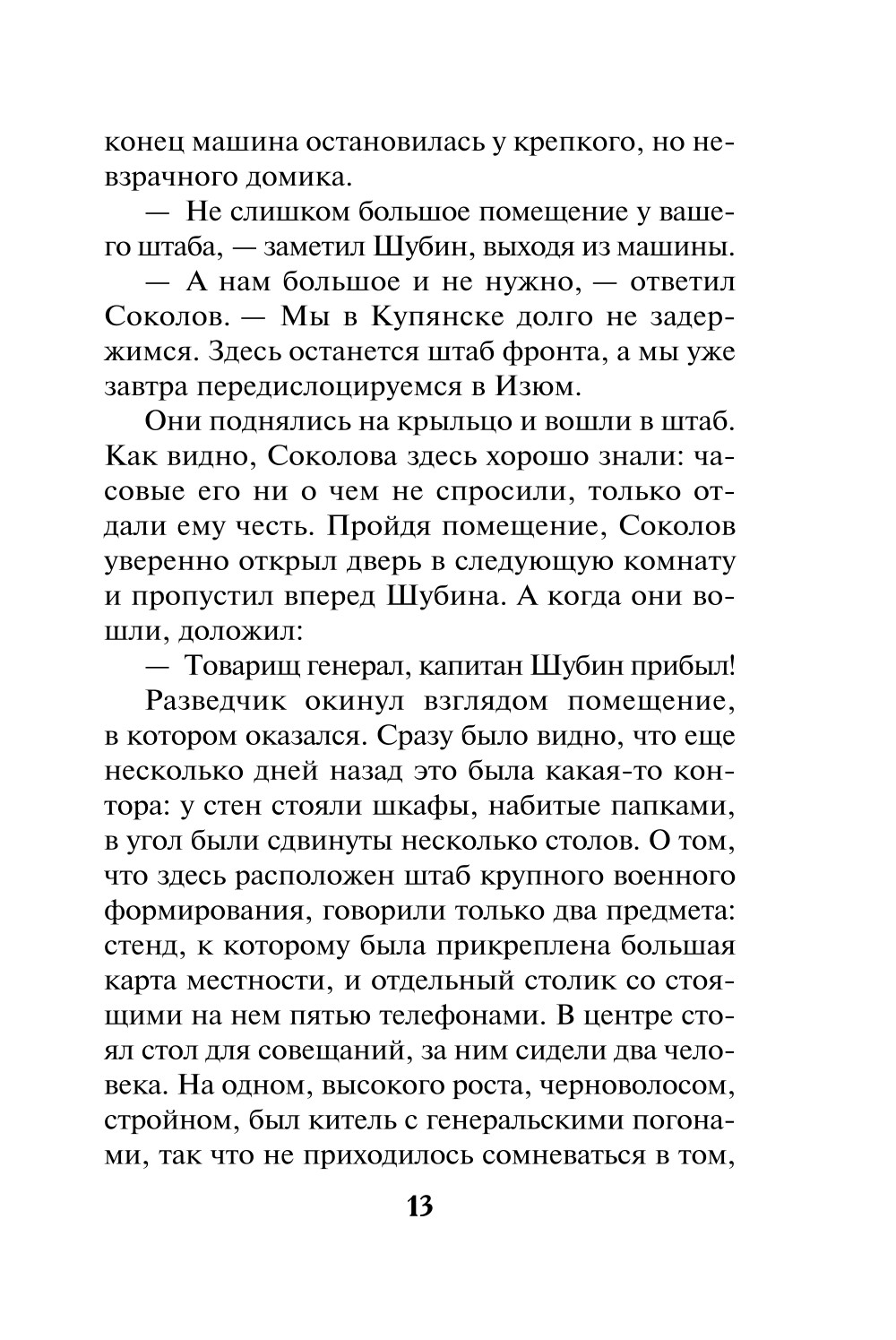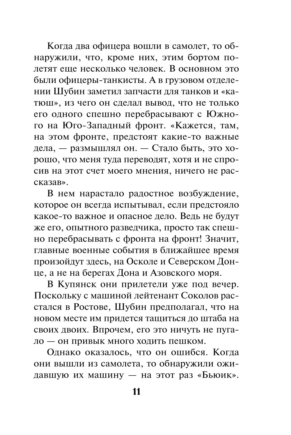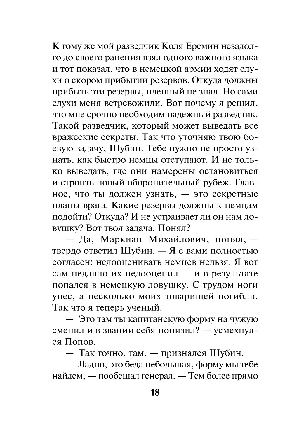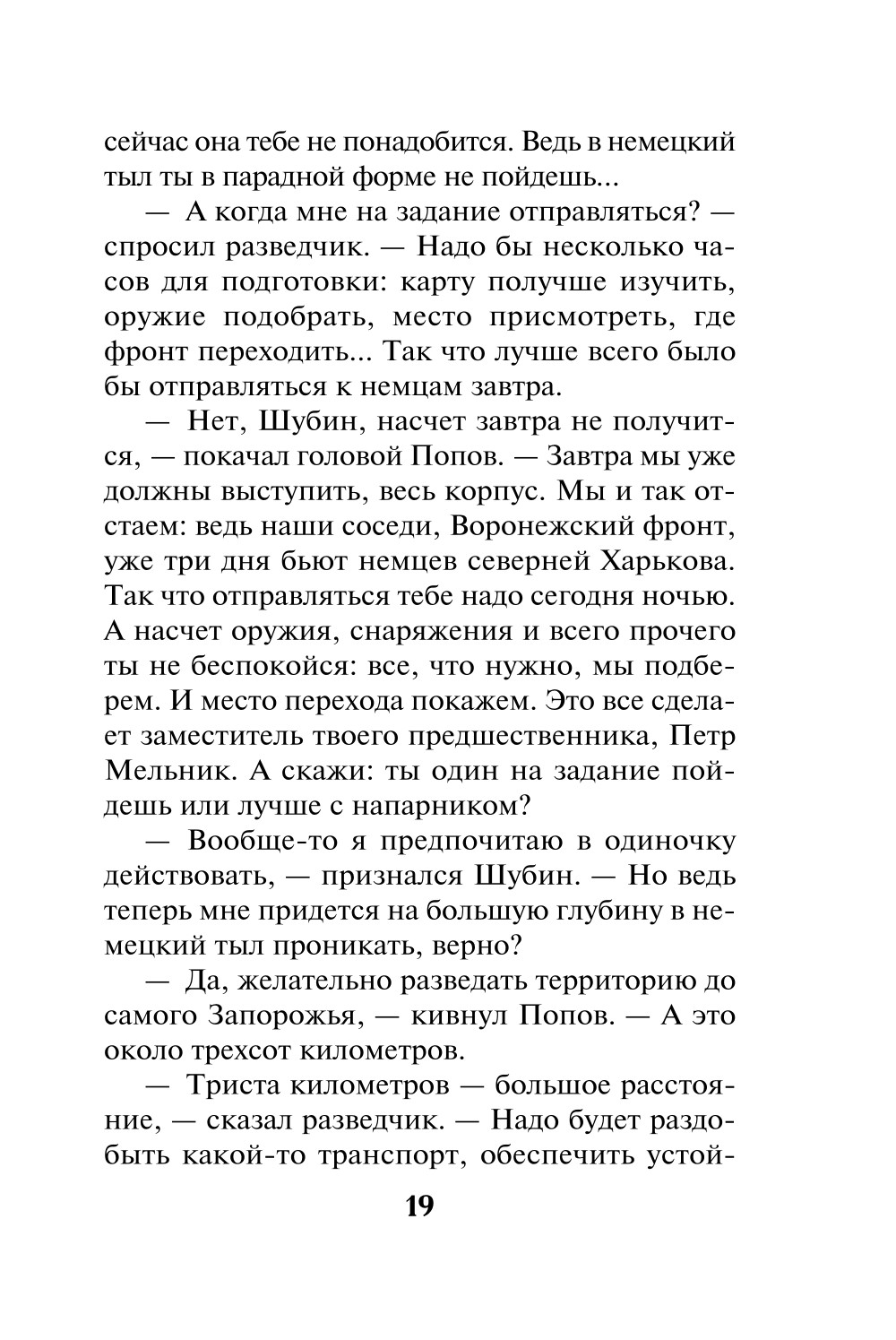 Боевые романы о ежедневном подвиге советских фронтовых разведчиков. Поединок силы и духа, когда до переднего края врага всего несколько шагов. Подробности жестоких боев, о которых не рассказывают даже ветераны - участники тех событий. Советские войска готовят наступление в направлении Харькова. Для уточнения оперативной обстановки во вражеский тыл забрасывается разведгруппа во главе с капитаном Глебом Шубиным. Опытному разведчику удается перехватить немецкого связиста и, переодевшись в его форму, устроиться в германском штабе. Добытые таким образом сведения помогают нашему командованию в подготовке предстоящей операции. Неожиданно приходит известие, что в район боевых действий прибывает высокое начальство рейха. Понимая, что может быть разоблачен в любой момент, Шубин тем не менее решает задержаться в германском тылу…| Издательство | Эксмо |