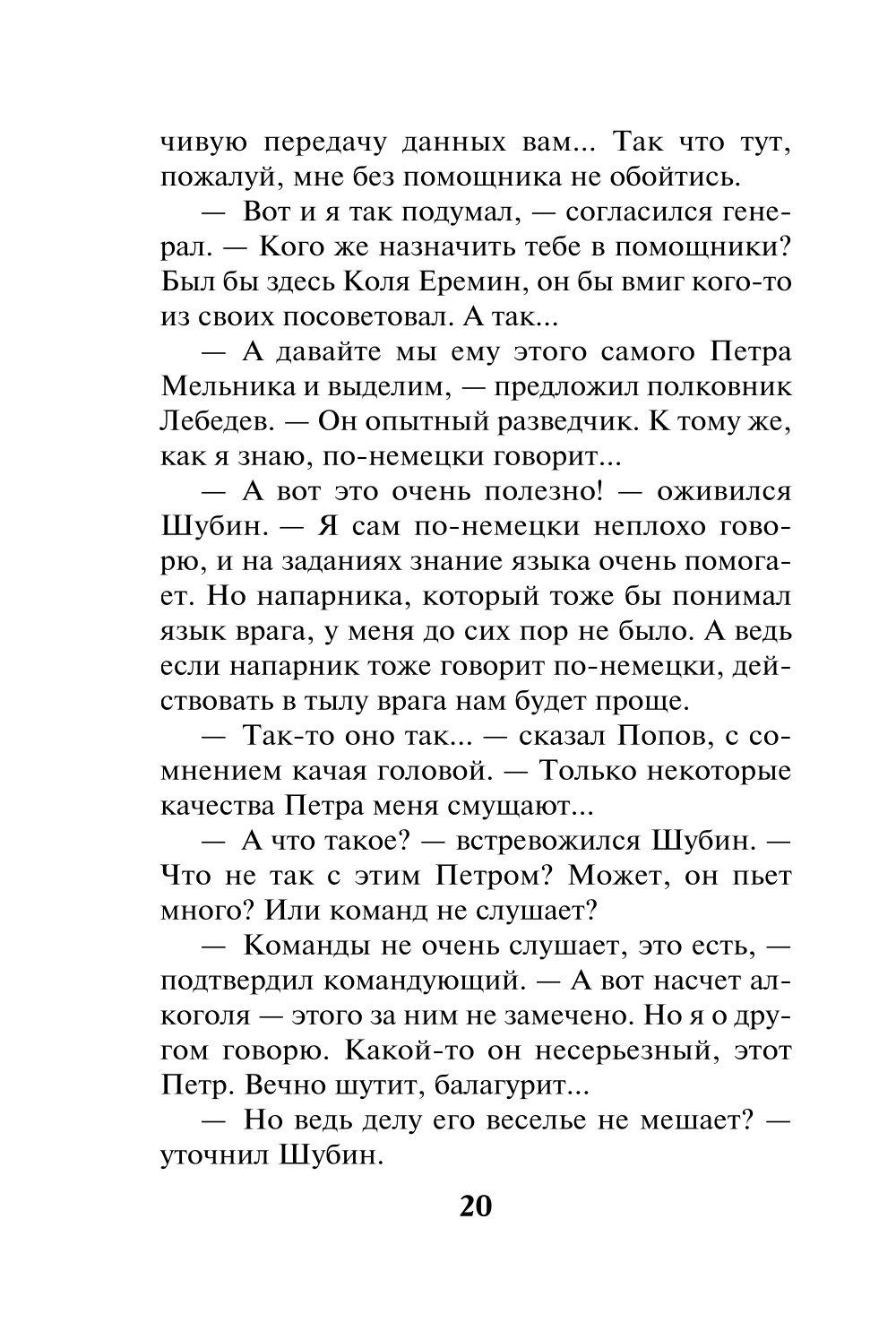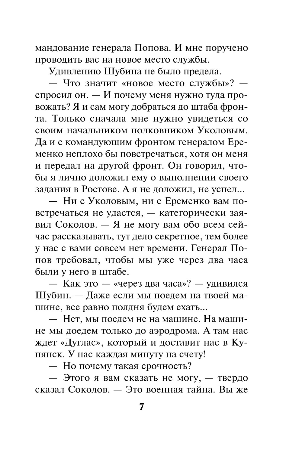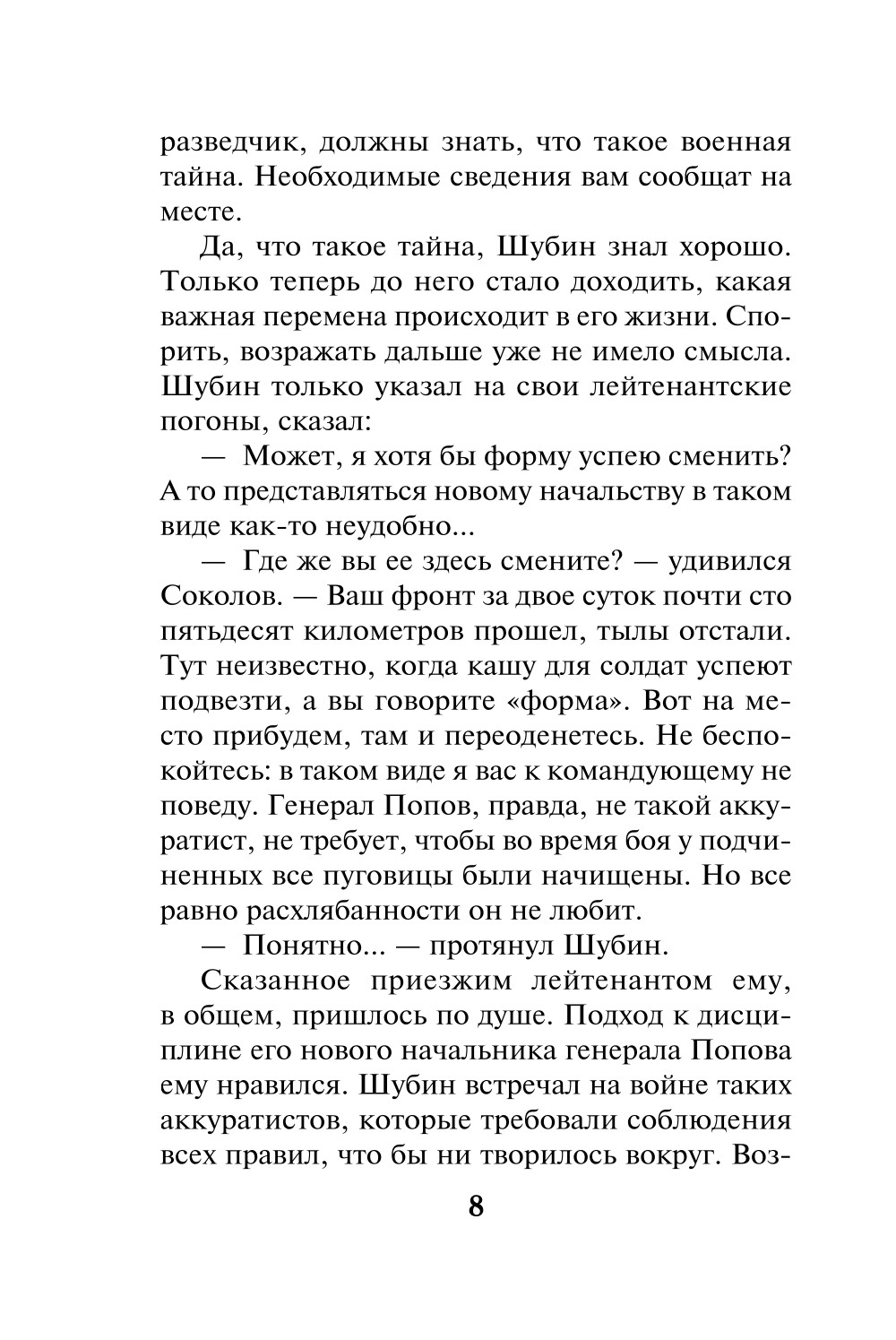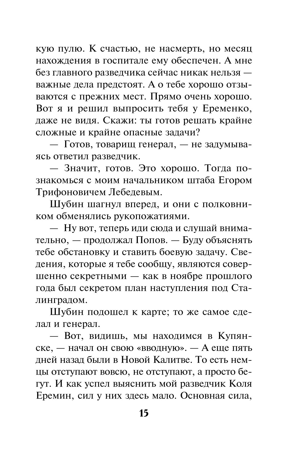 Боевые романы о ежедневном подвиге советских фронтовых разведчиков. Поединок силы и духа, когда до переднего края врага всего несколько шагов. Подробности жестоких боев, о которых не рассказывают даже ветераны - участники тех событий. Советские войска готовят наступление в направлении Харькова. Для уточнения оперативной обстановки во вражеский тыл забрасывается разведгруппа во главе с капитаном Глебом Шубиным. Опытному разведчику удается перехватить немецкого связиста и, переодевшись в его форму, устроиться в германском штабе. Добытые таким образом сведения помогают нашему командованию в подготовке предстоящей операции. Неожиданно приходит известие, что в район боевых действий прибывает высокое начальство рейха. Понимая, что может быть разоблачен в любой момент, Шубин тем не менее решает задержаться в германском тылу…| Издательство | Эксмо |