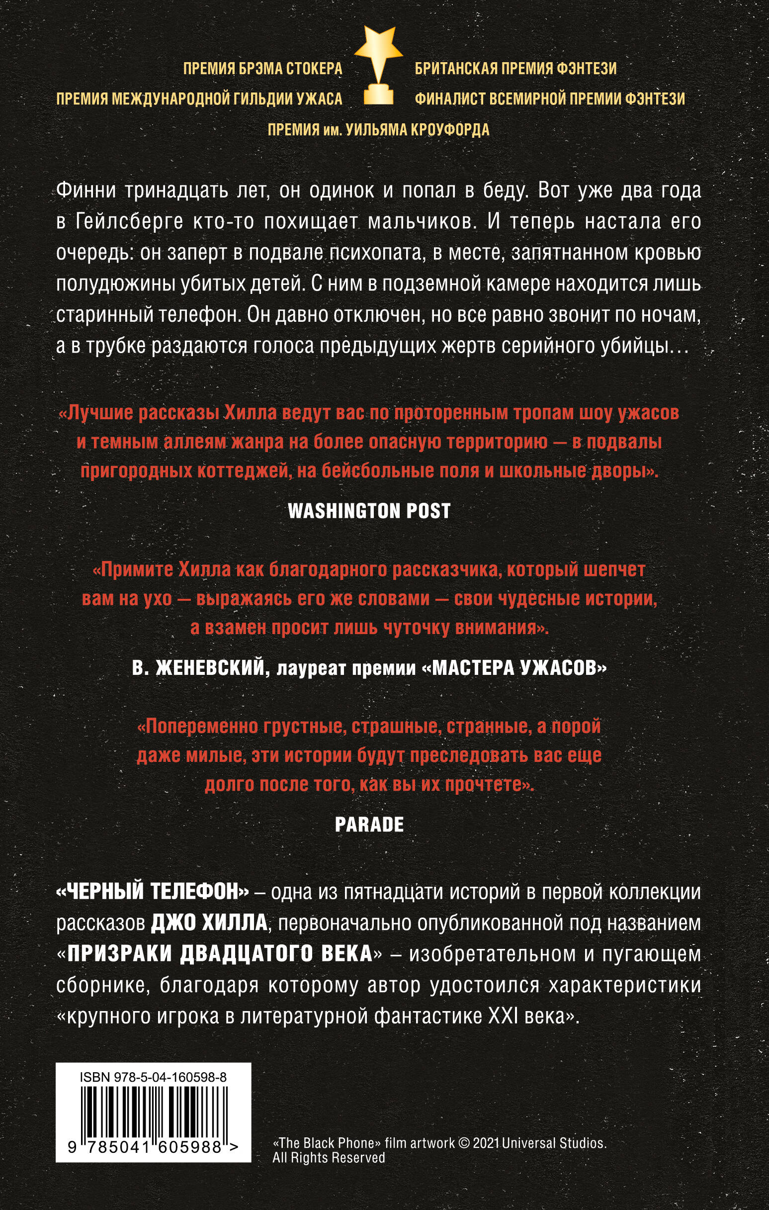 Премия Брэма Стокера. Премия Международной гильдии ужаса. Британская премия фэнтези. Премия им. Уильяма Кроуфорда. Финалист Всемирной премии фэнтези. Джону Финни тринадцать лет, он одинок и попал в беду. Вот уже два года в Гейлсберге кто-то похищает мальчиков. И теперь Финни в опасности: он заперт в подвале психопата, в месте, запятнанном кровью полудюжины убитых детей. С ним в подземной камере находится старинный телефон, давно отключенный... Но он все равно звонит по ночам, а в трубке раздаются голоса предыдущих жертв серийного убийцы… «Черный телефон» - одна из пятнадцати историй в первой коллекции рассказов Джо Хилла, первоначально опубликованной под названием «Призраки двадцатого века» - изобретательном и пугающем сборнике, из-за которого этого удостоенного наград, признанного критиками и пользующегося спросом автора назвали «крупным игроком в литературной фантастике двадцать первого века». «Лучшие рассказы Хилла ведут вас по проторенным тропам шоу ужасов и темным аллеям жанра на более опасную территорию - в подвалы пригородных коттеджей, на бейсбольные поля и школьные дворы». - Washington Post «Примите Хилла как благодарного рассказчика, который шепчет вам на ухо - выражаясь его же словами - свои чудесные истории, а взамен просит лишь чуточку внимания». - В. Женевский, лауреат премии «Мастера ужасов» «Попеременно грустные, страшные, странные, а порой даже милые, эти истории будут преследовать вас еще долго после того, как вы их прочтете». - Parade «Джо Хилл отлично умеет подкрадываться исподтишка. Уже одно это равняет его с такими классиками "сумеречной зоны" литературы, как Говард Филлипс Лавкрафт, Рэй Брэдбери, Стивен Кинг». - Кристофер Голден «Изобретательная коллекция рассказов... умелая и отважная». - New York Times Book Review «Полностью проработанные персонажи со сложной эмоциональной жизнью усиливают 14 историй в необыкновенной коллекции Джо Хилла. В этом томе нет ни фальшивых нот, ни разочаровывающих попыток». - Publishers Weekly «Истории варьируются от жутких до милых, со впечатляющим выбором тактики атаки на вашу психику». - Boston Globe «Это первая коллекция рассказов Джо Хилла, демонстрирующая непревзойденное мастерство в самых разных стилях... Забавные, трогательные, ужасающие - они охватывают весь спектр хоррора». - USA Today «Прекрасный серьезный сборник рассказов». - Village Voice «Одна из лучших коллекций ужасов года. Джо Хилл - относительный новичок, который постоянно создает жуткие, очень тревожные истории». - Locus «Каждая история уникальна, и сборник доказывает, что талант Джо Хилла не ограничивается ужасами, а и широко распространяется в мейнстрим». - Denver News «Новый взгляд на жанры фэнтези и хоррор... Настоятельно рекомендуется». - The Sun Herald| Издательство | Эксмо |