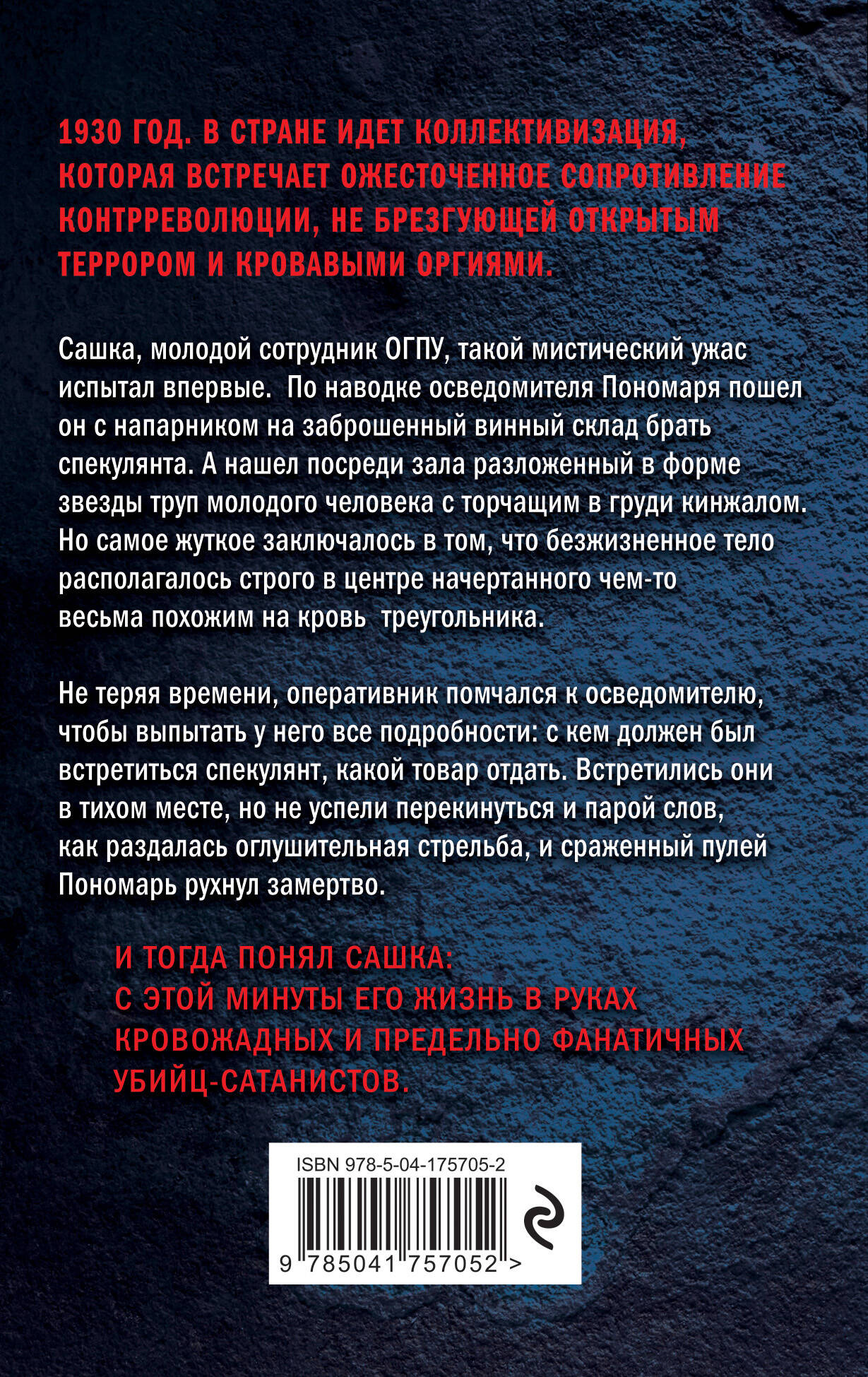 1930 год. В стране идет коллективизация, которая встречает ожесточенное сопротивление контрреволюции, не брезгующей открытым террором и кровавыми оргиями. Сашка, молодой сотрудник ОГПУ, такой мистический ужас испытал впервые. По наводке осведомителя Пономаря пошел он с напарником на заброшенный винный склад брать спекулянта. А нашел посреди зала разложенный в форме звезды труп молодого человека с торчащим в груди кинжалом. Но самое жуткое заключалось в том, что безжизненное тело располагалось строго в центре начертанного чем-то, весьма похожим на кровь, треугольника. Не теряя времени, оперативник помчался к осведомителю, чтобы выпытать у него все подробности: с кем должен был встретиться спекулянт, какой товар отдать. Встретились они в тихом месте, но не успели перекинуться и парой слов, как раздалась оглушительная стрельба, и сраженный пулей Пономарь рухнул замертво. И тогда понял Сашка: с этой минуты его жизнь в руках кровожадных и предельно фанатичных убийц-сатанистов.| Издательство | ООО "Издательство "Эксмо" |