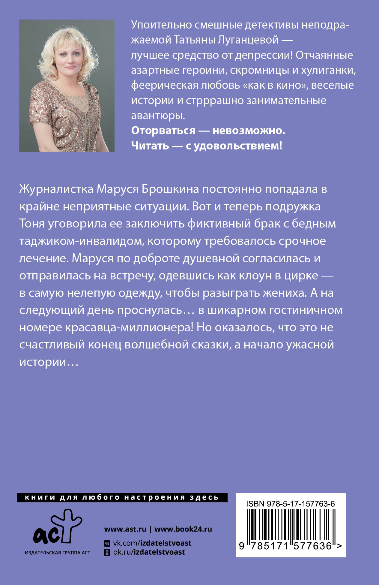 - Юмористический детектив в удобном покет-формате! - Легкий стиль, тонкий юмор и захватывающий детективный сюжет. Феерическая любовь и находчивая главная героиня. Маруся в любом гиблом положении умеет находить повод для шутки. Вот и на свою фиктивную свадьбу с таджиком-инвалидом Маруся явилась в нелепой одежде, как будто из цирка сбежала. Рецепт для катастрофы! Однако на утро Маруся проснулась в шикарном номере отеля, а рядом с собой обнаружила красавца-миллионера. Кажется, теперь кто-то решил подшутить над самой Марусей.| Издательство | Издательство "АСТ" |