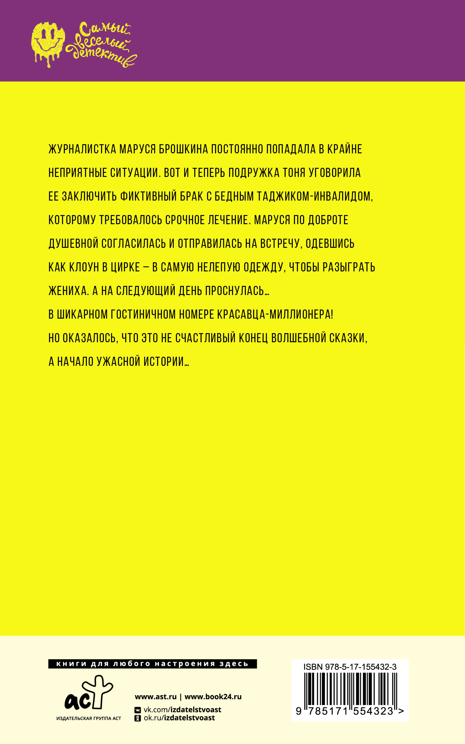 Журналистка Маруся Брошкина постоянно попадала в крайне неприятные ситуации. Вот и теперь подружка Тоня уговорила ее заключить фиктивный брак с бедным таджиком-инвалидом, которому требовалось срочное лечение. Маруся по доброте душевной согласилась и отправилась на встречу, одевшись как клоун в цирке - в самую нелепую одежду, чтобы разыграть жениха. А на следующий день проснулась… в шикарном гостиничном номере красавца-миллионера! Но оказалось, что это не счастливый конец волшебной сказки, а начало ужасной истории…| Издательство | Издательство "АСТ" |