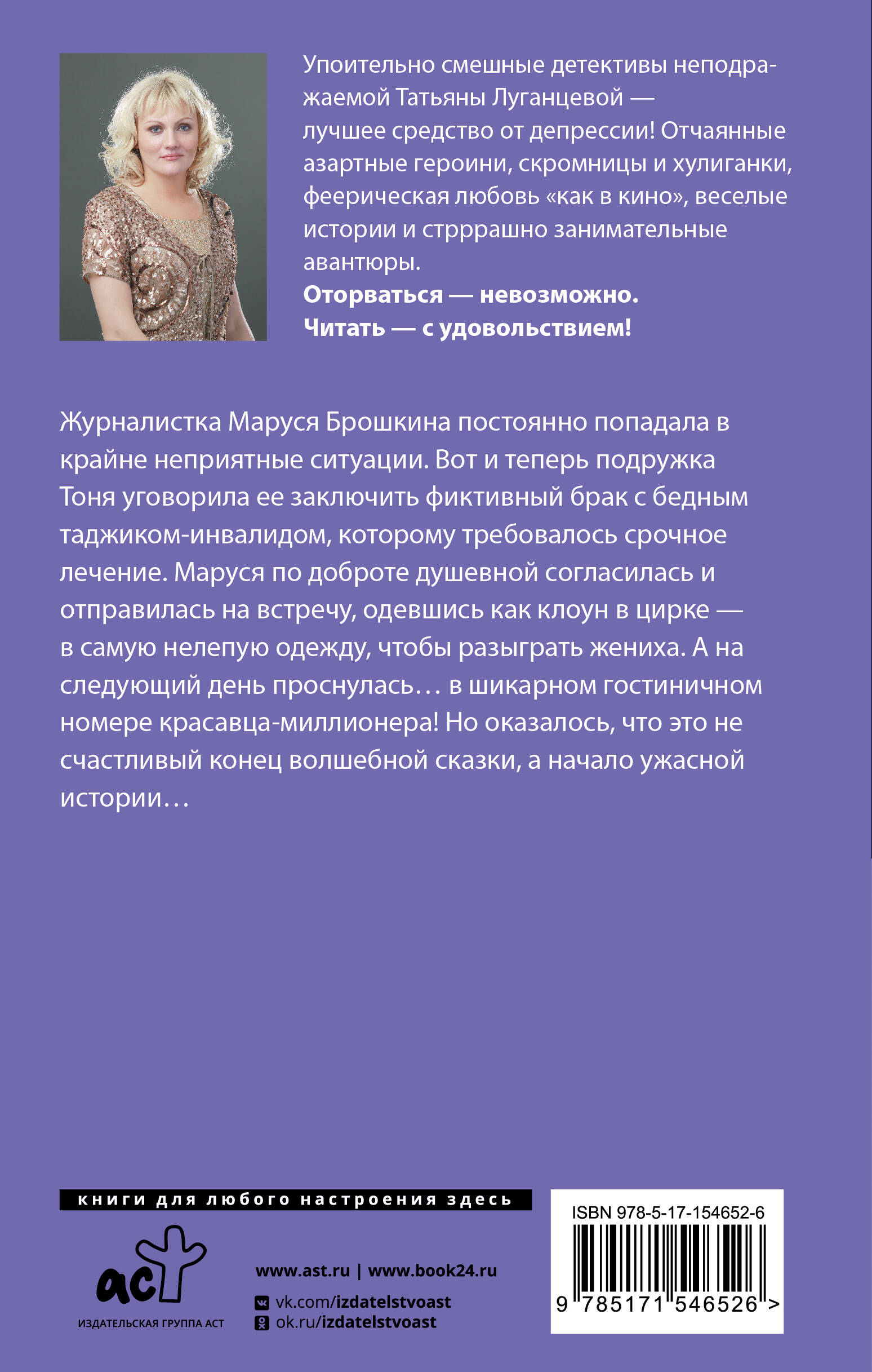 Журналистка Маруся Брошкина постоянно попадала в крайне неприятные ситуации. Вот и теперь подружка Тоня уговорила ее заключить фиктивный брак с бедным таджиком-инвалидом, которому требовалось срочное лечение. Маруся по доброте душевной согласилась и отправилась на встречу, одевшись как клоун в цирке - в самую нелепую одежду, чтобы разыграть жениха. А на следующий день проснулась… в шикарном гостиничном номере красавца-миллионера! Но оказалось, что это не счастливый конец волшебной сказки, а начало ужасной истории…| Издательство | Издательство "АСТ" |