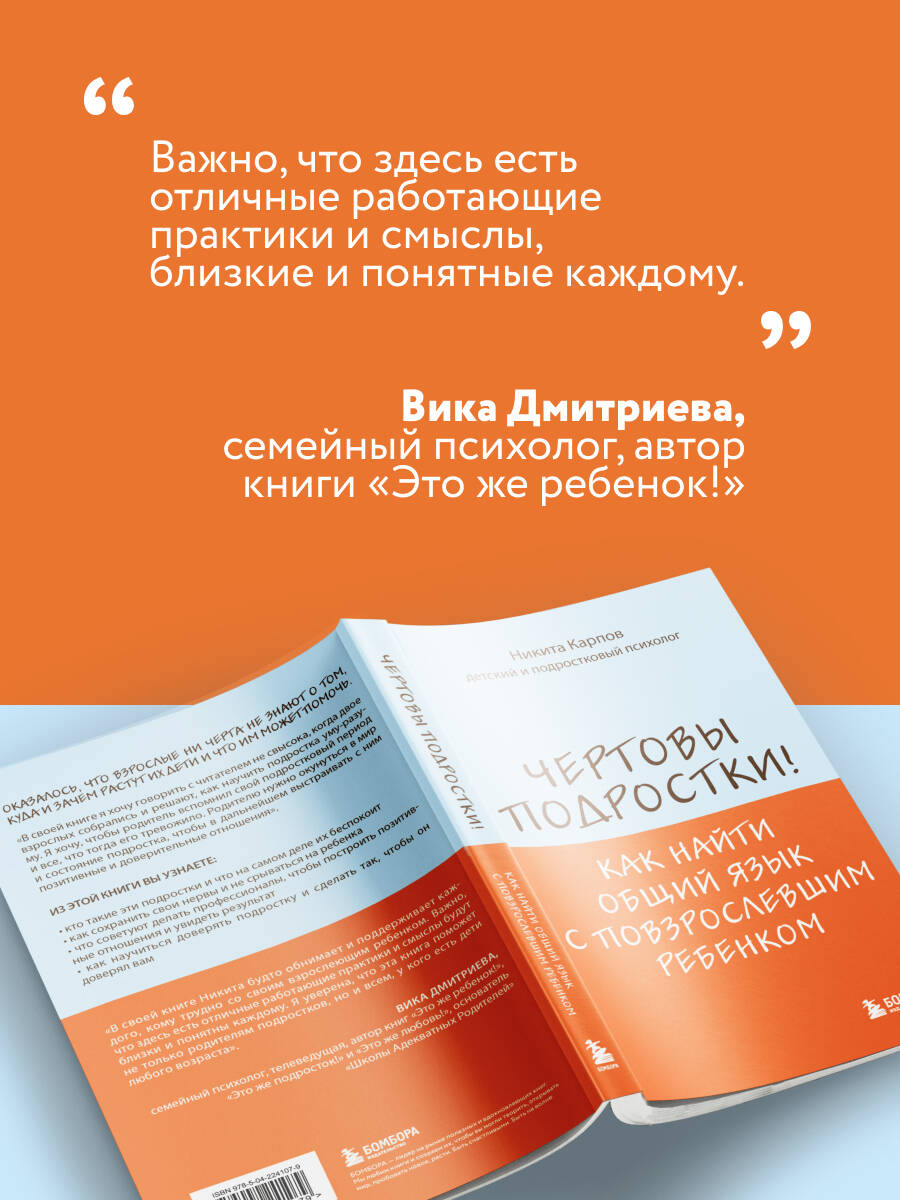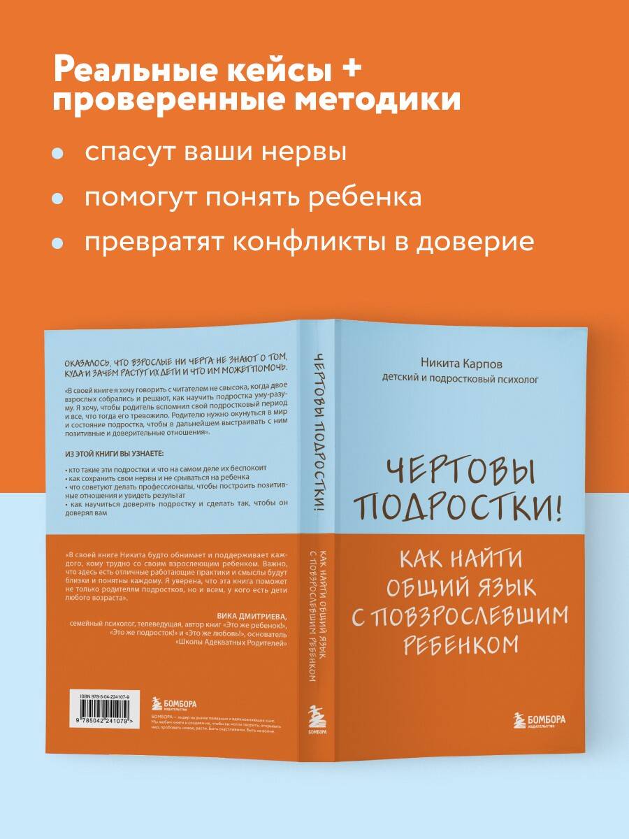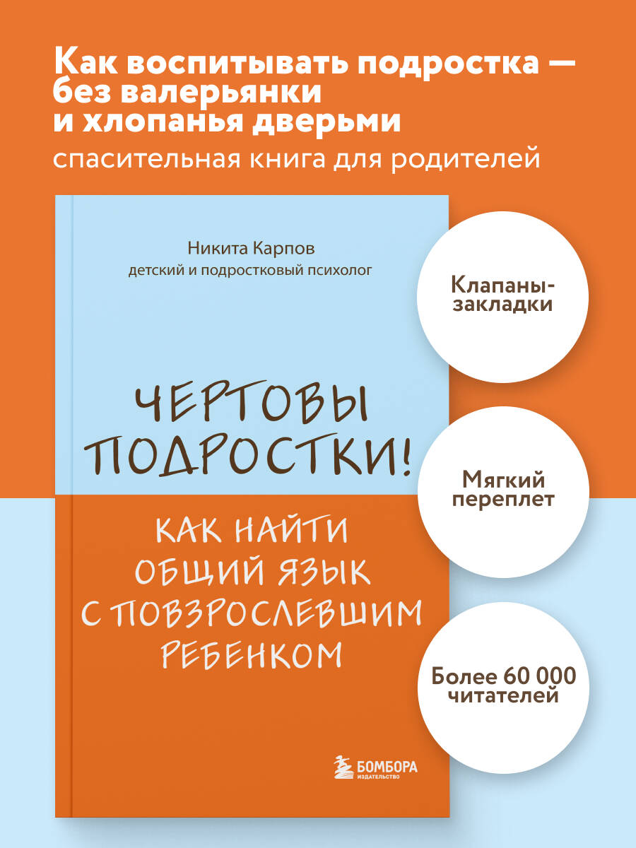ПРОДАНО БОЛЕЕ 60 ТЫС. ЭКЗЕМПЛЯРОВ! Детский и подростковый психолог Никита Карпов знает о взрослении всё. 20 лет он помогает подросткам и родителям найти общий язык и решает их проблемы. В легкой форме, с долей юмора, Никита Карпов рассказывает о реальных кейсах, профессиональных техниках и методиках, которые спасут ваши нервы, наладят крепкие доверительные отношения и помогут воспитать самостоятельного человека. Он раскроет глаза, что на самом деле пубертат - очень интересный период, от которого можно получать удовольствие и родителям, и подросткам. «Подростковый возраст ребенка всегда гарантирует родителям несколько лет очень веселой жизни. С "американскими горками" эмоций, неизведанными тревогами и большим количеством конфликтов по любому поводу. Как бы мы ни пытались пообщаться с этими удивительными существами, чаще утыкаемся носом в закрытую дверь. Что ж, давайте разбираться, каким образом пережить этот чудный возраст, не прибить своего подростка и, крайне желательно, не всадить все семейные сбережения на новопассит и винишко». ИЗ ЭТОЙ КНИГИ ВЫ УЗНАЕТЕ: - кто такие эти подростки и что на самом деле их беспокоит; - как сохранить свои нервы и не срываться на ребенка; - что советуют делать профессионалы, чтобы построить позитивные отношения и увидеть результат; - что нужно сделать, чтобы ребенок полностью доверял вам; - как научиться доверять подростку и отпускать ситуации, которые не требуют контроля. Об авторе Никита Карпов - детский и подростковый психолог с более чем 20-летним опытом работы. Автор книг «Чертовы подростки!», «Чертовы скандалы!» и «Чертова школа!» с тиражом более 100 000 экземпляров. Ведущий программы «Трудности перехода» на Радио «Маяк». Провел десятки лекций и вебинаров, сотни тренингов и тысячи консультаций. Автор известного телеграм-канала «#Чертовы подростки». Отец двоих детей.| Издательство | ООО "Издательство "Эксмо" |
