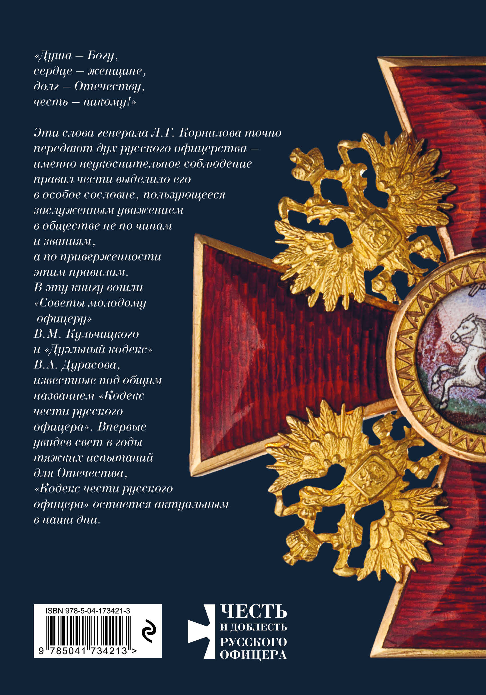 Для русского офицерства правила чести в иерархии ценностей стояли выше устава и закона, что выделило его в особое сословие, пользующееся заслуженным уважением в обществе не по чинам и званиям, а по приверженности этим правилам. В книгу включены «Советы молодому офицеру» В.М. Кульчицкого и «Дуэльный кодекс» В.А. Дурасова, известные под общим названием «Кодекс чести русского офицера» и закрепившие для потомков представления о чести русского офицерства, где дуэль рассматривалась как крайнее средство защиты чести, а возможность поплатиться жизнью за оскорбление играла большую роль в поддержании чувства собственного достоинства и уважения его в других. Книга будет хорошим подарком военнослужащему и любому, кто интересуется историей Отечества.
