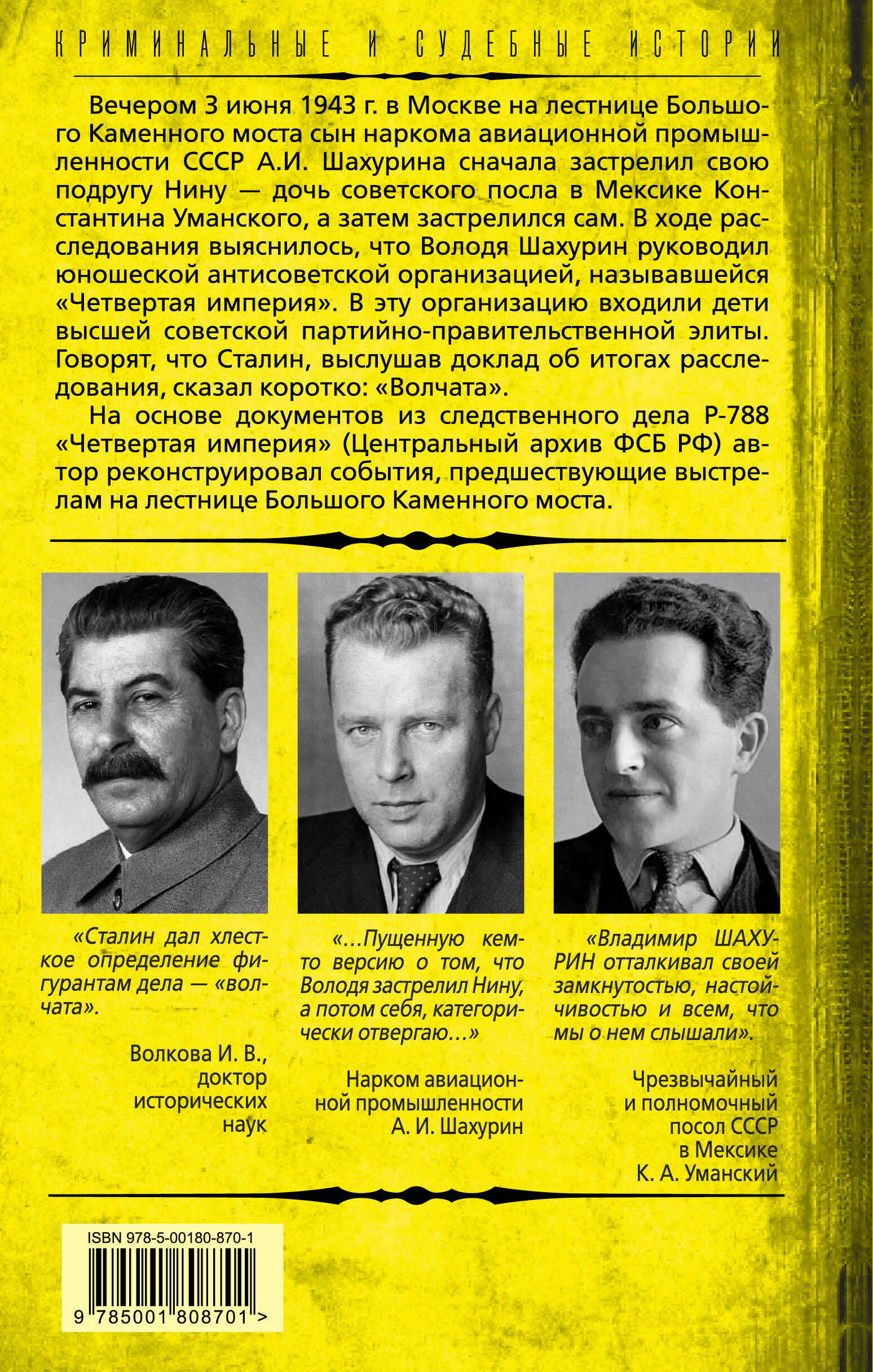 Вечером 3 июня 1943 г. в Москве на лестнице Большого Каменного моста сын наркома авиационной промышленности СССР А.И. Шахурина сначала застрелил свою подругу Нину - дочь советского посла в Мексике Константина Уманского, а затем застрелился сам. В ходе расследования выяснилось, что Володя Шахурин руководил юношеской антисоветской организацией, называвшейся «Четвертая империя». В эту организацию входили дети высшей советской партийно-правительственной элиты. Говорят, что Сталин, выслушав доклад об итогах расследования, сказал коротко: «Волчата». Эта история составляет центральный сюжет романа А. Терехова «Каменный мост», получившего в 2009 г. премию «Большая книга». В 2020 г. был снят сериал «Волк», посвященный «Делу волчат». На основе документов из следственного дела Р-788 «Четвертая империя» (Центральный архив ФСБ РФ) автор реконструировал события, предшествующие выстрелам на лестнице Большого Каменного моста.| Издательство | Родина Издательство ООО |