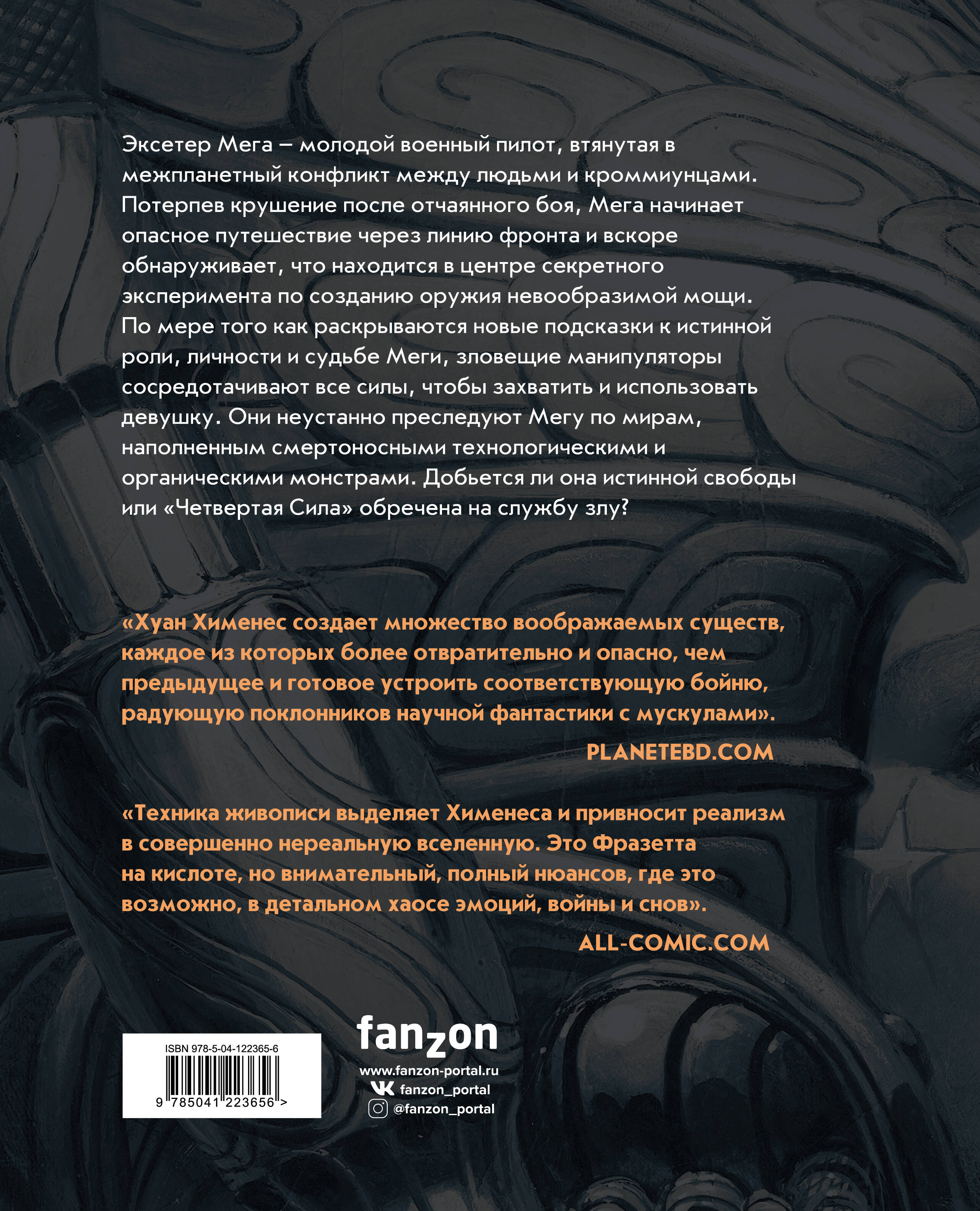 «Четвертая сила» - это история несовершенного общества, бесконечной и безнадежной футуристической войны от иллюстратора культовых «Метабаронов» Алехандро Ходоровски. Молодой пилот участвует в космической войне и не знает, что является частью эксперимента по созданию абсолютного оружия. И власть имущие пойдут на всё, чтобы захватить ту, что должна стать «Четвертой Силой». Полное издание - омнибус, который включает в себя все четыре тома саги. «Хуан Хименес. Аргентинец. Величайший в Европе художник-фантаст. Невероятно богатое воображение и его плоды». - Гильермо дель Торо «Хуан Хименес создает множество воображаемых существ, каждое из которых более отвратительно и опасно, чем предыдущее, и готово устроить соответствующую бойню, радующую поклонников научной фантастики с мускулами». - PlaneteBD.com «Техника живописи выделяет Хименеса и привносит реализм в совершенно нереальную вселенную. Это Фразетта на кислоте, но внимательный, полный нюансов, где это возможно, в детальном хаосе эмоций, войны и снов». - All-Comic.com| Издательство | ООО "Издательство "Эксмо" |
