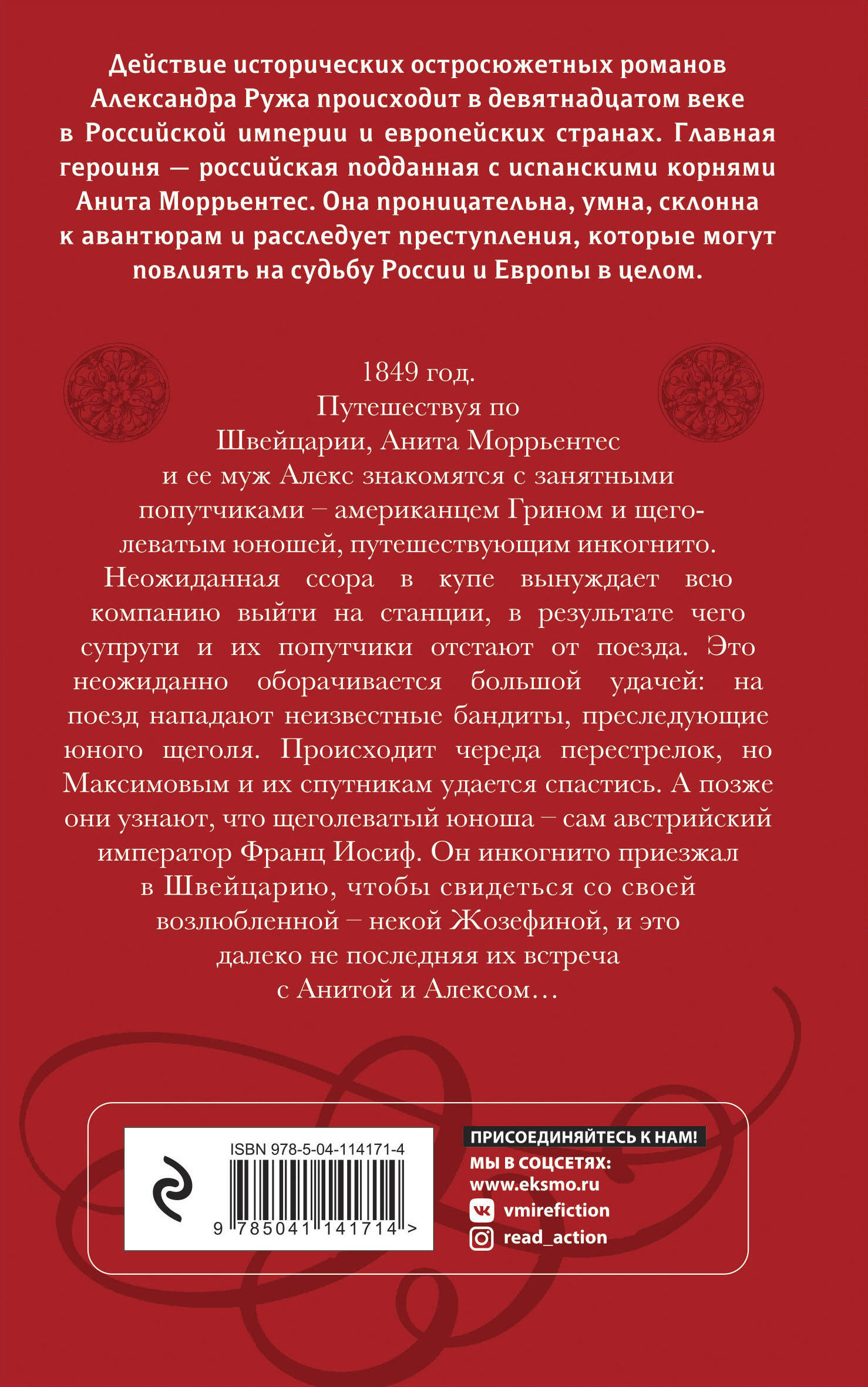1849 год. Путешествуя по Швейцарии, Анита Моррьентес и ее муж Алекс знакомятся с занятными попутчиками - американцем Грином и щеголеватым юношей, путешествующим инкогнито. Неожиданная ссора в купе вынуждает всю компанию выйти на станции, в результате чего супруги и их попутчики отстают от поезда. Это неожиданно оборачивается большой удачей: на поезд нападают неизвестные бандиты, преследующие юного щеголя. Происходит череда перестрелок, но Максимовым и их спутникам удается спастись. А позже они узнают, что щеголеватый юноша - сам австрийский император Франц-Иосиф. Он инкогнито приезжал в Швейцарию, чтобы свидеться со своей возлюбленной - некой Жозефиной, и это далеко не последняя их встреча с Анитой и Алексом… Действие исторических остросюжетных романов Александра Ружа происходит в девятнадцатом веке в Российской империи и европейских странах. Главная героиня - российская подданная с испанскими корнями Анита Моррьентес. Она проницательна, умна, склонна к авантюрам и расследует преступления, которые могут повлиять на судьбу России и Европы в целом.| Издательство | ООО "Издательство "Эксмо" |