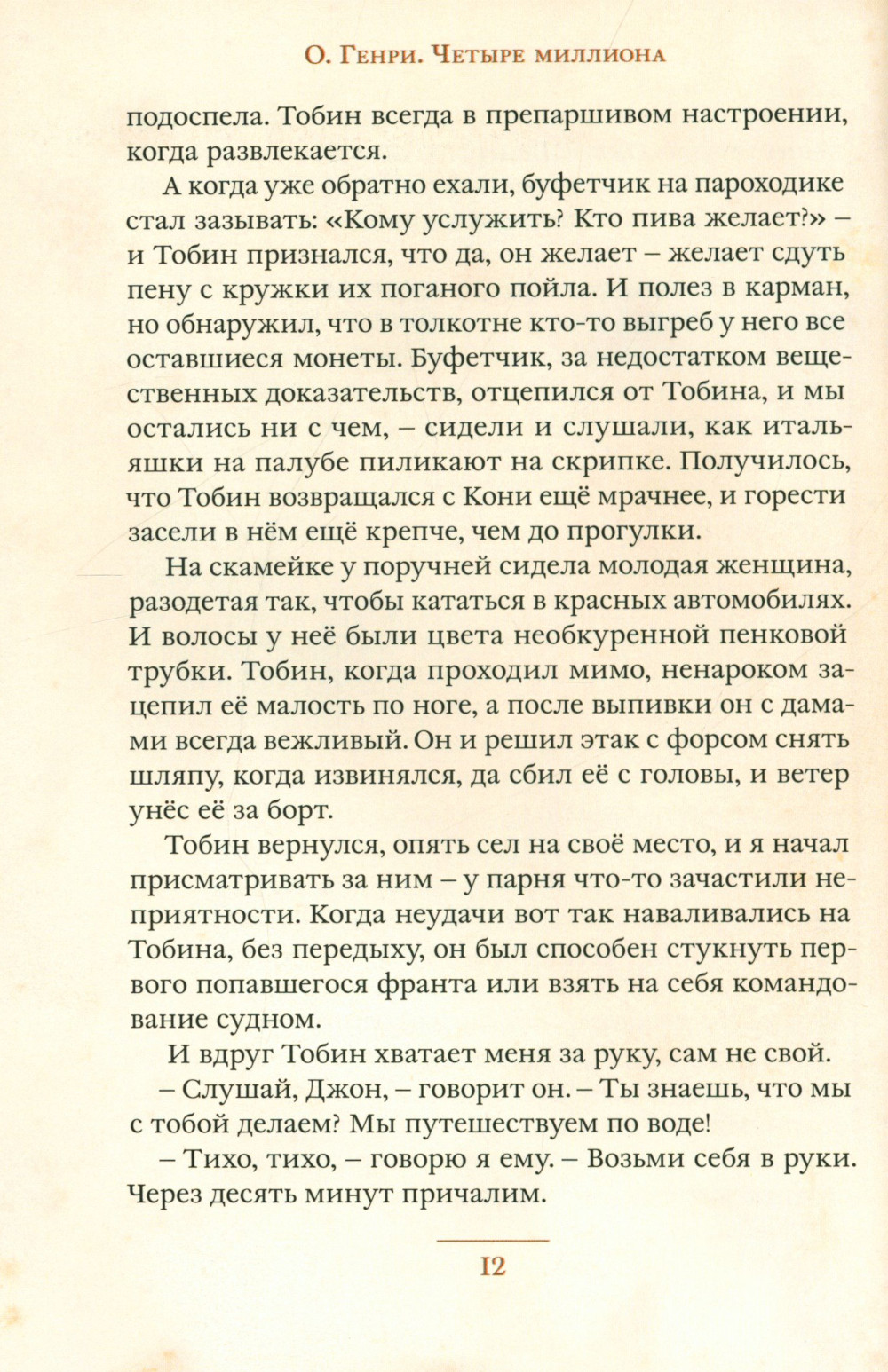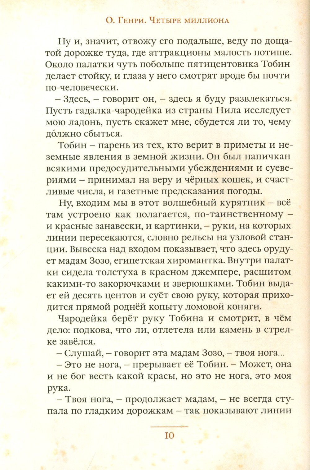 О. Генри - псевдоним Уильяма Сидни Портера, признанного мастера рассказов с неожиданной концовкой. Впервые сборник «Четыре миллиона» появился в 1906 году. В это время в Нью-Йорке существовал особый элитный класс - миллионеры, живущие замкнутой жизнью. Он составлял не более четырехсот человек, и газетчики считали, что только эти люди заслуживают интереса. О. Генри с ними не был согласен, он считал, что все четыре миллиона жителей Нью-Йорка одинаково достойны внимания. После этой книги О. Генри стал знаменит на всю Америку. В книгу вошли избранные рассказы из сборника «Четыре миллиона».