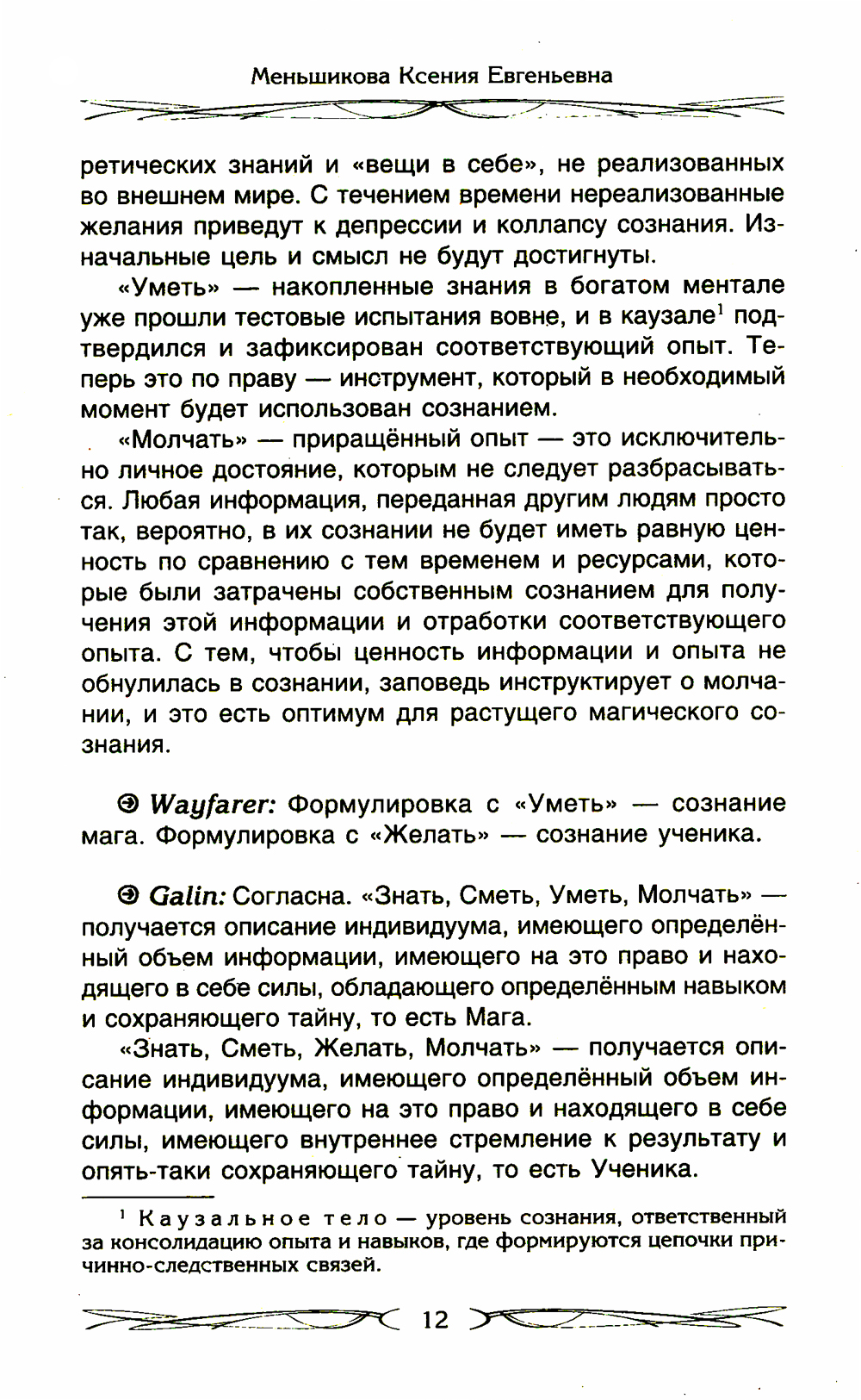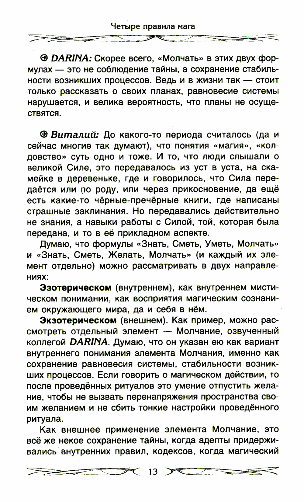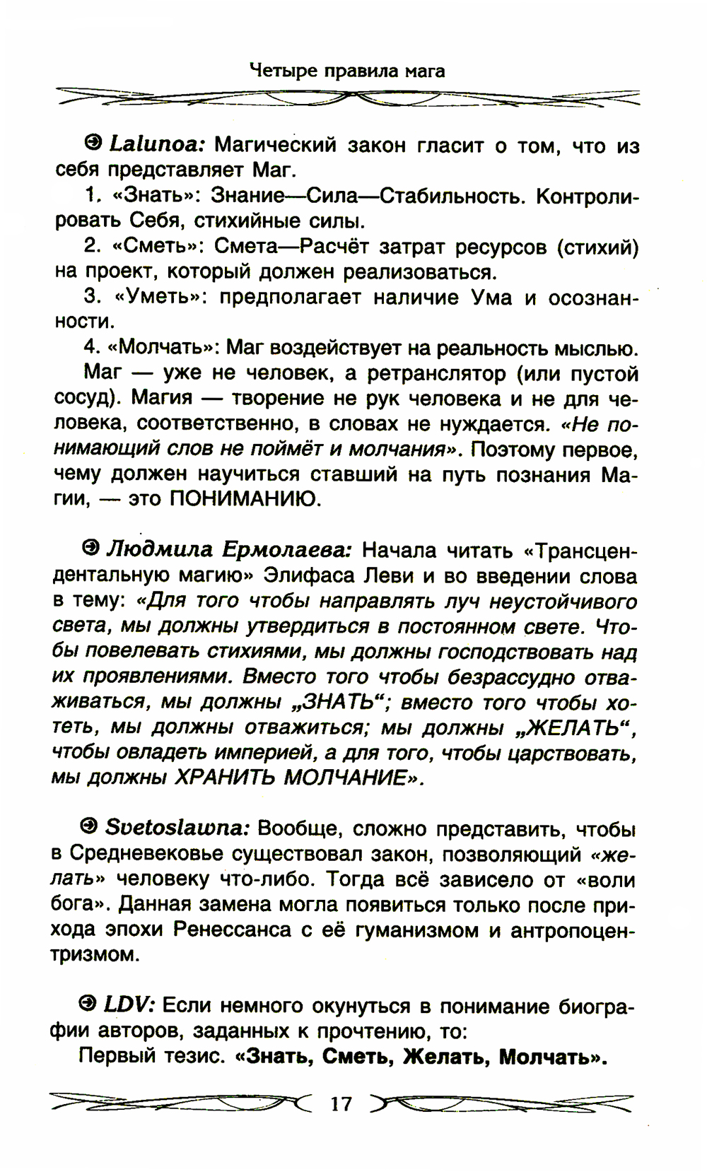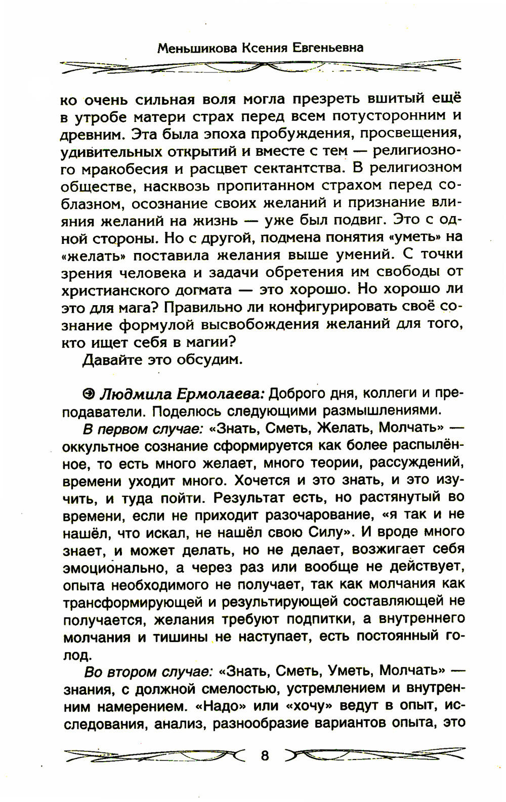 Перед вами одиннадцатая книга серии «Магия в вопросах и ответах», и каждая из них поможет читателю узнать что-то сокровенное. Книги необычные, авторов у них много: это основатель Школы Ксения Евгеньевна Меньшикова, преподаватели Школы и её ученики. В тексте использована живая переписка с форума «Магия едина»: реальные люди, невыдуманные проблемы, животрепещущие вопросы... В этой книге мы постараемся углубить понимание смысла и сути магического становления сознания мага. Для этой цели мы попробуем всесторонне рассмотреть магическую формулу «Знать, Сметь, Уметь, Молчать», которая является матрицей для такого становления. Эти четыре правила-заповеди каждый практикующий должен учитывать в своей работе и, конечно же, грамотно применять. Тема эта очень интересная и совсем не простая. Однако есть уверенность, что мы сумеем разобраться и с этим.| Издательство | Центрполиграф |