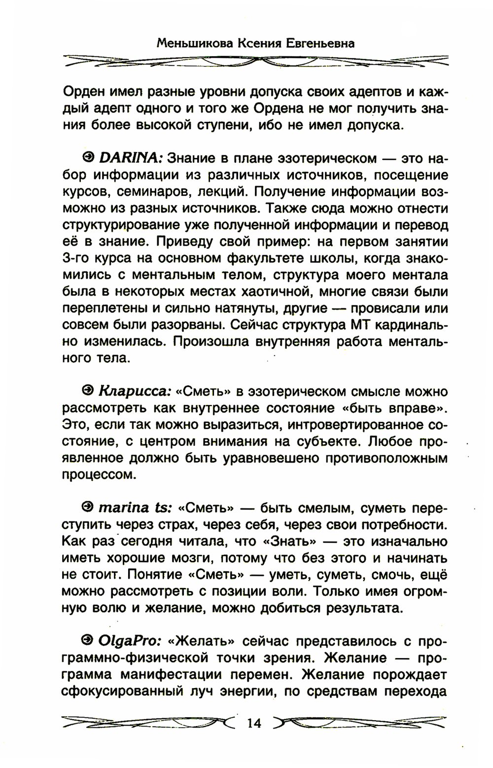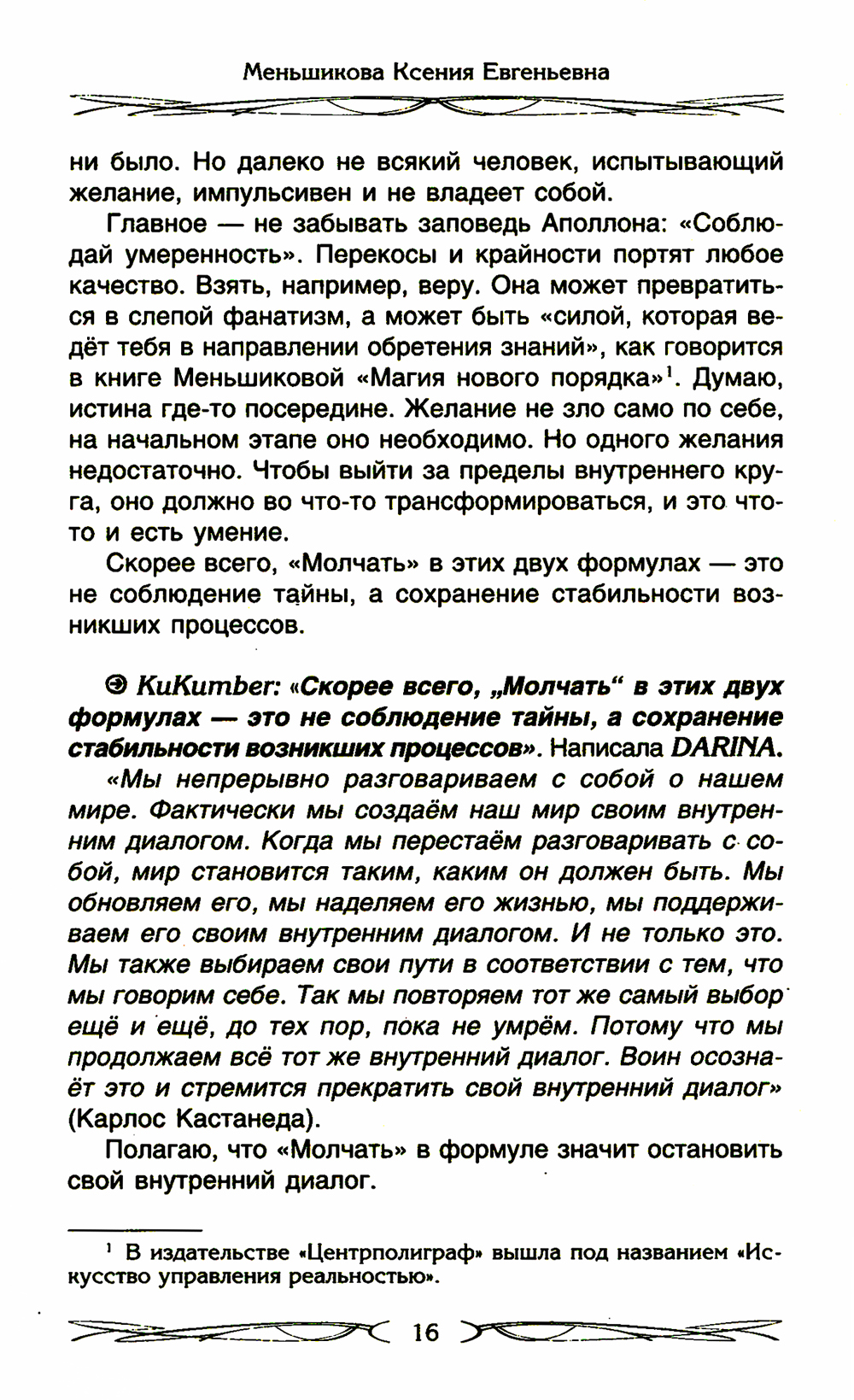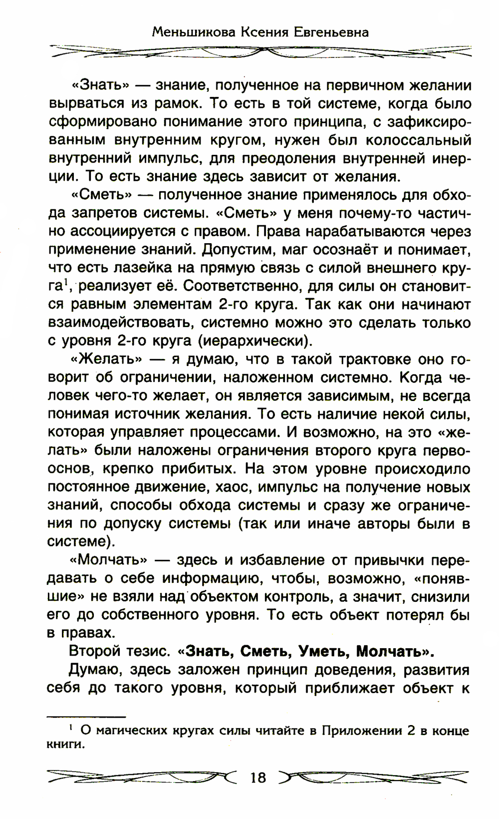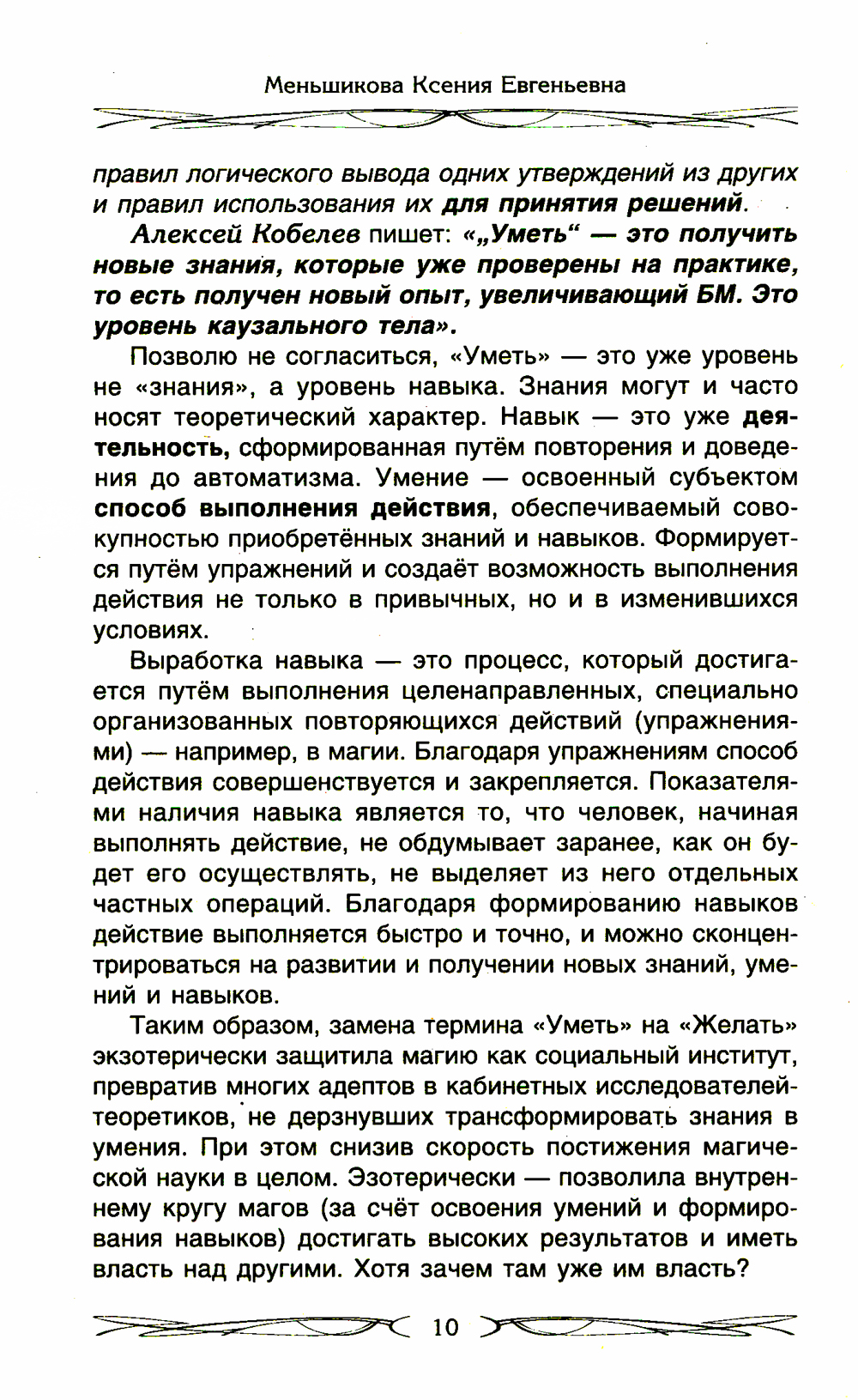 Перед вами одиннадцатая книга серии «Магия в вопросах и ответах», и каждая из них поможет читателю узнать что-то сокровенное. Книги необычные, авторов у них много: это основатель Школы Ксения Евгеньевна Меньшикова, преподаватели Школы и её ученики. В тексте использована живая переписка с форума «Магия едина»: реальные люди, невыдуманные проблемы, животрепещущие вопросы... В этой книге мы постараемся углубить понимание смысла и сути магического становления сознания мага. Для этой цели мы попробуем всесторонне рассмотреть магическую формулу «Знать, Сметь, Уметь, Молчать», которая является матрицей для такого становления. Эти четыре правила-заповеди каждый практикующий должен учитывать в своей работе и, конечно же, грамотно применять. Тема эта очень интересная и совсем не простая. Однако есть уверенность, что мы сумеем разобраться и с этим.| Издательство | Центрполиграф |