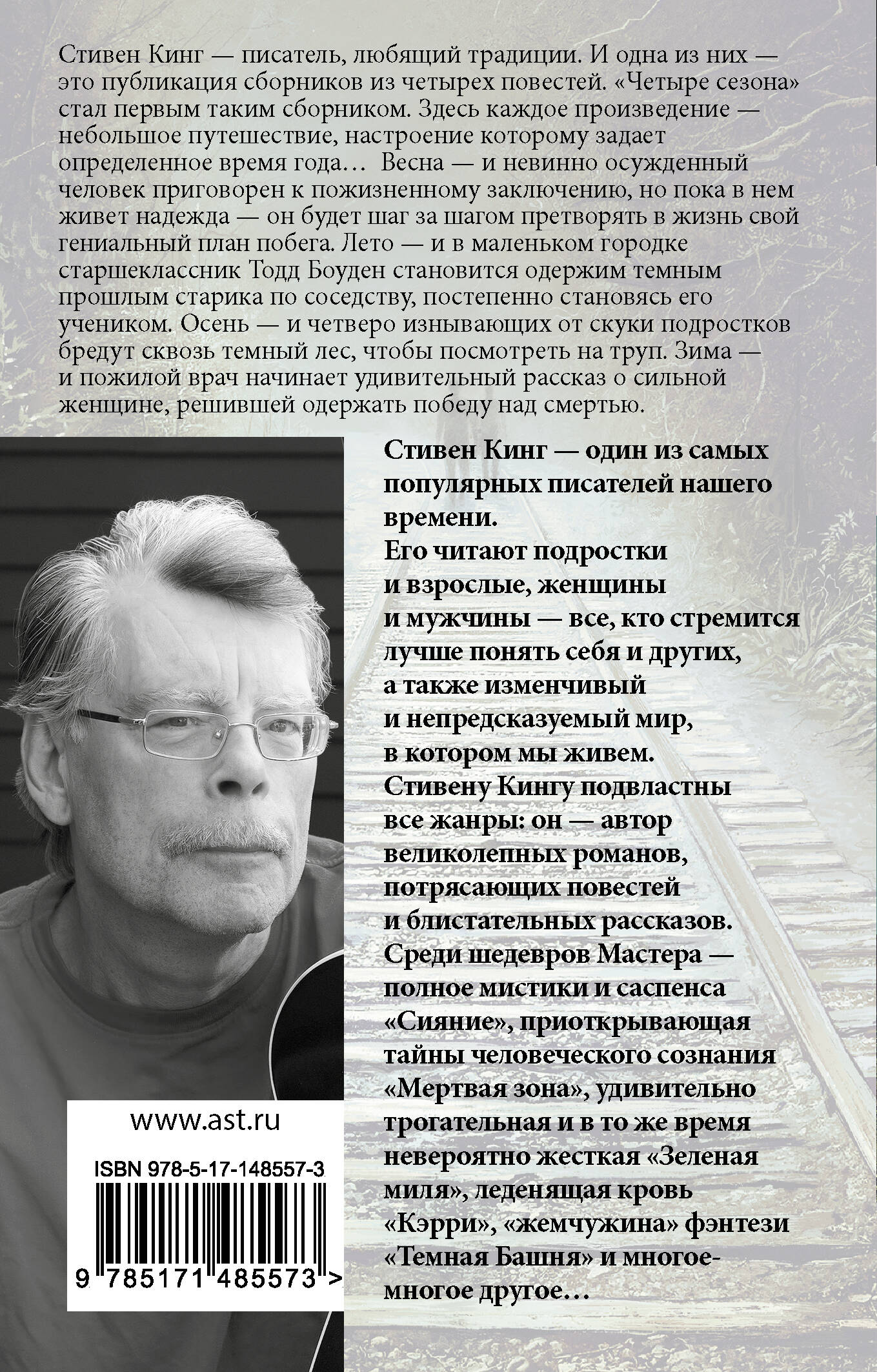 Стивен Кинг - писатель, любящий традиции. И одна из них - это публикация сборников, неизменно состоящих из четырех повестей. "Четыре сезона" стал первым таким сборником. Его заглавная повесть "Рита Хэйворт и побег из Шоушенка" легла в основу легендарного фильма Фрэнка Дарабонта с Тимом Роббинсом и Морганом Фриманом в главных ролях. Здесь каждое произведение - небольшое путешествие, тон и настроение которому задает определенное время года… Весна - и невинно осужденный человек приговорен к пожизненному заключению, однако пока в нем живет надежда - он будет шаг за шагом претворять в жизнь свой гениальный план побега. Лето - и в маленьком городке старшеклассник Тодд Боуден становится одержим темным прошлым старика по соседству, постепенно становясь его учеником. Осень - и четверо изнывающих от скуки подростков бредут сквозь темный, бесконечный лес, чтобы посмотреть на труп. Зима - и пожилой врач начинает удивительный рассказ о сильной женщине, решившей одержать победу над смертью.| Издательство | АСТ |