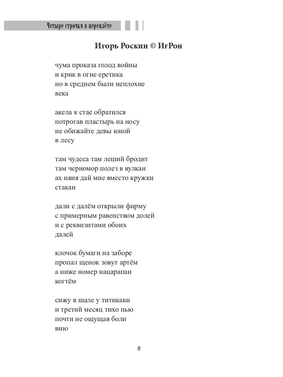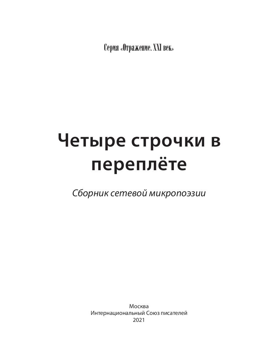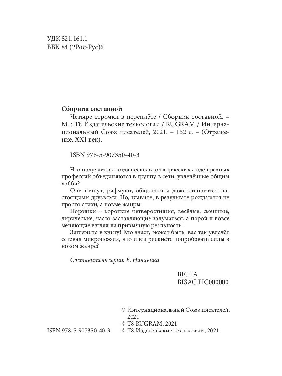 Аннотация: Четыре строчки в переплете. Сборник сетевой микропоэзии