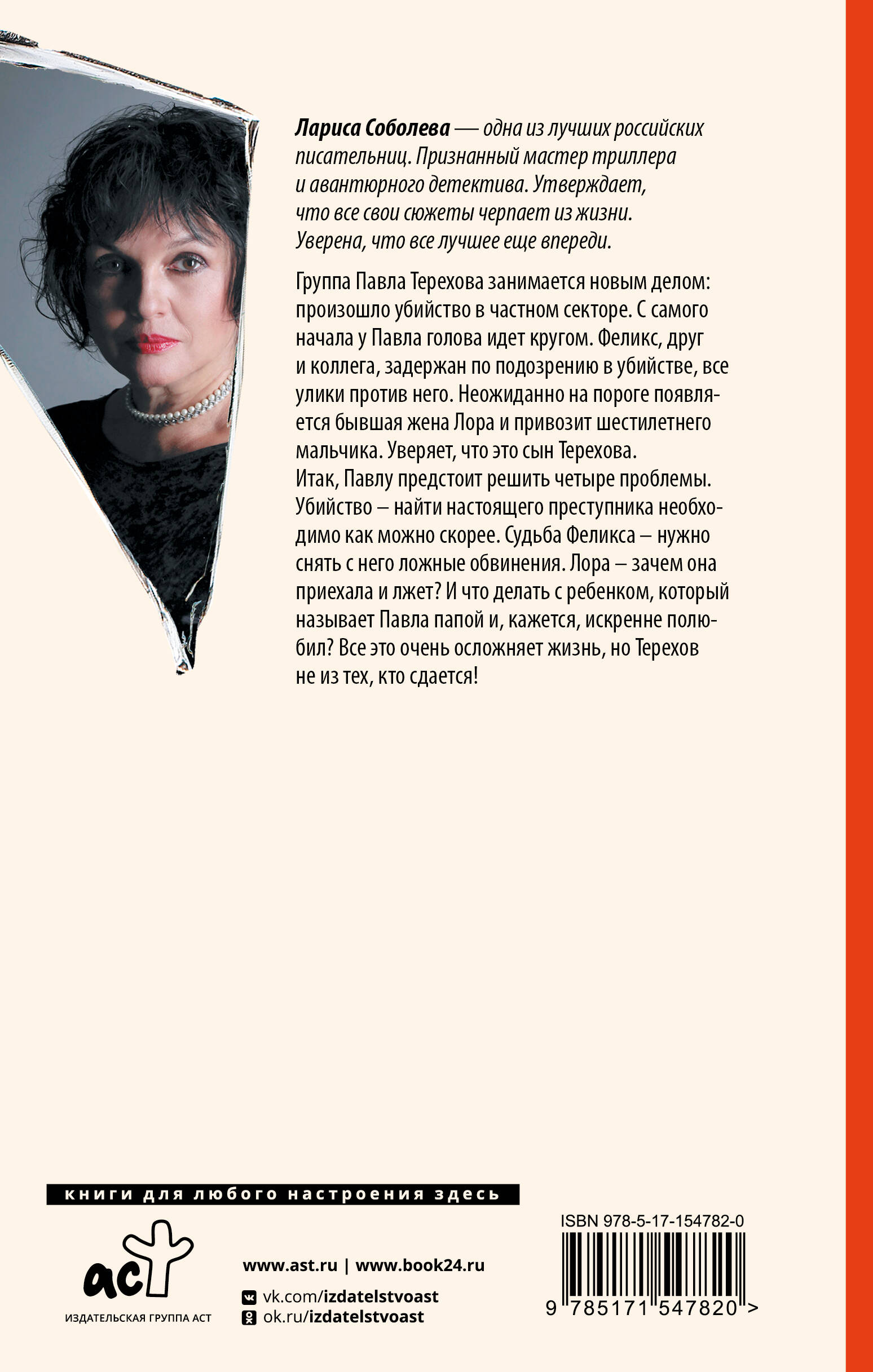 Группа Павла Терехова занимается новым делом: произошло убийство в частном секторе. С самого начала у Павла голова идет кругом. Феликс, друг и коллега, задержан по подозрению в убийстве, все улики против него. Неожиданно на пороге появляется бывшая жена Лора и привозит шестилетнего мальчика. Уверяет, что это сын Терехова. Итак, Павлу предстоит решить четыре проблемы. Убийство - найти настоящего преступника необходимо как можно скорее. Судьба Феликса - нужно снять с него ложные обвинения. Лора - зачем она приехала и лжет? И что делать с ребенком, который называет Павла папой и, кажется, искренне полюбил? Все это очень осложняет жизнь, но Терехов не из тех, кто сдается!| Издательство | ИЗДАТЕЛЬСТВО "АСТ" |