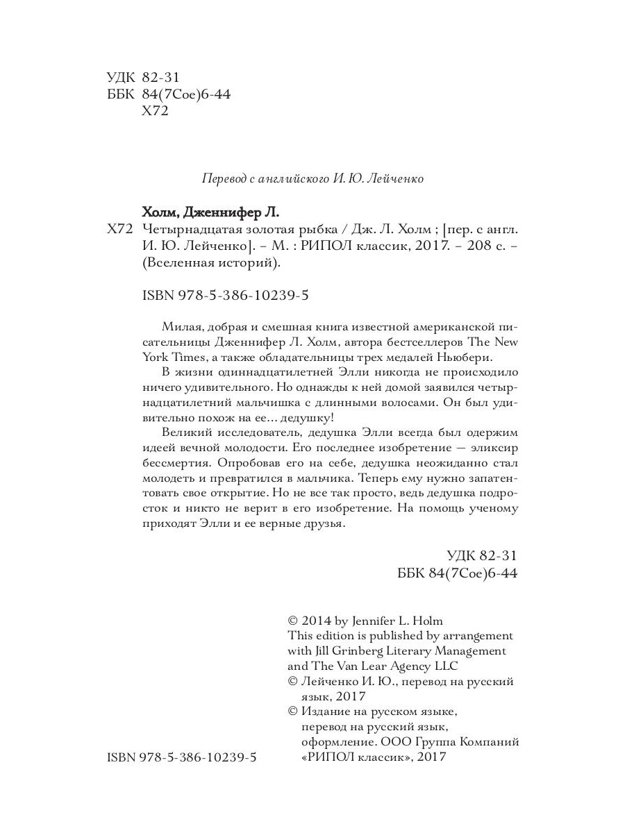 Милая, добрая и смешная книга известной американской писательницы Дженнифер Л. Холм, автора бестселлеров The New York Times, а также обладательницы трех медалей Ньюбери. В жизни одиннадцатилетней Элли никогда не происходило ничего удивительного. Но однажды к ней домой заявился четырнадцатилетний мальчишка с длинными волосами. Он был удивительно похож на ее... дедушку! Великий исследователь, дедушка Элли всегда был одержим идеей вечной молодости. Его последнее изобретение - эликсир бессмертия. Опробовав его на себе, дедушка неожиданно стал молодеть и превратился в мальчика. Теперь ему нужно запатентовать свое открытие. Но не все так просто, ведь дедушка подросток и никто не верит в его изобретение. На помощь ученому приходят Элли и ее верные друзья.| Издательство | Рипол Классик |