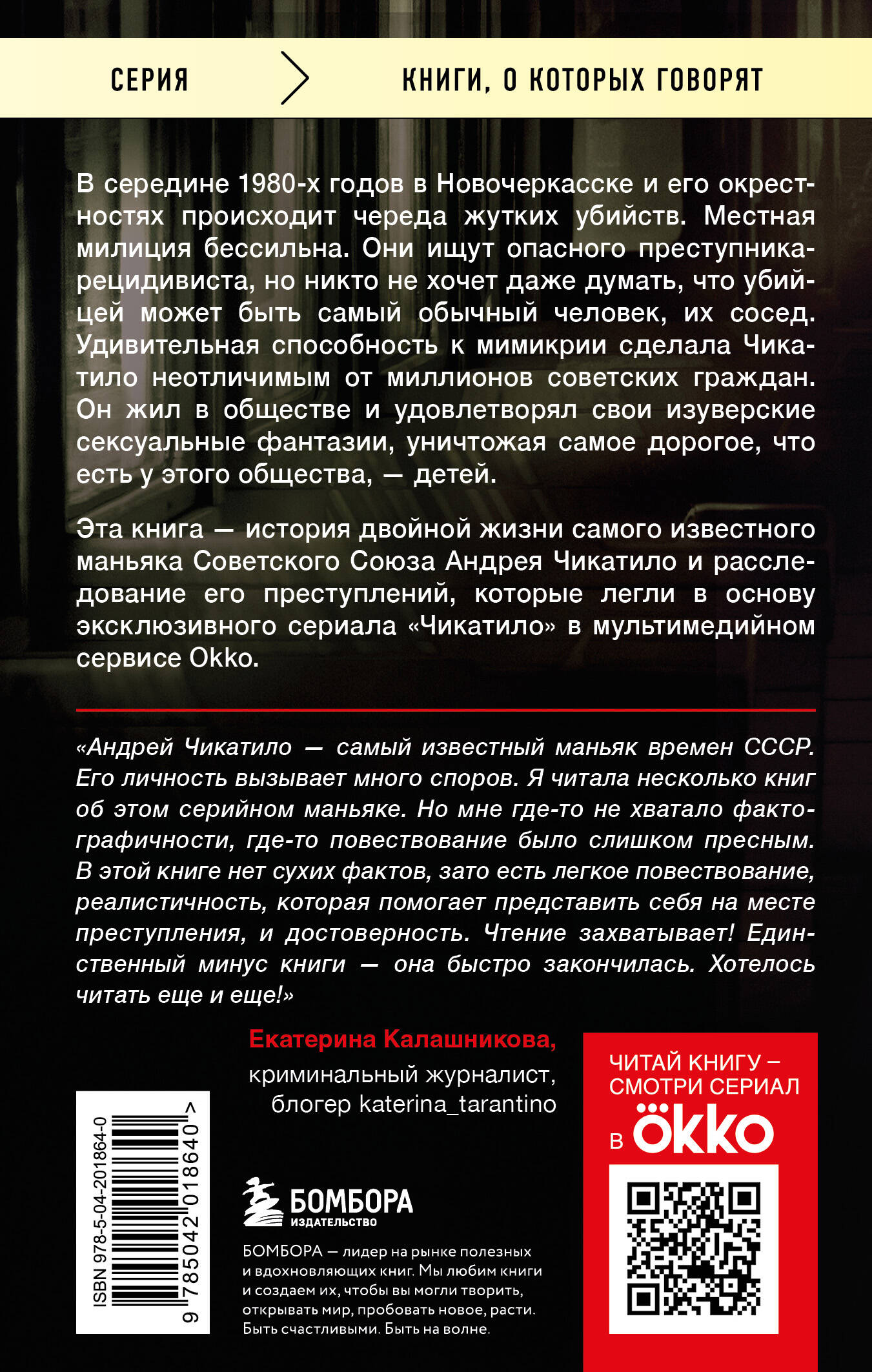 В середине 1980-х годов в Новочеркасске и его окрестностях происходит череда жутких убийств. Местная милиция бессильна. Они ищут опасного преступника, рецидивиста, но никто не хочет даже думать, что убийцей может быть самый обычный человек, их сосед. Удивительная способность к мимикрии делала Чикатило неотличимым от миллионов советских граждан. Он жил в обществе и удовлетворял свои изуверские сексуальные фантазии, уничтожая самое дорогое, что есть у этого общества - детей.| Издательство | ООО "Издательство "Эксмо" |