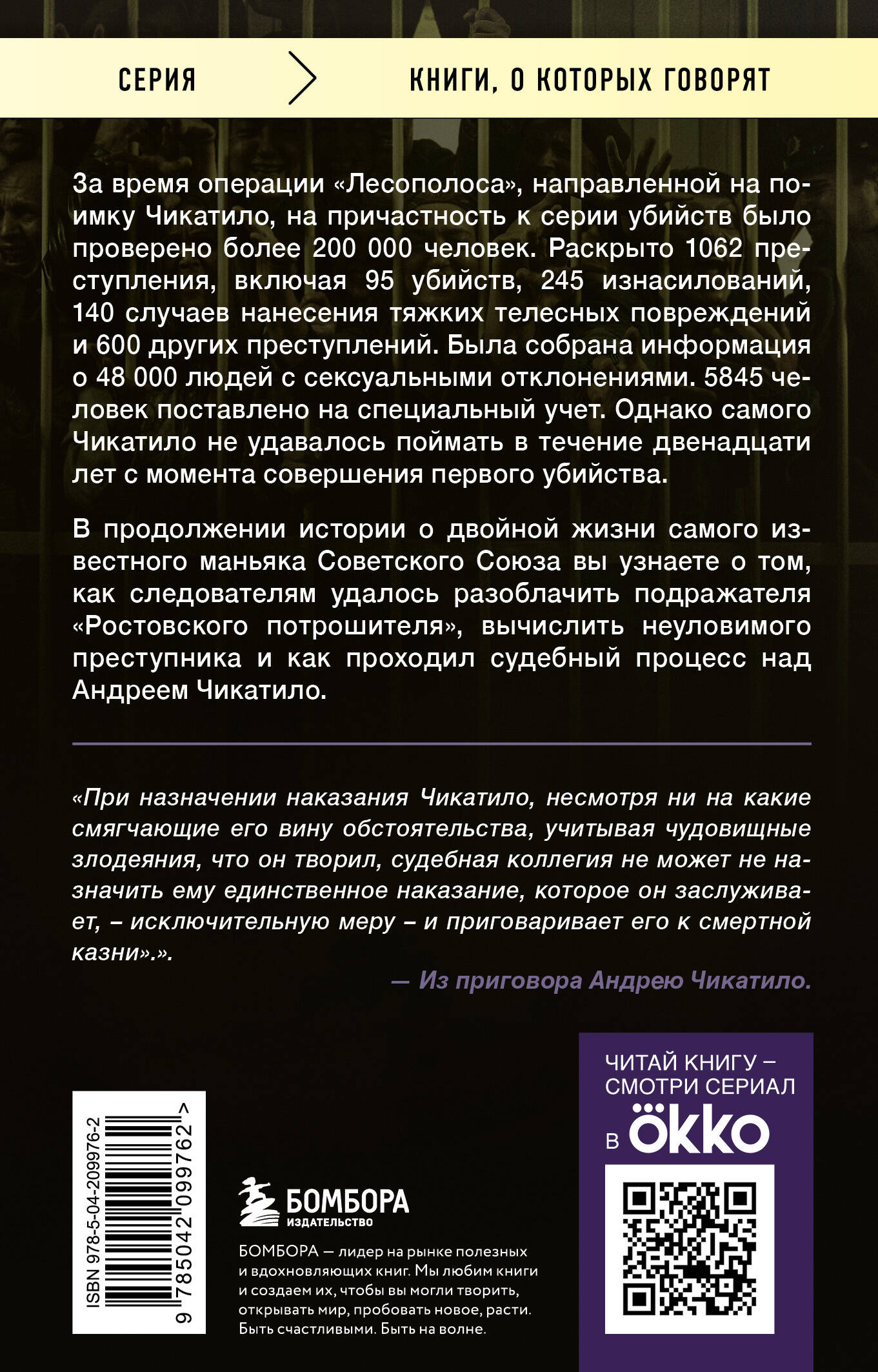 За время операции «Лесополоса», направленной на поимку Чикатило, на причастность к серии убийств было проверено более 200 000 человек. Раскрыто 1062 преступления, включая 95 убийств, 245 изнасилований, 140 случаев нанесения тяжких телесных повреждений и 600 других преступлений. Собрана информация на 48 000 человек с сексуальными отклонениями. 5845 человек поставлено на специальный учет. Однако самого Чикатило не удавалось поймать в течение двенадцати лет с момент совершения первого убийства. Продолжение истории о двойной жизни самого известного маньяка Советского Союза. Вы узнаете о том, как следователям удалось разоблачить подражателя «Ростовского потрошителя», вычислить неуловимого преступника и как проходил судебный процесс над Андреем Чикатило.| Издательство | ООО "Издательство "Эксмо" |