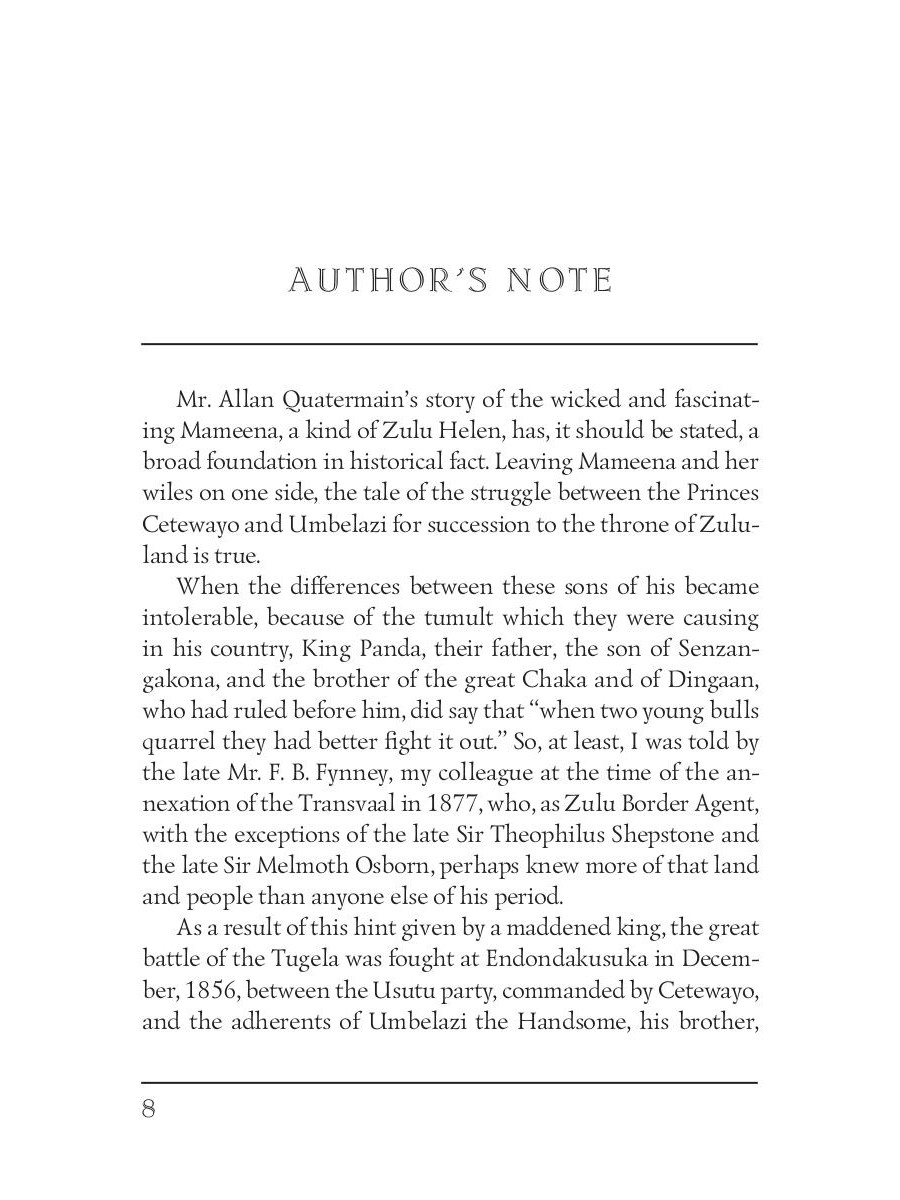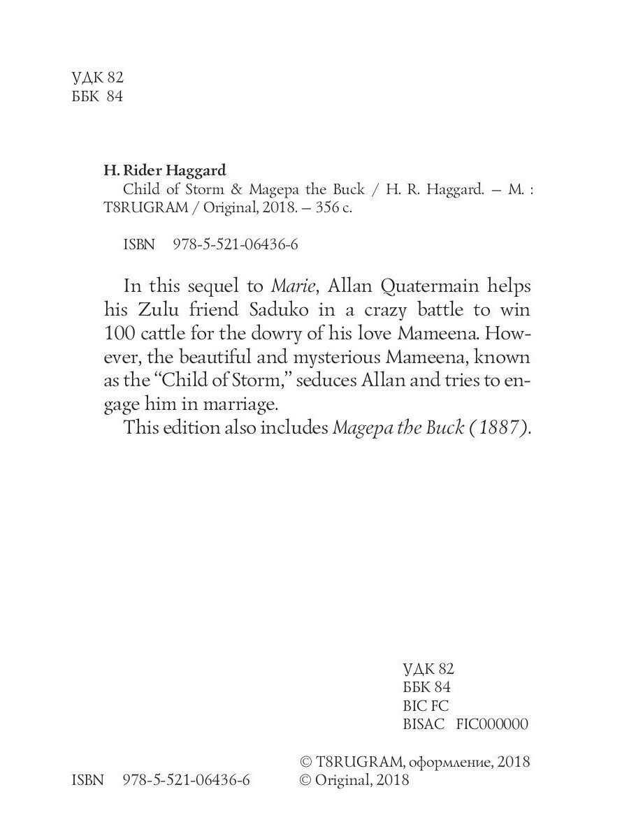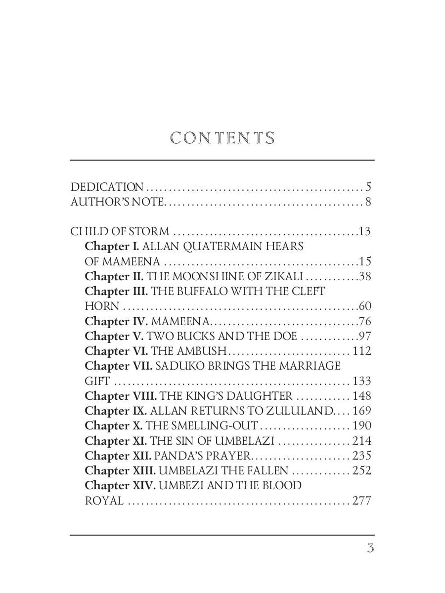In this sequel to Marie, Allan Quatermain helps his Zulu friend Saduko in a crazy battle to win 100 cattle for the dowry of his love Mameena. However, the beautiful and mysterious Mameena, known as the "Child of Storm", seduces Allan and tries to engage him in marriage. This edition also includes Magepa the Buck (1887).