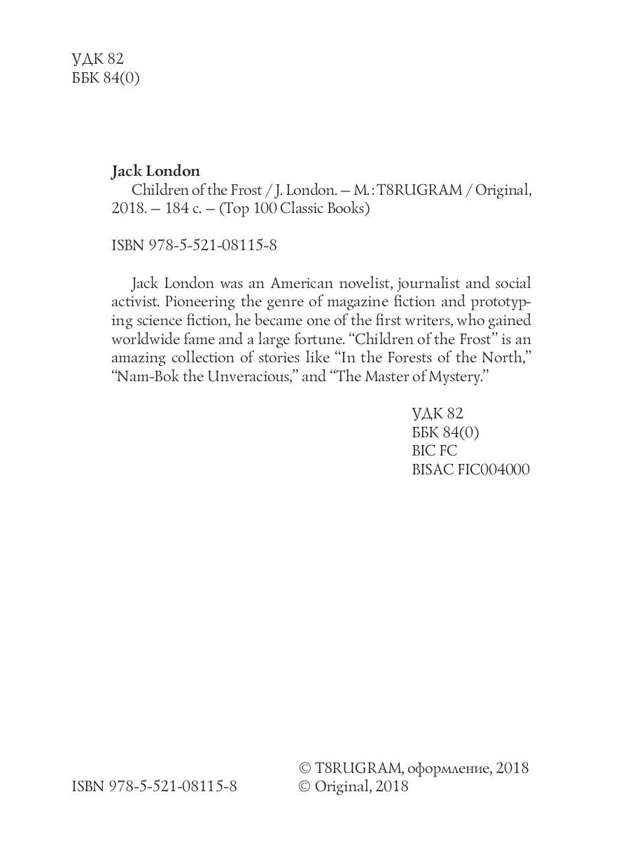 Jack London was an American novelist, journalist and social activist. Pioneering the genre of magazine fiction and prototyping science fiction, he became one of the first writers, who gained worldwide fame and a large fortune. "Children of the Frost" is an amazing collection of stories like "In the Forests of the North," "Nam-Bok the Unveracious," and "The Master of Mystery."| Издательство | Т8 RUGRAM |