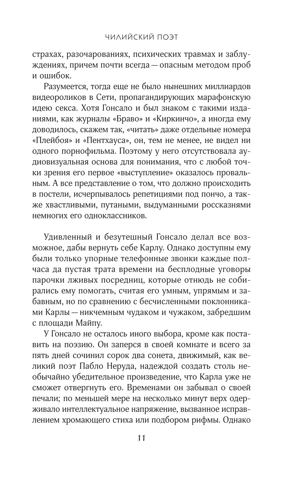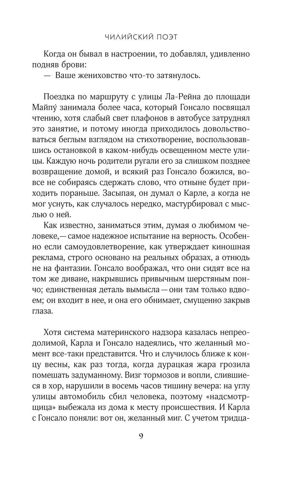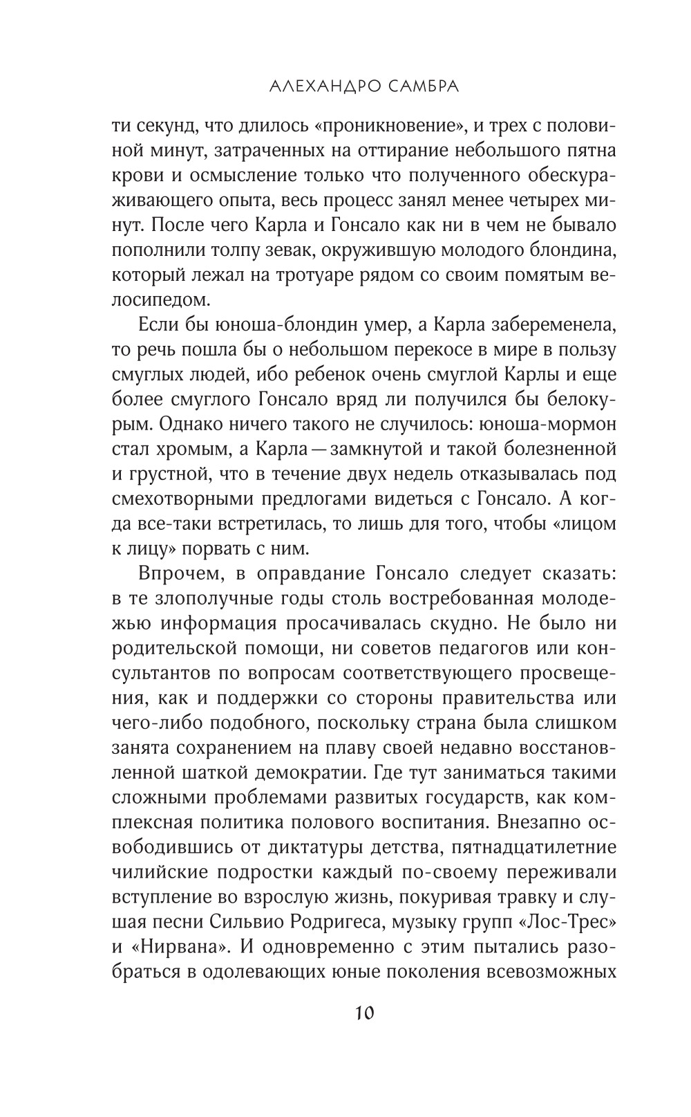 История об отцах и детях, амбициях и неудачах, а также о том, что значит создать семью. Это ответ на вопрос, что значит быть мужчиной в отношениях - партнером, отцом, отчимом, учителем, любовником, писателем и другом. Самбра полноценно раскрывает тему отношений на всех этапах. После случайной встречи в ночном клубе начинающий поэт Гонсало воссоединяется со своей первой любовью Карлой. И хотя их влечение друг к другу не остыло, изменилось многое другое: среди прочего, у Карлы теперь есть шестилетний сын Висенте. Вскоре все трое образуют счастливую семью - сводную семью, хотя в их языке нет такого слова. В конце концов амбиции тянут влюбленных в разные стороны, но все же маленький Висенте наследует любовь своего бывшего отчима к поэзии. Когда в восемнадцать лет Висенте встречает Пру, американскую журналистку, он побуждает ее писать о чилийских поэтах - не о знаменитых, мертвых, а о живых. Приведет ли это расследование Висенте и Гонсало обратно друг к другу? «Чилийский поэт» - роман о том, как мы выбираем наши семьи и как мы иногда предаем их. Это ответ на вопрос, что значит быть мужчиной в отношениях - партнером, отцом, отчимом, учителем, любовником, писателем и другом.| Издательство | Эксмо |