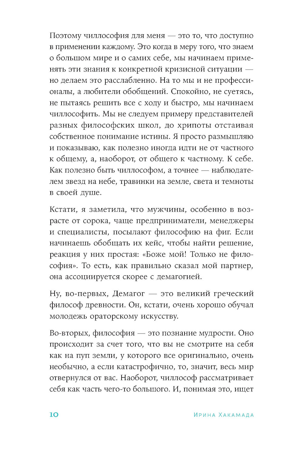 Когда привычный мир рушится и кажется, что земля уходит из-под ног, а хаос побеждает, главное - не суетиться. Во время турбулентности нужно учиться внутренней гибкости, осваивать умение обновляться, оставаясь собой. Один из лучших бизнес-тренеров России, публицист и общественный деятель Ирина Хакамада называет свой взгляд на жизнь и подход к решению проблем чиллософией. Это философия, то есть познание мудрости, но расслабленная (отсюда приставка «чилл»), и чтобы ее освоить, профессионалом быть не обязательно. Автор считает, что все мы способны понять закономерности происходящего в большом мире и применять эти знания в конкретной ситуации - спокойно и без лишней спешки даже во время кризиса. В своей книге Ирина Хакамада на примерах из собственной жизни показывает, как можно применить чиллософский подход, чтобы найти себя даже в самых непростых жизненных обстоятельствах и совершить «великий переход» от суеты к счастью.| Издательство | Альпина Паблишер |