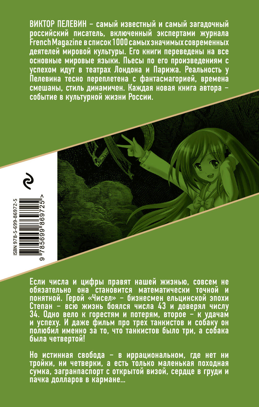 Преимущества В серии представлена лучшая проза самого известного и загадочного российского писателя Виктора Пелевина. Каждая его книга - настоящее событие в культурной жизни России! Особенности Он - Виктор Пелевин, и этим все сказано! Включен журналом French Magazine в список 1000 самых значимых современных деятелей мировой культуры. Его книги переведены на все основные мировые языки. Пьесы по его произведениям с успехом идут в театрах Лондона и Парижа. Реальность и фантасмагория, перемешанные исторические эпохи, динамичный и афористичный стиль - все это и многое другое в культовых сочинениях великого автора. Автор Виктор Пелевин в особых представлениях не нуждается. Лауреат многочисленных литературных премий, среди которых «Малый Букер» (1993) и «Национальный бестселлер» (2004). Легендарный и загадочный писатель, каждая книга которого - грандиозное событие в литературной жизни. «Жизнь очень странно устроена. Чтобы вылезти из колодца, надо в него упасть». - Виктор Пелевин «Жизнь насекомых» Если числа и цифры правят нашей жизнью, совсем не обязательно она становится математически точной и понятной. Герой «Чисел» - бизнесмен ельцинской эпохи Степан - всю жизнь боялся числа 43 и доверял числу 34. Одно вело к горестям и потерям, второе - к удачам и успеху. И даже фильм про трех танкистов и собаку он полюбил именно за то, что танкистов было три, а собака была четвертой! Но истинная свобода - в иррациональном, где нет ни тройки, ни четверки, а есть только маленькая походная сумка, загранпаспорт с открытой визой, сердце в груди и пачка долларов в кармане…