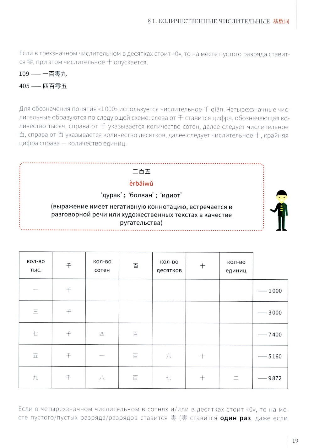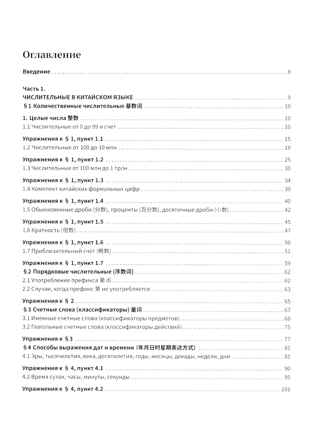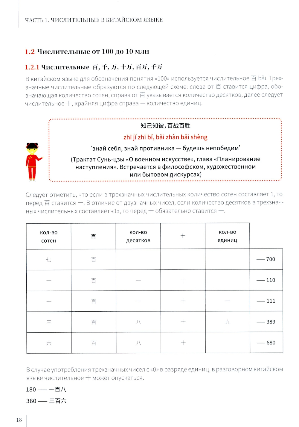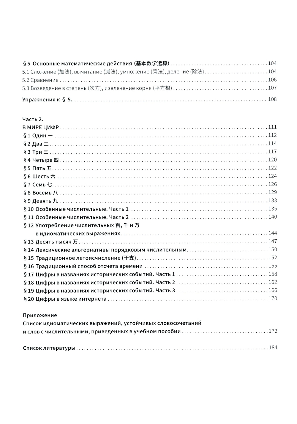 Числительные в китайском языке уникальное учебное пособие, которое поможет всем, кто изучает китайский язык, разобраться в том, как китайцы считают, как строят количественные, порядковые, дробные числительные, как сравнивают их, как используют так называемые счетные слова, как числа складывают и вычитают, умножают и делят. Пособие снабжено аудиокурсом и комплексами упражнений, необходимыми для отработки навыков перевода числительных с русского языка на китайский и наоборот. В этом пособии вы также найдете головокружительные экскурсы в историю и культуру Китая, где числительные, имеющие символическое значение, занимают особое место. Числительные это не только часть речи. Они играют важную роль и как существенная часть жизни современного китайского общества, входят в состав многих слов, устойчивых словосочетаний и фразеологизмов. Поэтому сориентироваться в сложном и в то же время увлекательном мире цифр настоя- тельная необходимость для любого, кто работает с китайским языком, зани- мается либо планирует заняться сотрудничеством с китайскими партнерами или просто стремится больше узнать о Китае.
