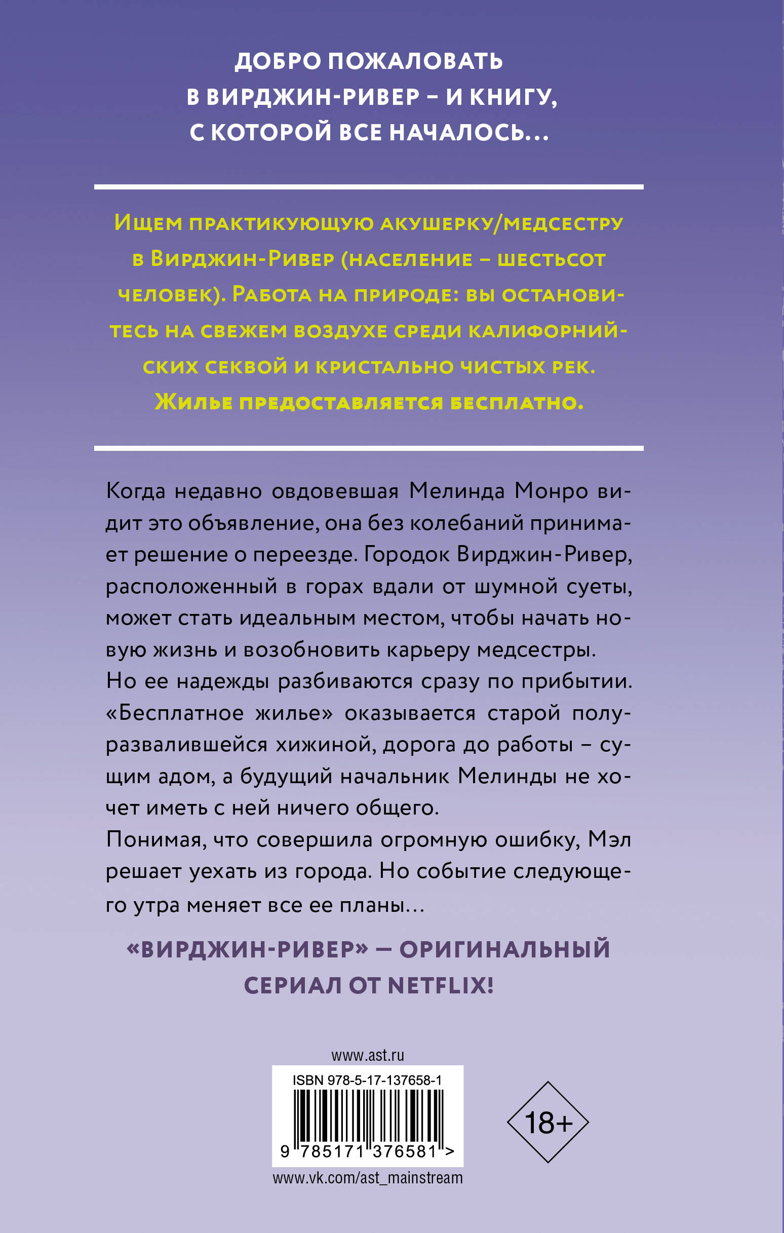Романтическая новинка от автора экранизированных бестселлеров New York Times Робин Карр. «Чистая река» - первая из 10 книг серии. По мотивам цикла снят популярный сериал от Netflix ("Вирджин-Ривер", 2019 год). Сериал уже получил 3 сезона, в планах шоураннера еще 2. Мелинда - молодая вдова, которая пытается пережить трагическую гибель мужа. Она работает медсестрой в Лос-Анджелесе, но в надежде на перемены решает перебраться в маленький городок Вирджин-Ривер. Там Мелинда знакомится с Джеком - бывшим морпехом и владельцем местного бара, - который полностью переворачивает ее жизнь. «Чистая река» очаровывает атмосферой маленького городка, где у каждого жителя есть свои секреты, а каждая история наполнена теплом и надеждой - на то, что все заслуживают любви, счастья и права на новую жизнь.| Издательство | ИЗДАТЕЛЬСТВО "АСТ" |