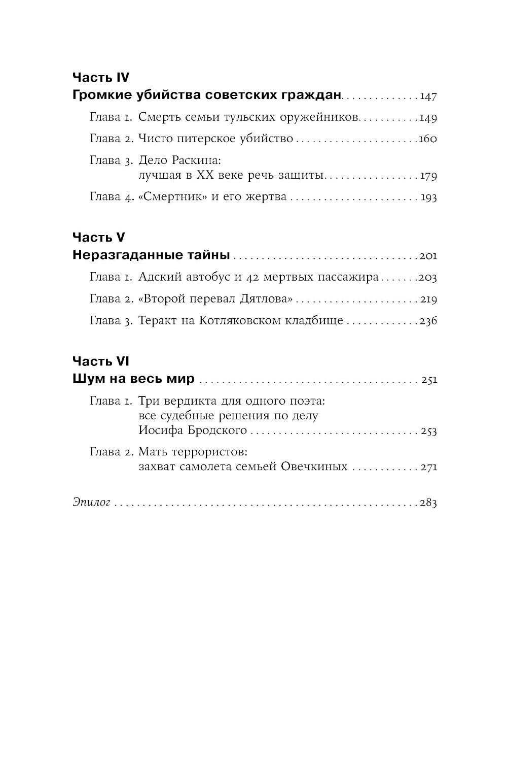 В новой книге известной правозащитницы и журналистки Евы Меркачевой, автора бестселлеров «Громкие дела», «Град обреченных» и «Кому на Руси сидеть хорошо», рассказывается об интереснейших уголовных делах - от прогремевших на всю Россию до засекреченных (до недавних пор). В нее вошли судебные разбирательства царских времен, включая суды над колдунами и отравителями. Впервые публикуются уникальные судебные материалы, связанные со Львом Толстым - мировым судьей, присяжным заседателем и... обвиняемым в убийстве. Вы узнаете о процессах над палачом лейтенанта Шмидта и о громком деле изобретателя терменвокса Термена, прочитаете о правосудии в блокадном и послеблокадном Ленинграде, а также о громких послевоенных судебных разбирательствах. Автор кропотливо собрала материалы об убийствах советских граждан в мирные годы, которые будоражили всю страну, - такие, как дело Раскина, теракт на Котляковском кладбище и загадочная гибель экспедиции на перевале Дятлова. В книгу вошли резонансные дела Иосифа Бродского о тунеядстве и многодетной семьи Овечкиных об угоне самолета в 1980-х. Книга написана в жанре судебных очерков и содержит уникальные архивные материалы, в том числе иллюстративные, многие из которых раньше не публиковались.| Издательство | Альпина Паблишер |