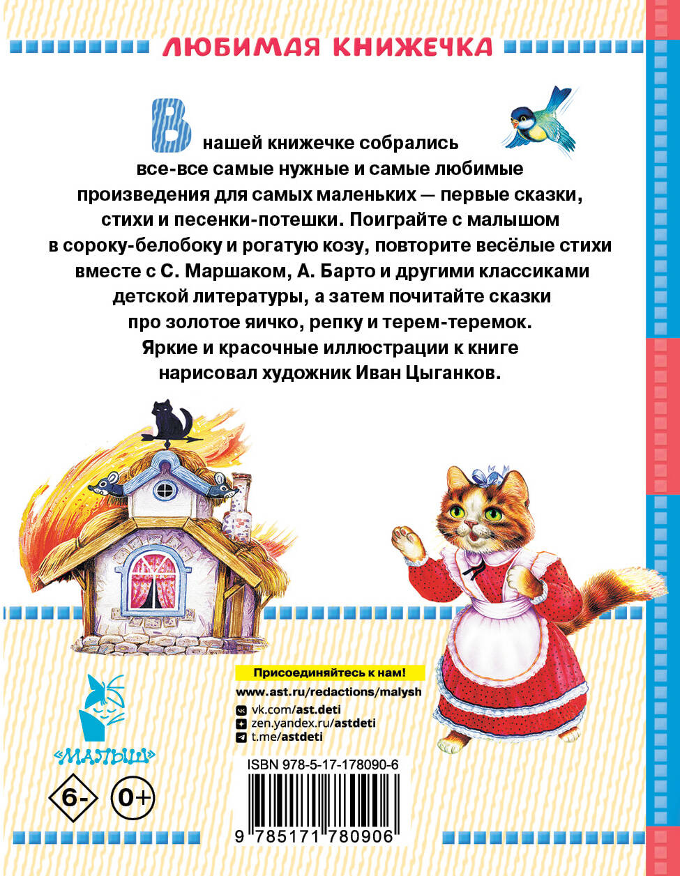 В нашей книжечке собрались все-все самые нужные и самые любимые произведения для самых маленьких - первые сказки, стихи и песенки-потешки. Поиграйте с малышом в сороку-белобоку и рогатую козу, повторите весёлые стихи вместе с С. Маршаком, А. Барто и другими классиками детской литературы, а затем почитайте сказки про золотое яичко, репку и терем-теремок. Яркие и красочные иллюстрации к книге нарисовал художник Иван Цыганков.| Издательство | Издательство "АСТ" |