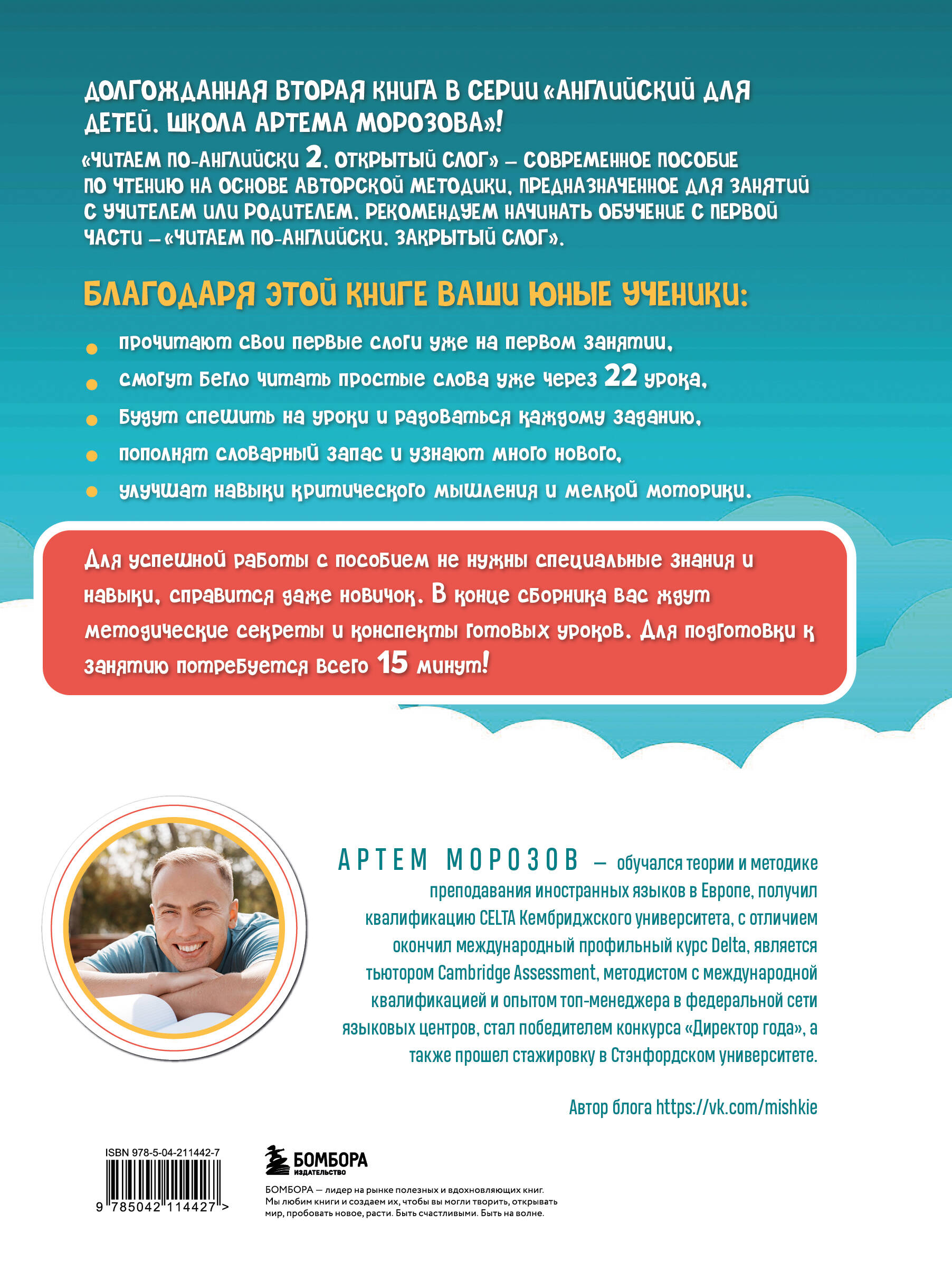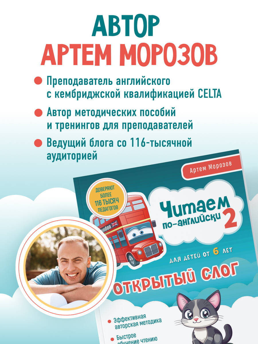 Долгожданная вторая часть цикла книг по чтению от новатора Артема Морозова! Более 116 тысяч педагогов и родителей уже доверяют авторской методике Артема, сертифицированного преподавателя с квалификацией CELTA Кембриджского Университета. С первых уроков книга увлекает юных учеников в мир чтения и прививает любовь к занятиям. Не нужно учить все буквы последовательно и использовать транскрипцию. Отказ от дополнительных символов убирает искусственный барьер и значительно ускоряет образовательный процесс, считает автор. В книге дается большое разнообразие упражнений, развивающих мелкую моторику, воображение и пространственное мышление. Результат не заставляет долго ждать - дети учатся читать быстро и с удовольствием. Рекомендации и советы по проведению уроков в игровом формате помогут каждому преподавателю и родителю заинтересовать детей и быстро научить их чтению. Главное, не забывайте хвалить ваших детей, ведь положительная мотивация - это путь к успеху!| Издательство | ООО "Издательство "Эксмо" |