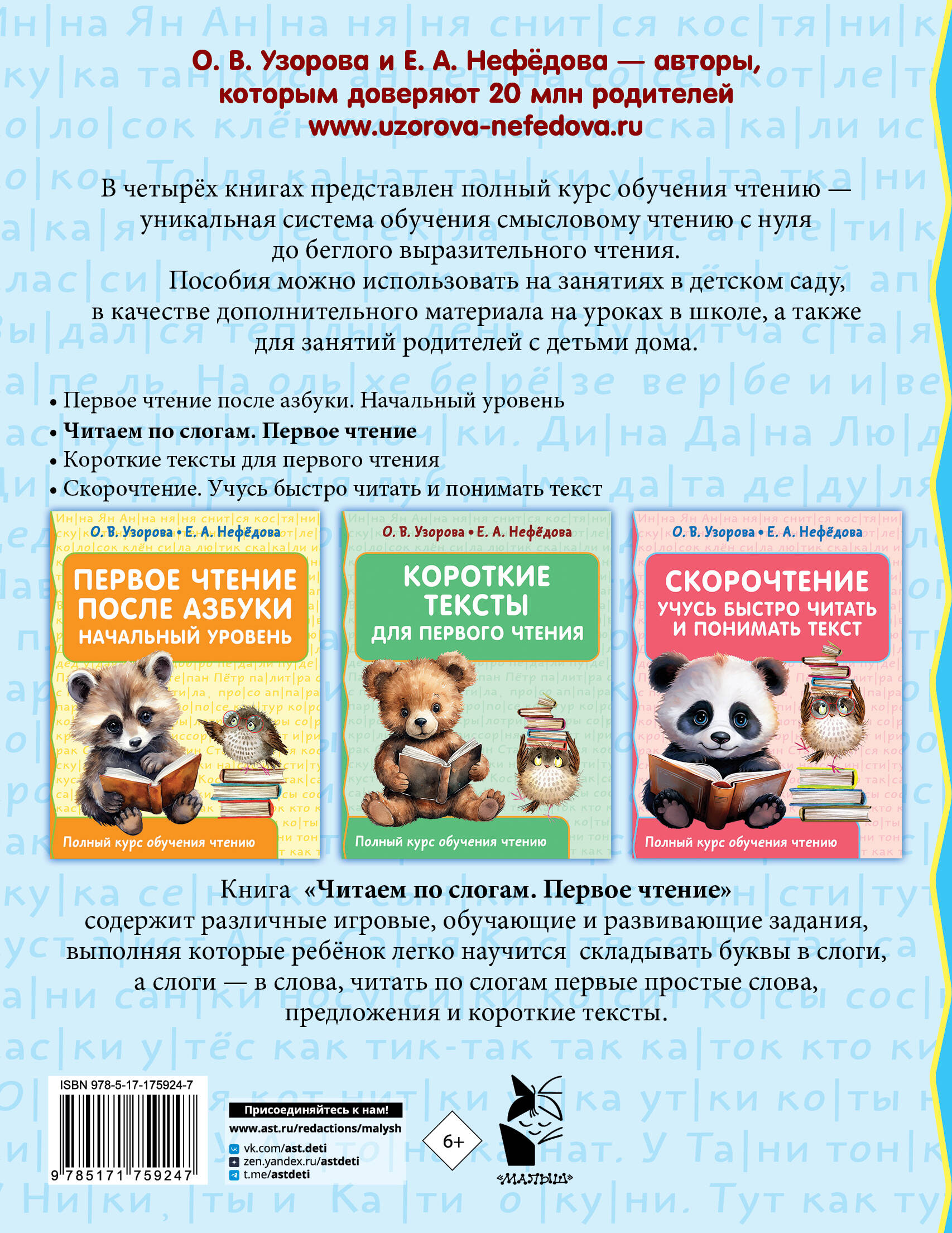 Пособие «Первая книга чтения по слогам» - вторая книга полного курса обучения чтению - уникальной системы обучения смысловому чтению с нуля до беглого выразительного чтения. Книга содержит различные игровые обучающие и развивающие задания, выполняя которые ребёнок легко научится читать по слогам более сложные по структуре слова, предложения и короткие тексты, улучшит навык чтения, разовьёт внимание, память, речь. • Первое чтение после азбуки. Начальный уровень • Первая книга чтения по слогам • Короткие тексты для первого чтения • «Скорочтение. Учусь быстро читать и понимать текст» • • Все, что поможет ребенку подготовиться к школе, стать успешным в учёбе, вы найдёте в книгах известных авторов О.В. Узоровой и Е.А. Нефёдовой: обучение чтению, читаем по слогам, развивающее чтение, развивающее обучение, подготовка к школе, раннее развитие, дошкольное обучение.| Издательство | Издательство "АСТ" |
