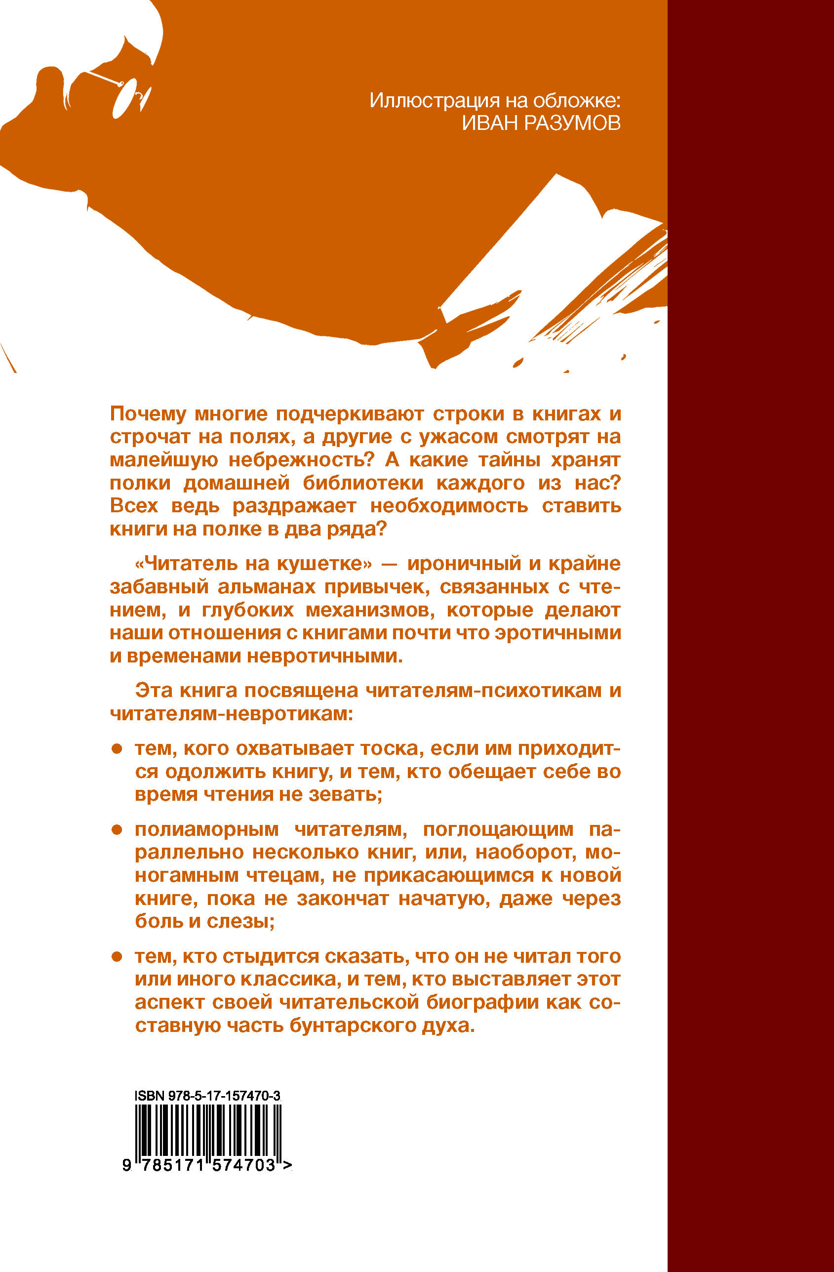 Почему многие подчеркивают строки в книгах и строчат на полях, а другие с ужасом смотрят на малейшую небрежность? А какие тайны хранят полки домашней библиотеки каждого из нас? Всех ведь раздражает необходимость ставить книги на полке в два ряда? "Читатель на кушетке" - ироничный и забавный альманах привычек, связанных с чтением, и глубоких механизмов, которые делают наши отношения с книгами почти что эротичными и временами невротичными. Эта книга посвящена читателям-психотикам и читателям-невротикам: • тем, кого охватывает тоска, если им приходится одолжить книгу, и тем, кто обещает себе во время чтения не зевать; • полиаморным читателям, поглощающим параллельно несколько книг, или, наоборот, моногамным чтецам, не прикасающимся к новой книге, пока не закончат начатую, даже через боль и слезы; • тем, кто стыдится сказать, что он не читал того или иного классика, и тем, кто выставляет этот аспект своей читательской биографии как составную часть бунтарского духа.| Издательство | Издательство "АСТ" |