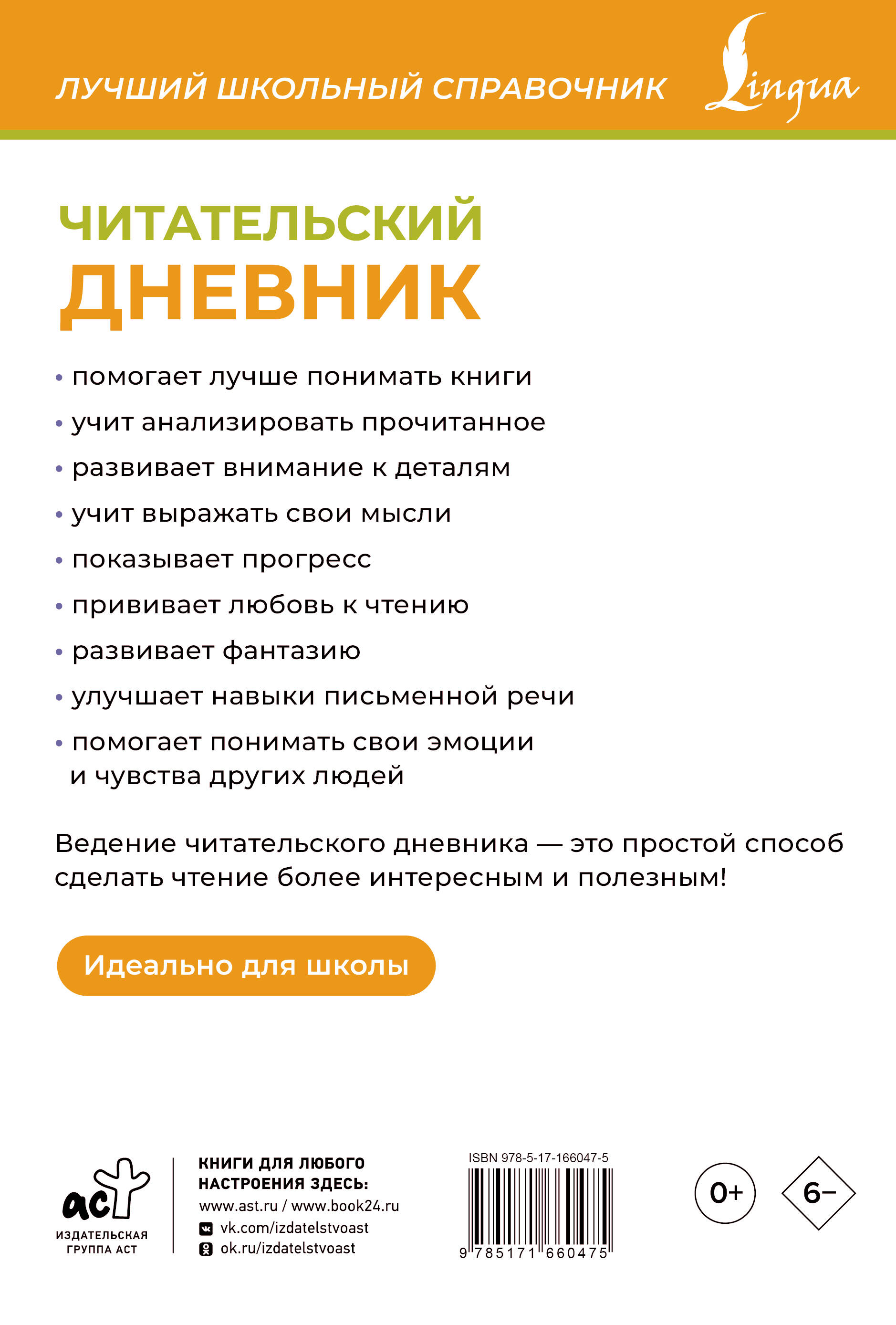 Читательский дневник - это тетрадь для записи мыслей и впечатлений о прочитанных книгах. Ведение такого дневника помогает лучше запоминать содержание книги и учиться пересказывать сюжет, развивая память и навыки письма. Это также способствует глубокому пониманию текста и умению выделять важные моменты. Читательский дневник делает чтение более увлекательным. В него можно записывать любимые моменты, описывать персонажей и делиться своими впечатлениями. Со временем дневник станет ценным архивом, который поможет легко вспомнить прочитанные книги. Данное пособие способствует развитию любви к литературе и улучшению читательских умений. Это издание отличает лаконичный дизайн, белая бумага, ламинированная обложка и оптимальный размер. Благодаря этому ребенку будет комфортно пользоваться таким дневником. Издание подойдет для детей школьного возраста.| Издательство | Издательство "АСТ" |