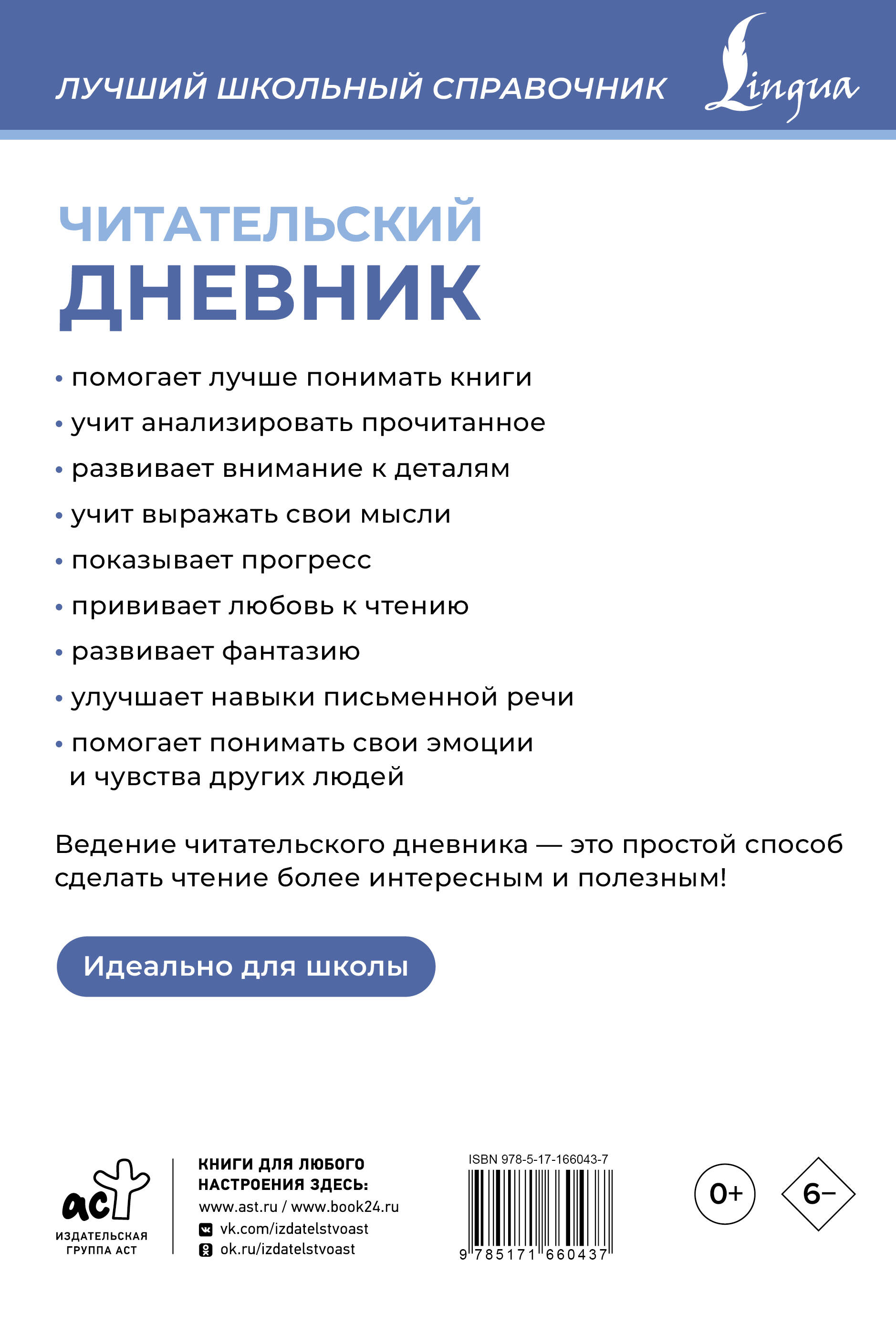 Читательский дневник - это тетрадь для записи мыслей и впечатлений о прочитанных книгах. Ведение такого дневника помогает лучше запоминать содержание книги и учиться пересказывать сюжет, развивая память и навыки письма. Это также способствует глубокому пониманию текста и умению выделять важные моменты. Читательский дневник делает чтение более увлекательным. В него можно записывать любимые моменты, описывать персонажей и делиться своими впечатлениями. Со временем дневник станет ценным архивом, который поможет легко вспомнить прочитанные книги. Данное пособие способствует развитию любви к литературе и улучшению читательских умений. Это издание отличает лаконичный дизайн, белая бумага, ламинированная обложка и оптимальный размер. Благодаря этому ребенку будет комфортно пользоваться таким дневником. Издание подойдет для детей школьного возраста.| Издательство | Издательство "АСТ" |