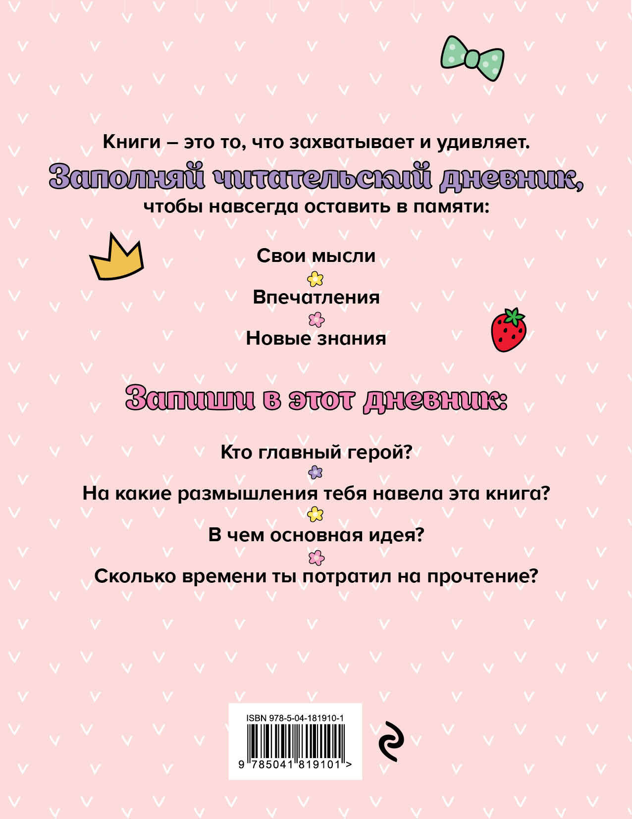 Это дневник для тех, кто: - очень любит книги; - много читает; - хочет навсегда сохранить впечатление от каждой книги. Под обложкой вашего ребенка ждет красочный блок, который содержит: - календарь чтения; - анкету для каждой книги; - место, где можно записать все самое интересное и полезное, и многое другое. Технические параметры: - удобный формат А5 (162×210 мм); - 64 страницы на офсетной бумаге; - стильная обложка из переплетного картона; - яркий блок для тех, кто хочет выразить свою индивидуальность.| Издательство | ООО "Издательство "Эксмо" |