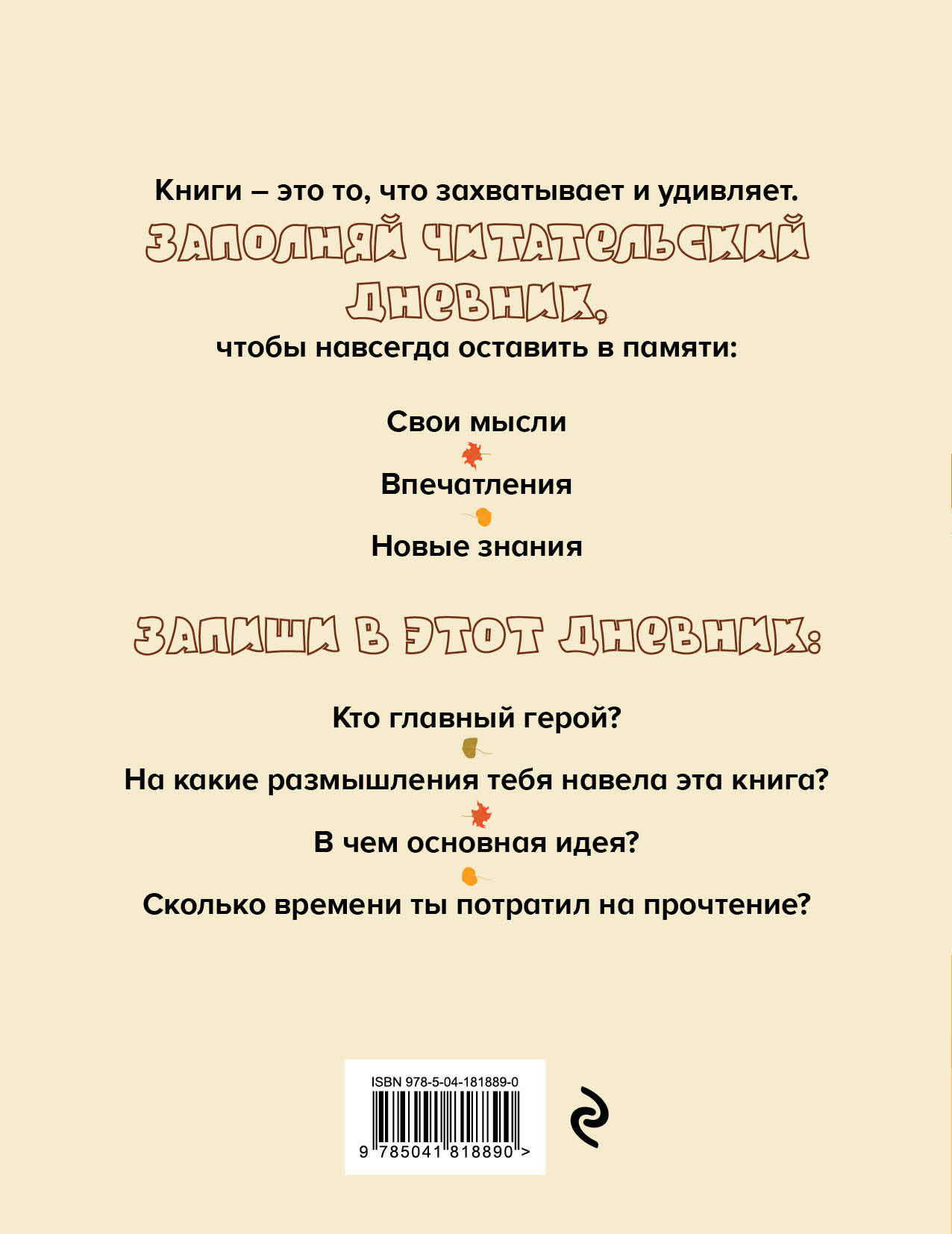 Это дневник для тех, кто: - очень любит книги; - много читает; - хочет навсегда сохранить впечатление от каждой книги. Под обложкой вашего ребенка ждет красочный блок, который содержит: - календарь чтения; - анкету для каждой книги; - место, где можно записать все самое интересное и полезное, и многое другое. Технические параметры: - удобный формат А5 (162×210 мм); - 64 страницы на офсетной бумаге; - стильная обложка из переплетного картона; - яркий блок для тех, кто хочет выразить свою индивидуальность.| Издательство | ООО "Издательство "Эксмо" |