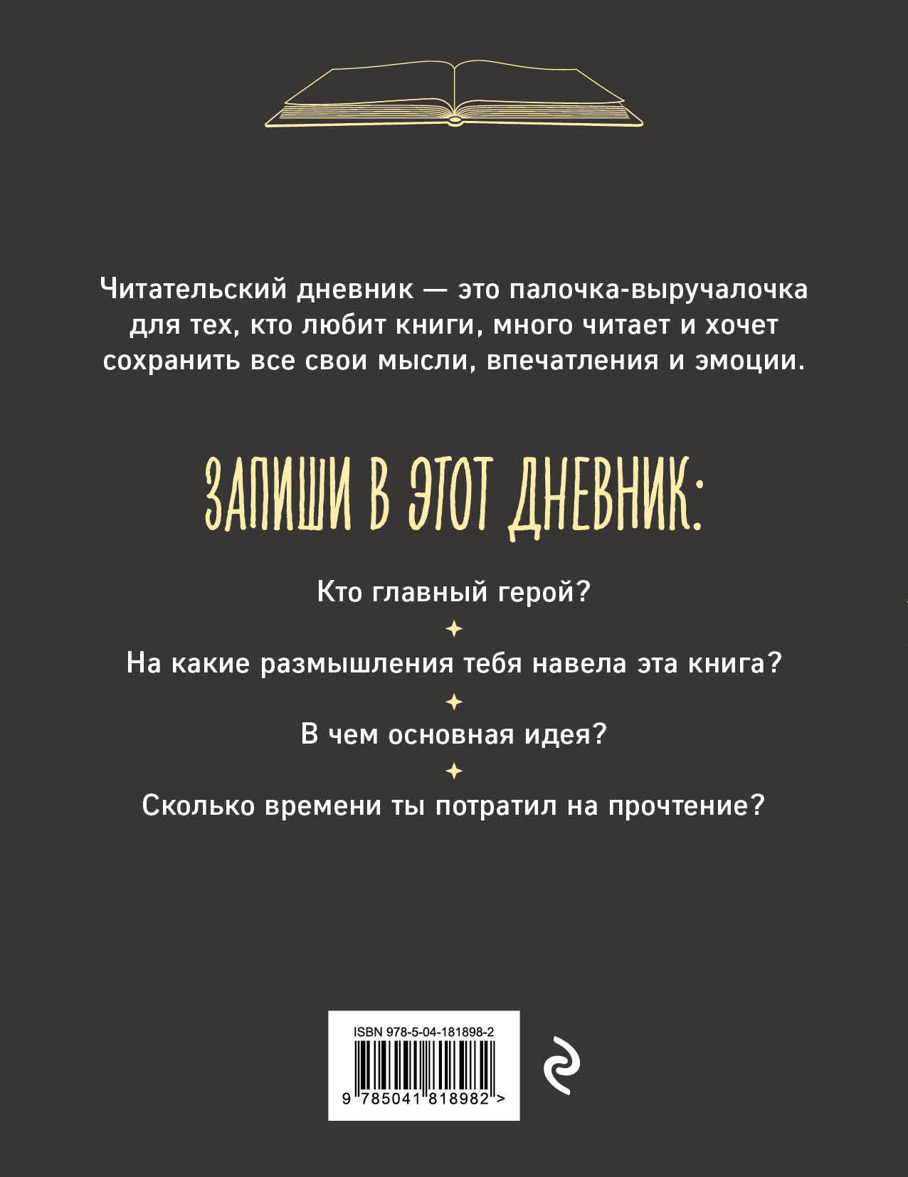 Если вы любите книги, много читаете и хотите навсегда сохранить впечатления о каждой книге, то читательский дневник - это палочка-выручалочка для вас! В дневнике вас ждут: - анкета для каждой книги; - календарь чтения; - много пустых строк для записи самого интересного и важного; - место для списка книг, которые планируете прочитать; - место для списка любимых авторов; - место для списка любимых книг и многое другое. Технические параметры: - удобный формат А5 (162×210 мм); - 96 страниц на офсетной бумаге; - стильная обложка из переплетного картона. Материалы, из которых выполнен дневник, позволят сохранить его содержимое в неизменном виде на долгие годы. Дневник станет отличным подарком для настоящего книголюба.| Издательство | ООО "Издательство "Эксмо" |