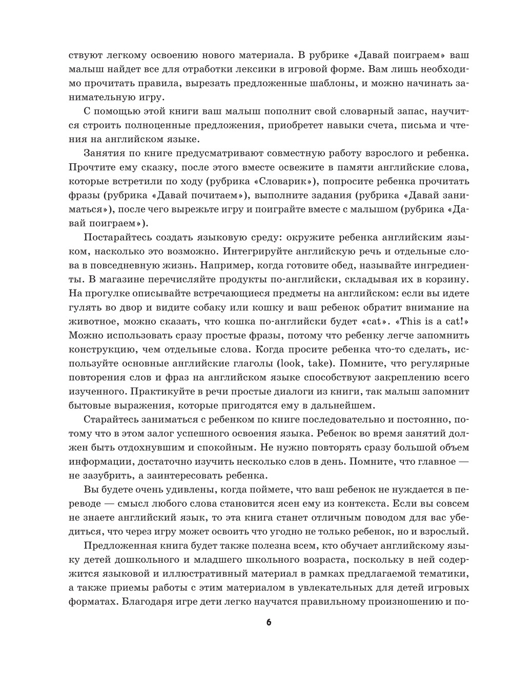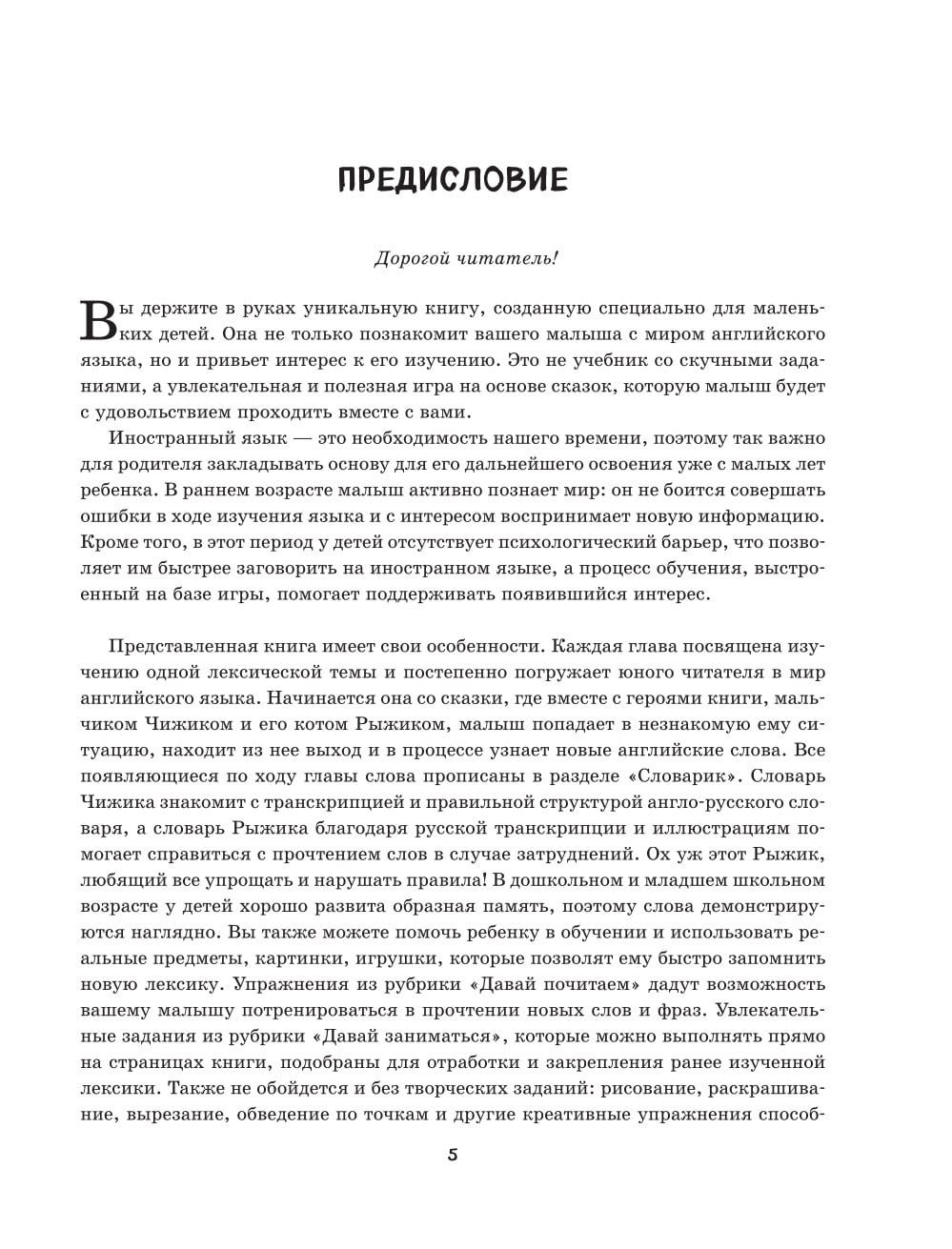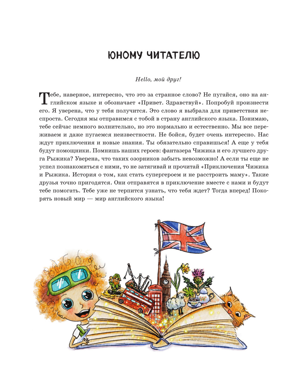 Хотите привить любовь ребенку к английскому языку еще в дошкольном возрасте? Тогда познакомьте малыша с нашими героями Чижиком и Рыжиком. Вместе с ними ваш ребенок: - освоит алфавит, основные слова и фразы по разным лексическим темам; - с помощью игры сформирует навыки чтения и письма на английском языке; - научится называть цвета и считать на английском языке; - познакомится с базовыми конструкциями, которые помогут ему говорить о себе на английском языке; - сможет развить креативность и логическое мышление с помощью полезных упражнений, головоломок и раскрасок. Внутри: яркие иллюстрации, веселые задания и игры, интерактивные упражнения, раскраски и аппликации. Эта книга разработана психологом Натальей Райнхардт и преподавателем иностранных языков с многолетним опытом Татьяной Лозовенко для того, чтобы ваш ребенок смог сделать первые уверенные шаги в изучении английского языка.| Издательство | Эксмо |