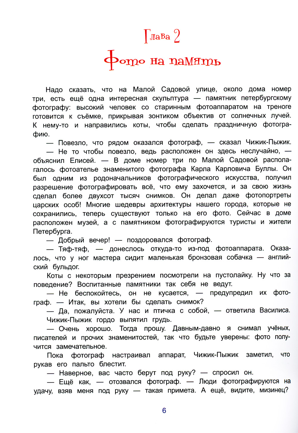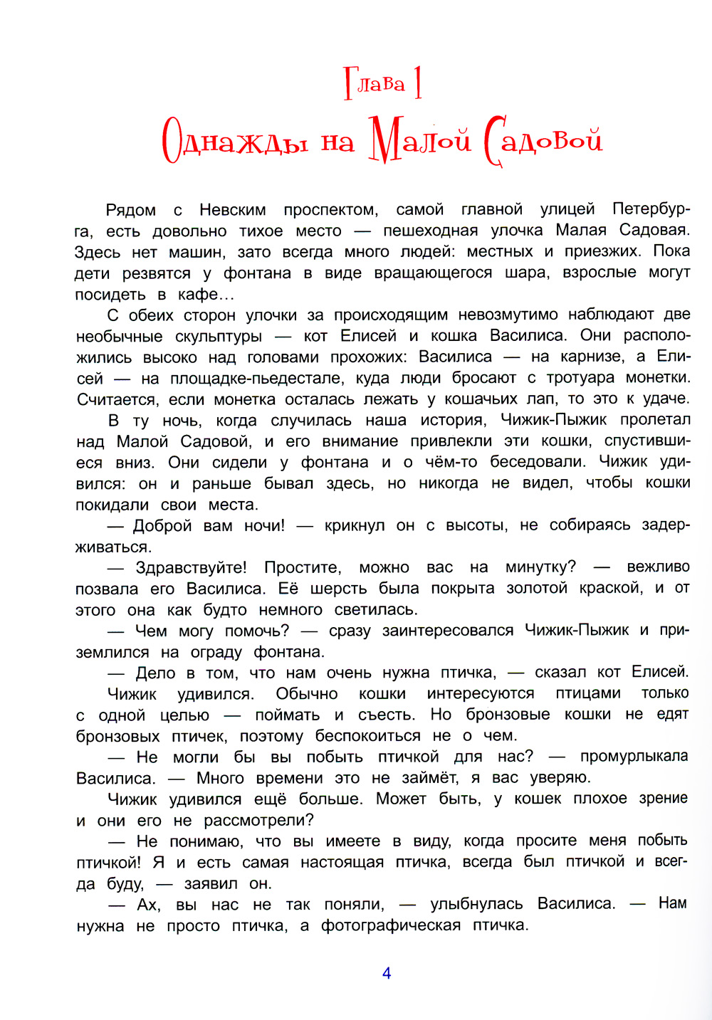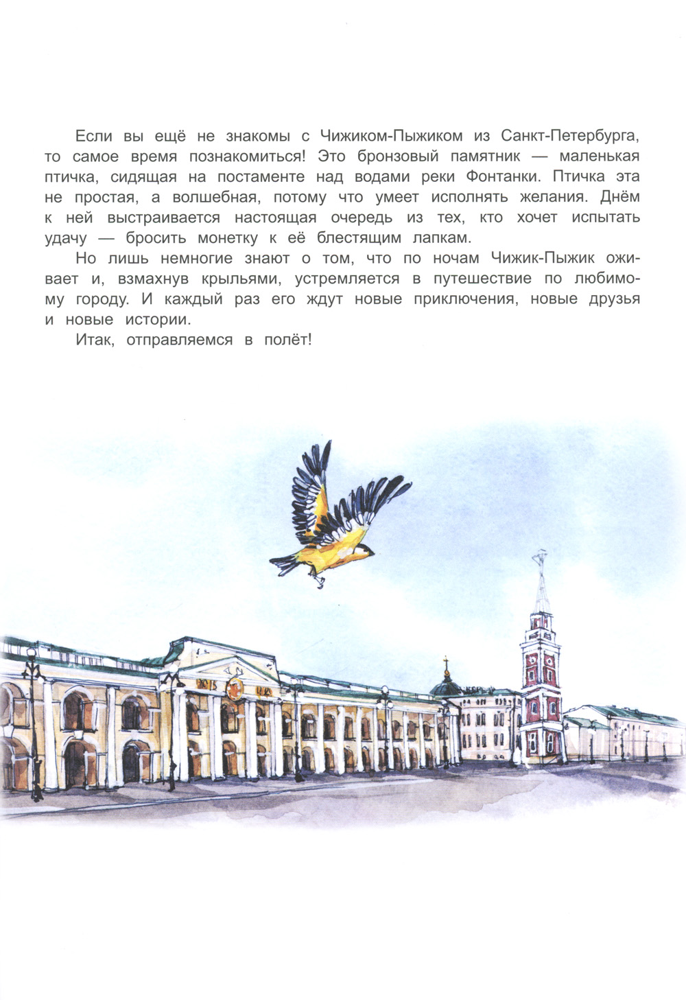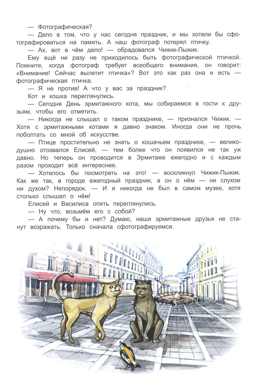 У всем известного знатока Петербурга и искателя приключений Чижика-Пыжика опять выдалась беспокойная ночка. Сначала ему пришлось поработать птичкой, а это очень ответственная задача даже для Чижика. Затем он совершил путешествие во времени на семьдесят пять лет назад, чтобы узнать о подвиге ленинградских кошек. И, наконец, попал в «место для уединения», где однако вовсе не страдал от одиночества, а, напротив, узнал много интересного и нашёл нового друга. Им оказался эрмитажный кот Василий, который познакомил Чижика с тайнами Древнего Египта, заставил поломать голову над загадкой золотого павлина и даже помог ему принять участие в самом настоящем рыцарском турнире! Книга предназначена для семейного и самостоятельного чтения детям 9-12 лет.| Издательство | Антология |