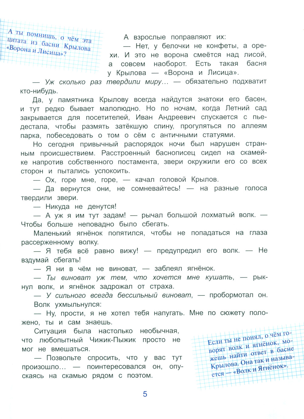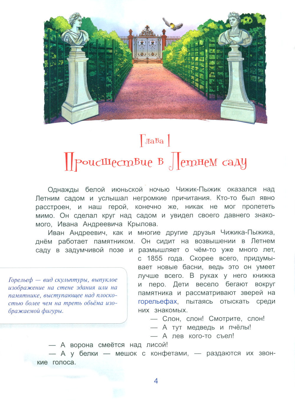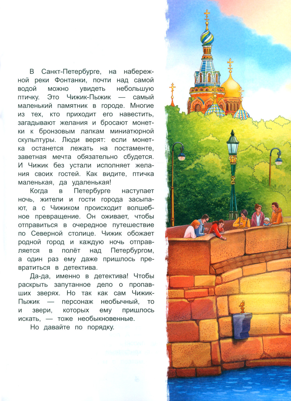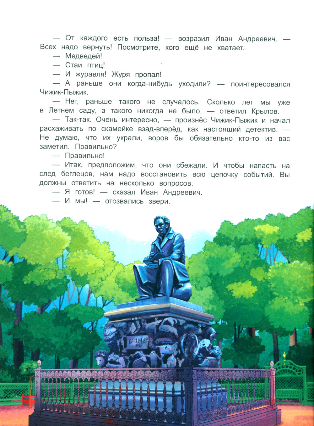 Чижик-Пыжик, большой эрудит и знаток Петербурга, снова в гуще событий! На этот раз его помощь потребовалась классику русской литературы Ивану Андреевичу Крылову, которого подвели подопечные: хвостатые, лохматые, пернатые, а ещё очень любознательные и разговорчивые любимцы всех горожан и туристов. Белая ночь коротка, но Чижику в роли петербургского Шерлока Холмса хватит времени, чтобы облететь весь центр Северной столицы и найти разгадку происшествия в Летнем саду. Итак, Чижик начинает расследование…