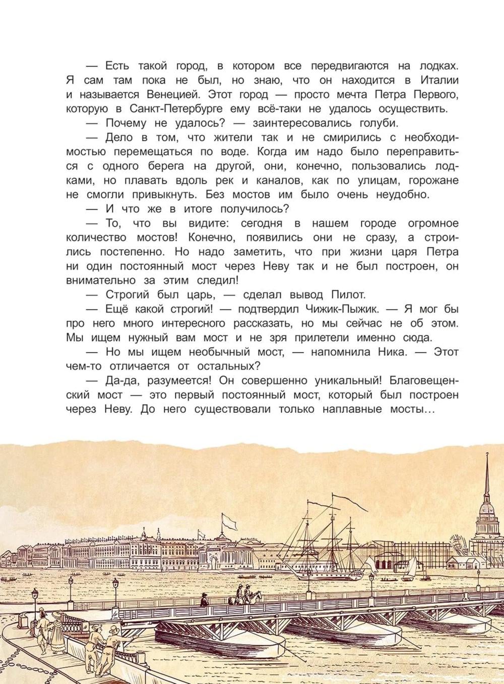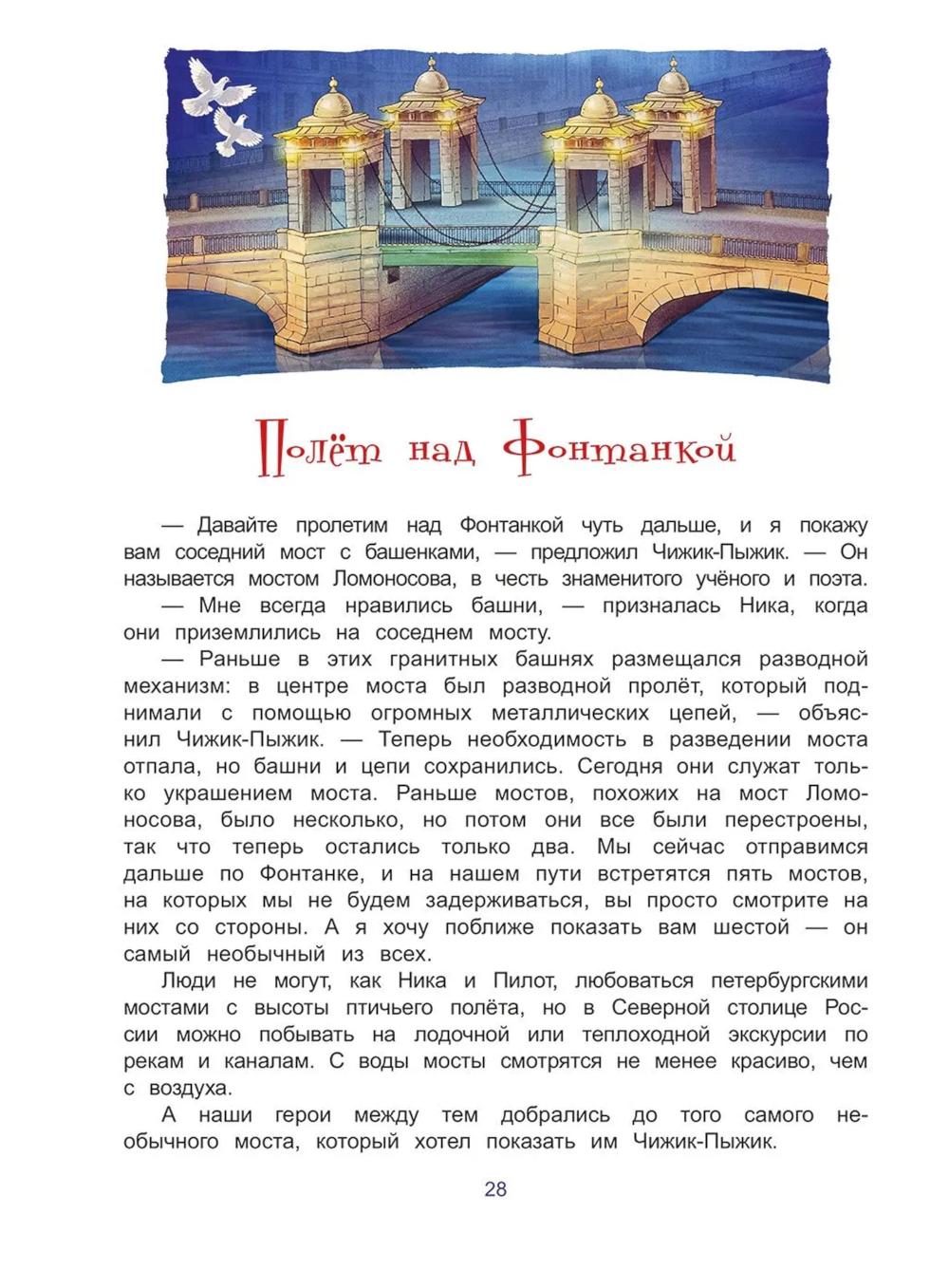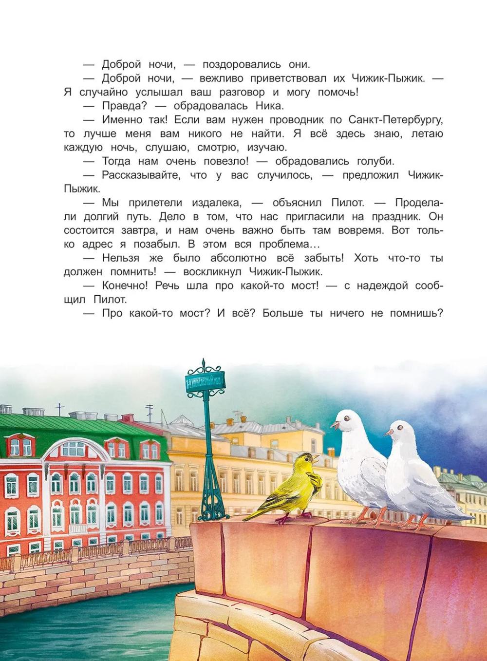 Книга входит в серию познавательной литературы для детей младшего и среднего школьного возраста «Города и чудеса». Бронзовый Чижик-Пыжик, привычно устроившийся на каменном постаменте над волнами Фонтанки, по долгу службы исполняет желание каждого, кто сумеет бросить монетку к его лапкам. Но однажды ему придётся оставить свой пост, чтобы помочь двум белым голубям, попавшим в непростую ситуацию. Нике и Пилоту необходимо найти среди сотен петербургских мостов один-единственный, с которым связана какая-то тайна… Книга предназначена для семейного и самостоятельного чтения детям 9-12 лет.| Издательство | Антология |