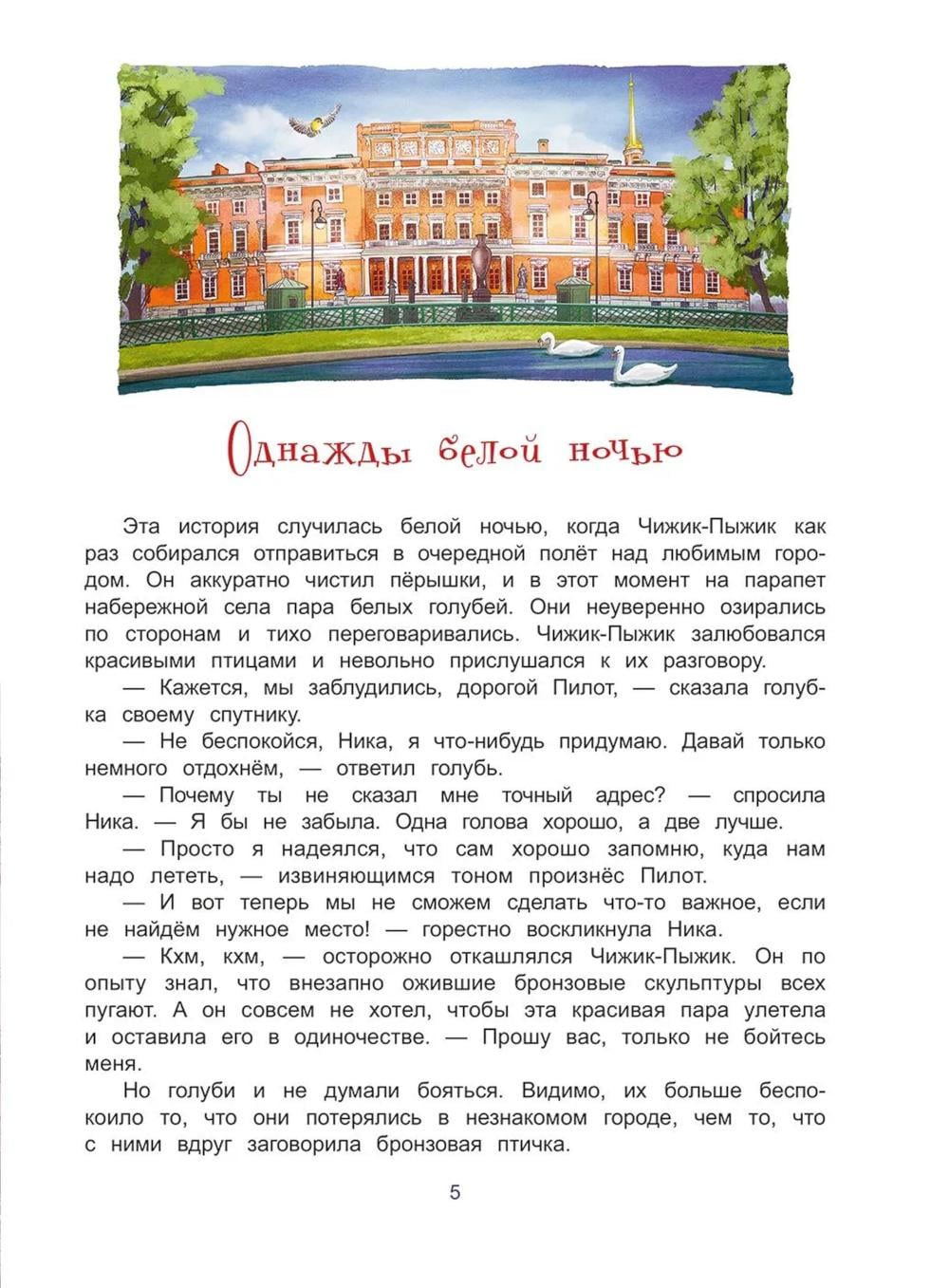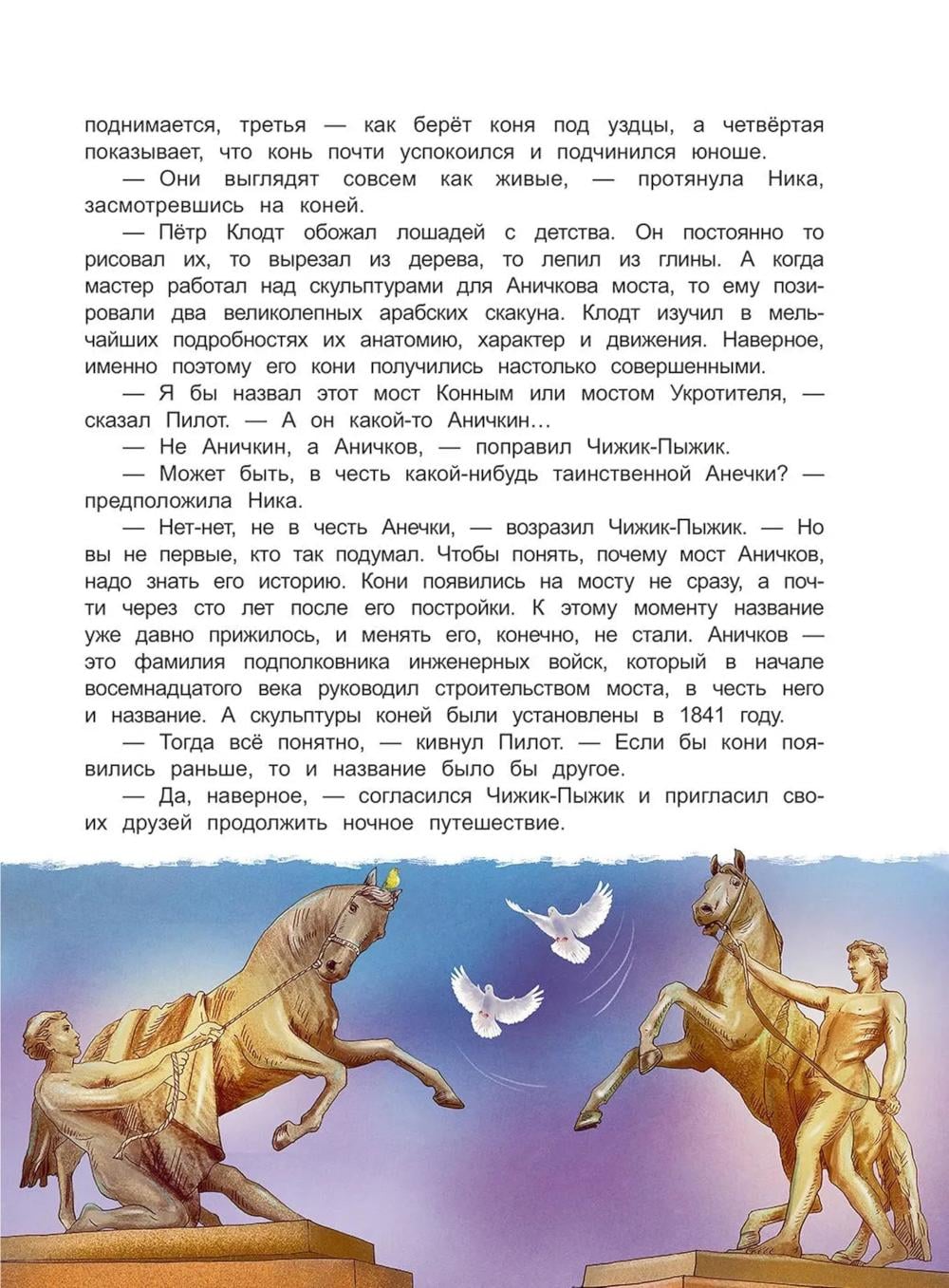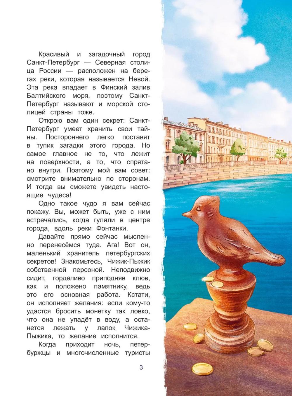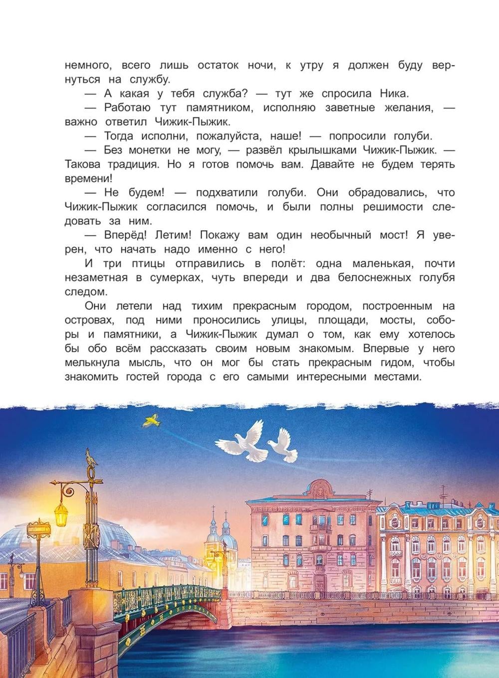 Книга входит в серию познавательной литературы для детей младшего и среднего школьного возраста «Города и чудеса». Бронзовый Чижик-Пыжик, привычно устроившийся на каменном постаменте над волнами Фонтанки, по долгу службы исполняет желание каждого, кто сумеет бросить монетку к его лапкам. Но однажды ему придётся оставить свой пост, чтобы помочь двум белым голубям, попавшим в непростую ситуацию. Нике и Пилоту необходимо найти среди сотен петербургских мостов один-единственный, с которым связана какая-то тайна… Книга предназначена для семейного и самостоятельного чтения детям 9-12 лет.| Издательство | Антология |