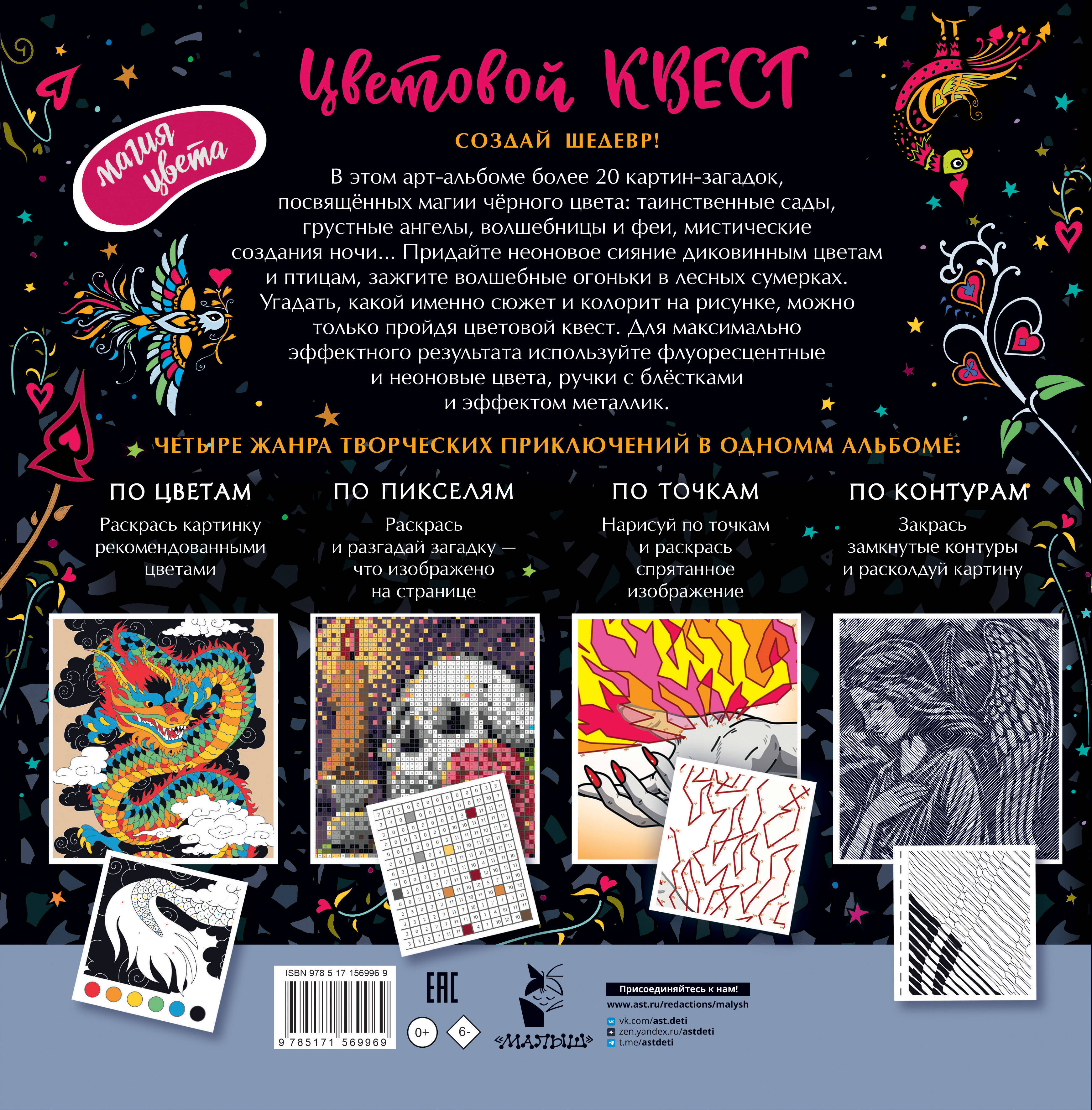 Долгожданная арт-раскраска для детей. Все самые популярные арт-квесты в одном издании. «Цветовой квест» - серия альбомов для креативного раскрашивания. Наконец и у детей появилось издание для увлекательного творческого досуга. В каждой книге объединены и адаптированы для детей жанры любимых арт-квестов для взрослых: раскраски по номерам, по пикселям, по точкам. В этом арт-альбоме более 20 картин-загадок в любимых жанрах: анималистика, пейзаж, натюрморт. Угадать, какой именно сюжет на рисунке можно только пройдя цветовой квест. Разгадайте скрытые картины, наполняя изображения цветом. ТРИ ЖАНРА ТВОРЧЕСКИХ ПРИКЛЮЧЕНИЙ В ОДНОМ АЛЬБОМЕ: - ПО ПИКСЕЛЯМ - Раскрась и разгадай загадку - что изображено на странице - ПО НОМЕРАМ - Раскрась картинку сочными контрастными цветами цветовой палитры - ПО ТОЧКАМ - Нарисуй по точкам и раскрась спрятанное изображение.| Издательство | Издательство "АСТ" |