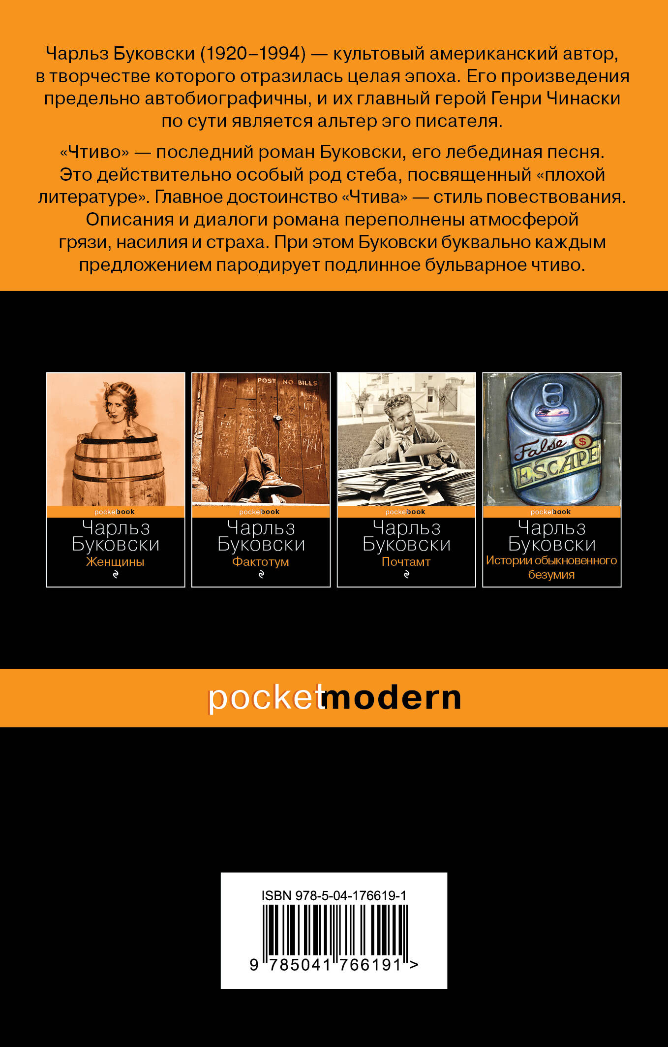 «Чтиво» - последний роман Буковски, его лебединая песня - читателям без чувства юмора просто противопоказана! Это действительно особый род стёба, посвященный «плохой литературе». Сам сюжет книги лишен динамики, лишен интриги, лишен всего, но именно поэтому бесконечно гениален. Главное достоинство романа - стиль повествования. Описания и диалоги переполнены атмосферой грязи, насилия и страха. При этом Буковски буквально каждым предложением пародирует подлинное бульварное чтиво. И хотя авторский стиль упрощен донельзя - хочется отметить потрясающее чувство юмора, которое обязательно придется по вкусу читателям, этим чувством обладающим.| Издательство | ООО "Издательство "Эксмо" |